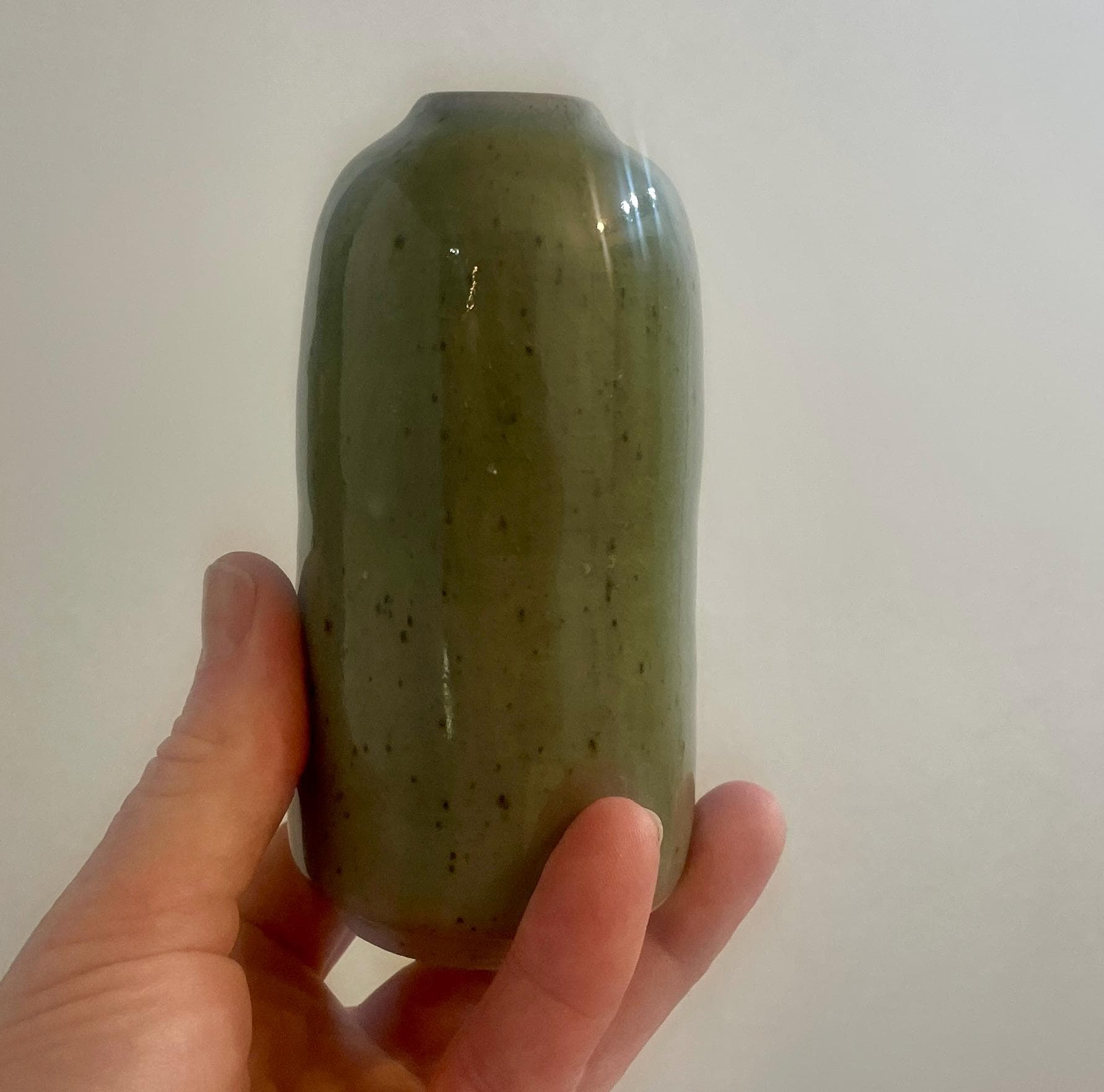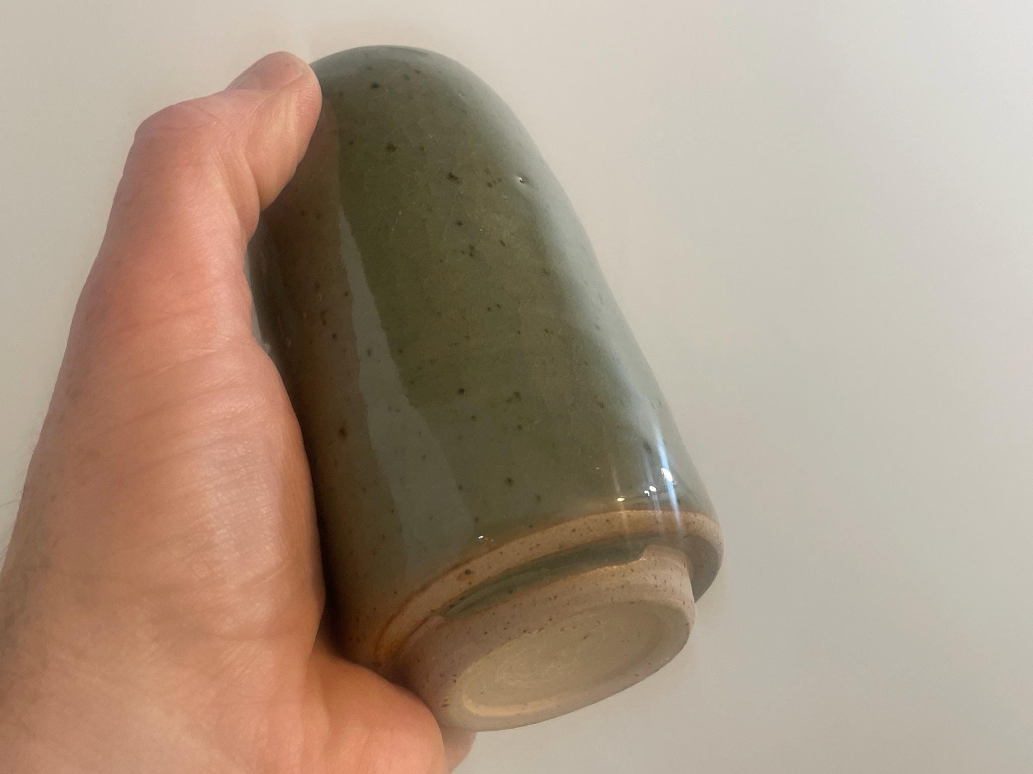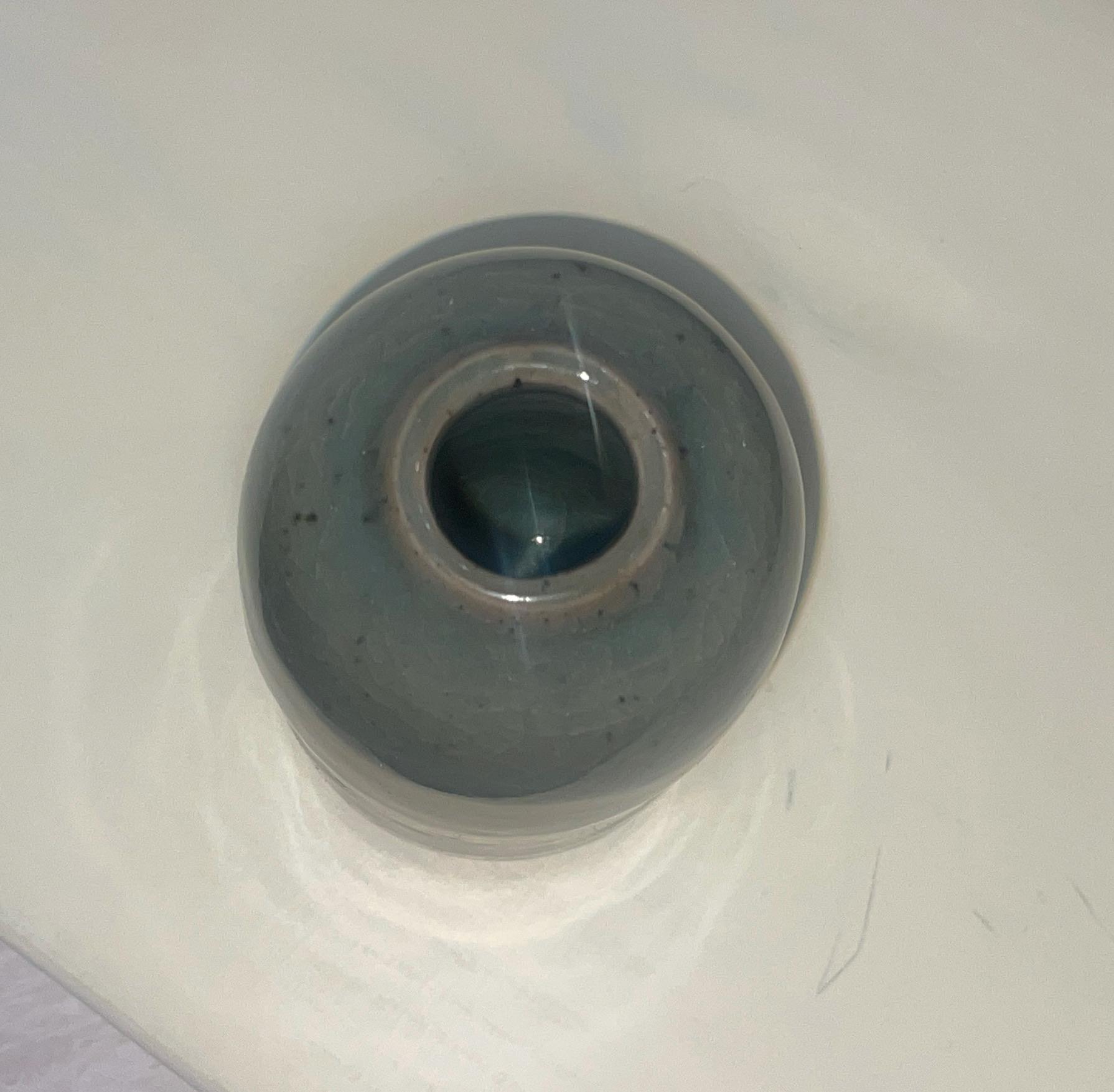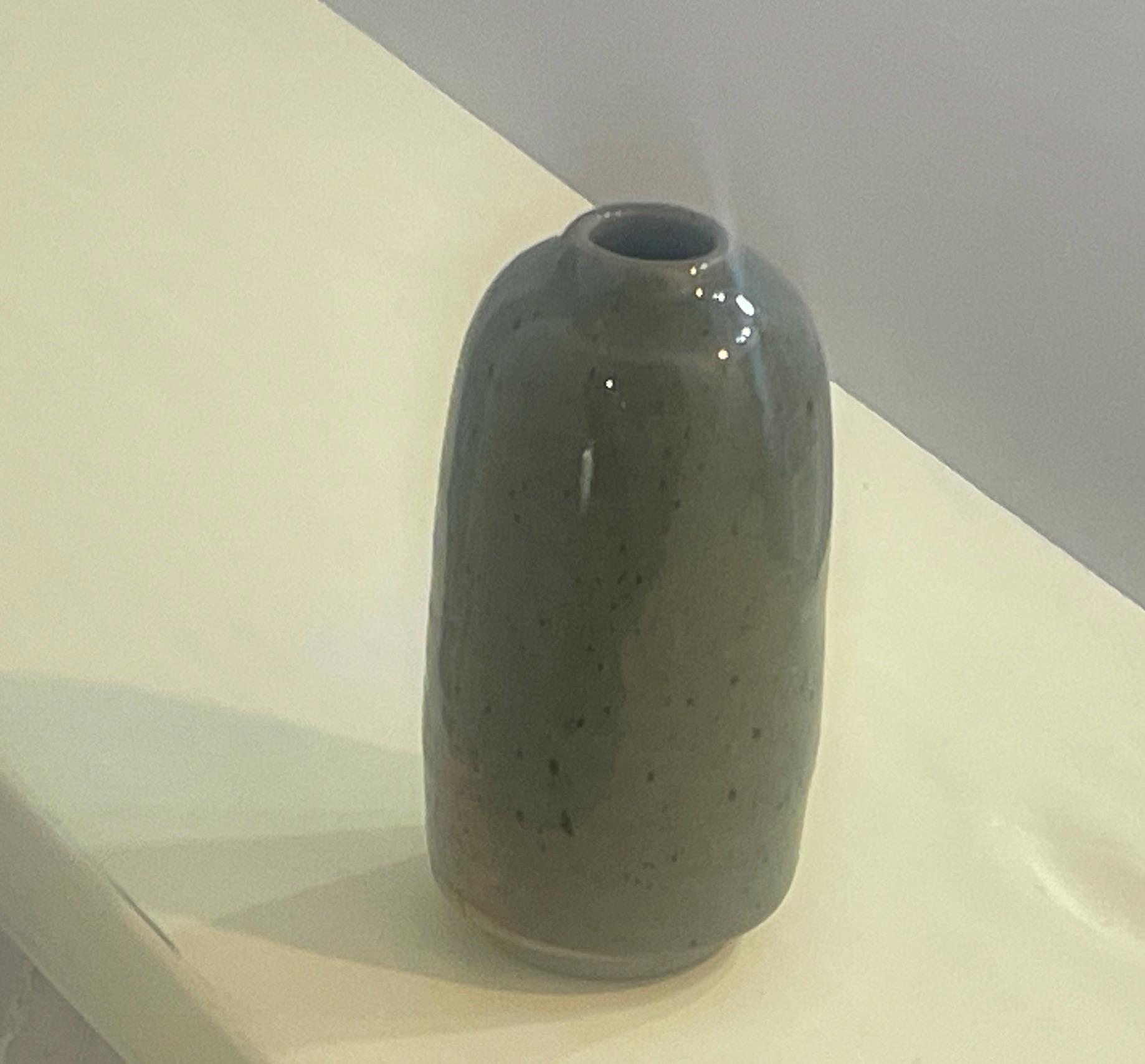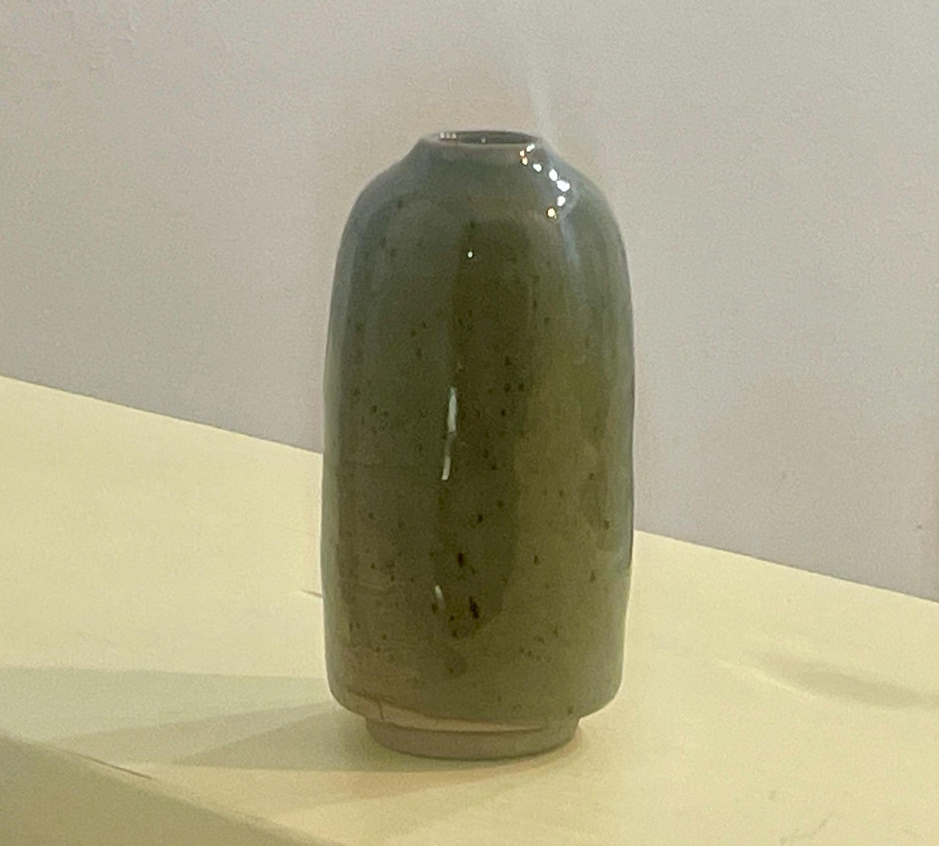Form & Dimensions: The vase presents a refined, minimalist silhouette, measuring 7 inches in height with a slender 2-inch diameter. Its form suggests a direct influence from Japanese or other East Asian ceramic aesthetics, particularly the clean, continuous line and understated elegance often seen in Mingei (folk craft) or Ikebana vessels.