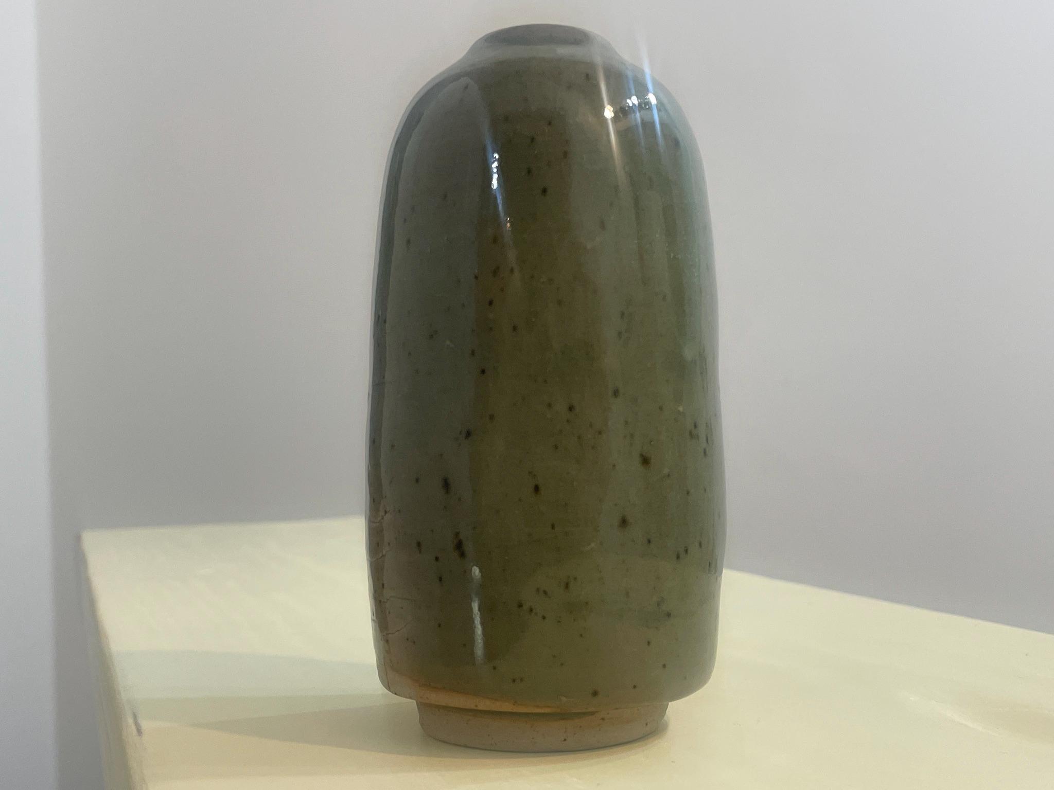 An exquisite and unique piece of studio pottery, this bud vase is a masterful blend of global form and regional glazing tradition.