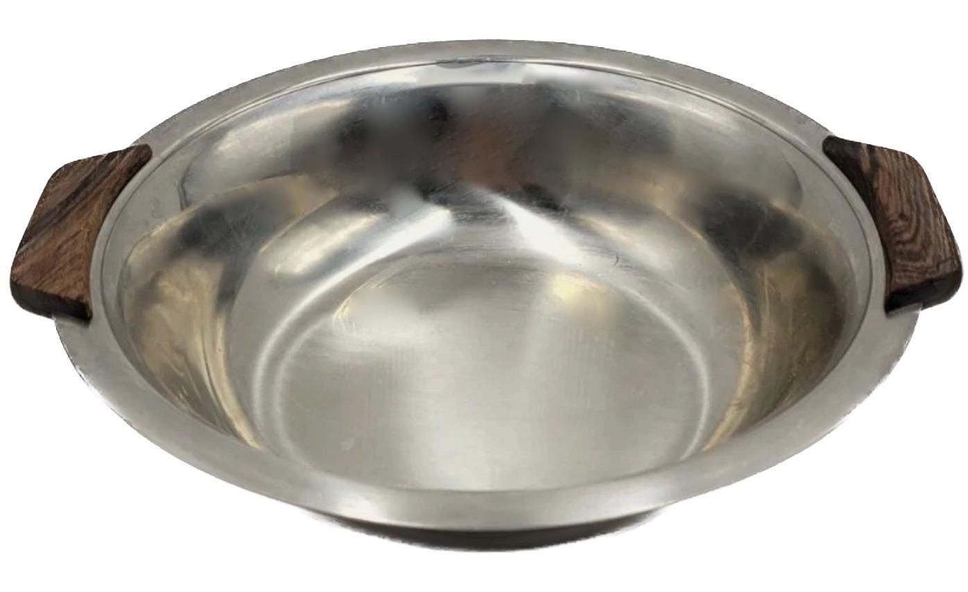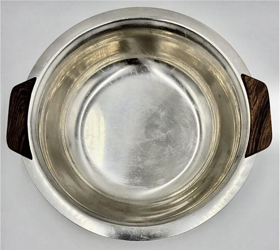 The bowl features a smooth, satin-finished stainless steel body, creating a timeless, minimalist silhouette. The cool, reflective metal is beautifully contrasted by two sleek dark walnut wood handles, which not only provide easy carrying but introduce a warm, organic element crucial to the Scandinavian Modern style. The juxtaposition of the modern steel and the rich, dark wood is instantly recognizable as high-quality vintage design.