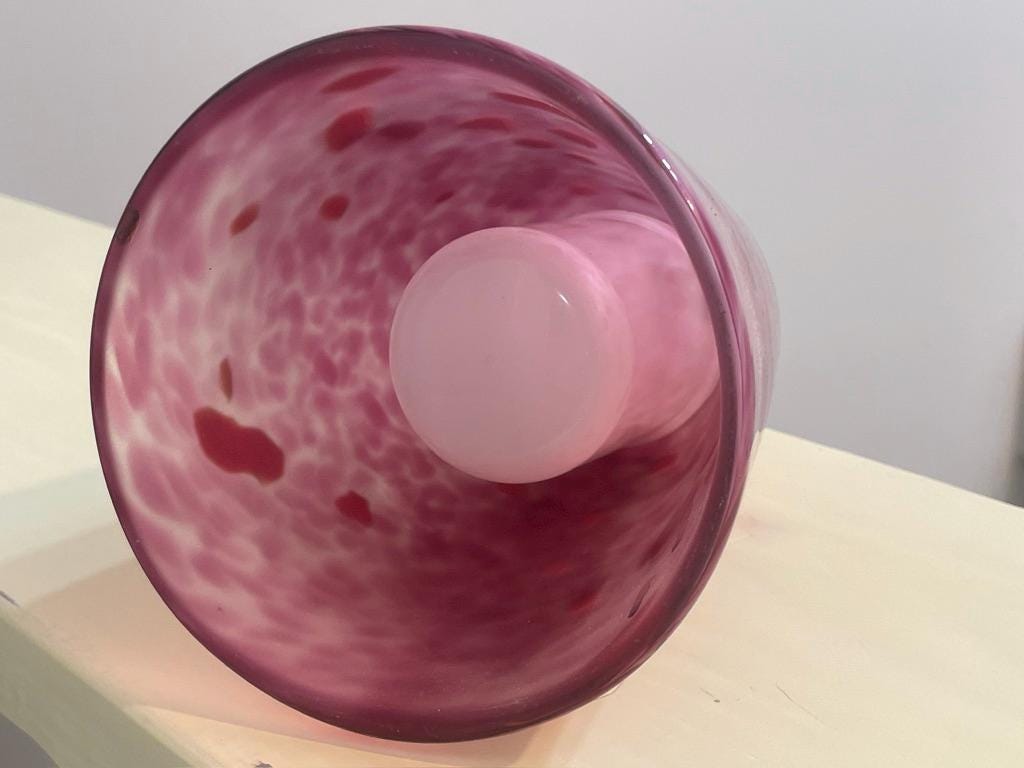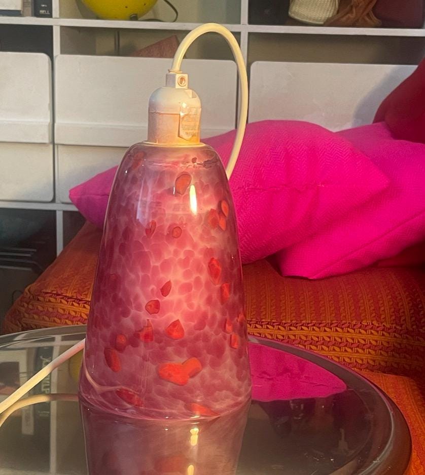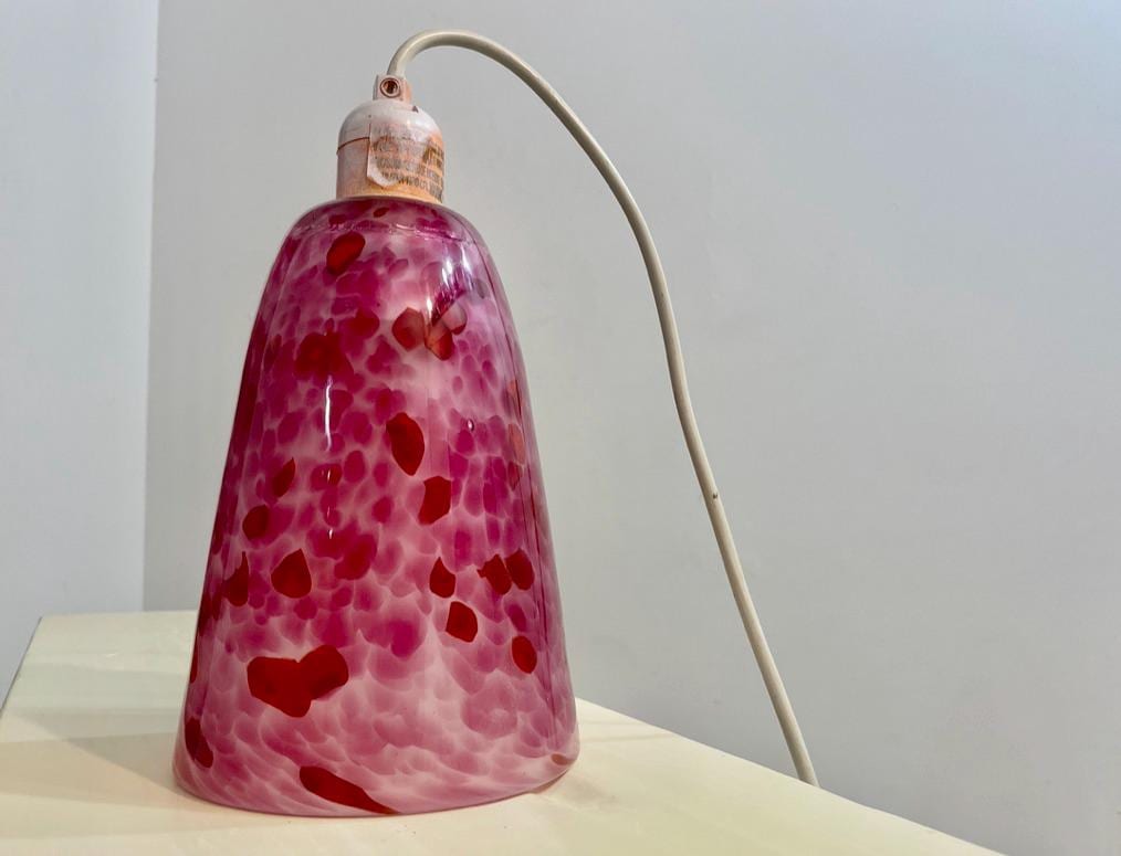 The glass shade features a distinctive, quintessentially Murano aesthetic. The bell-shaped form is alive with a vibrant speckled pattern (a technique possibly known as avventurina or millefiori when highly granular) in rich shades of pink and red. This vibrant color palette, particularly the pink/red combination, is highly sought after by collectors and creates a warm, luminous glow when illuminated.