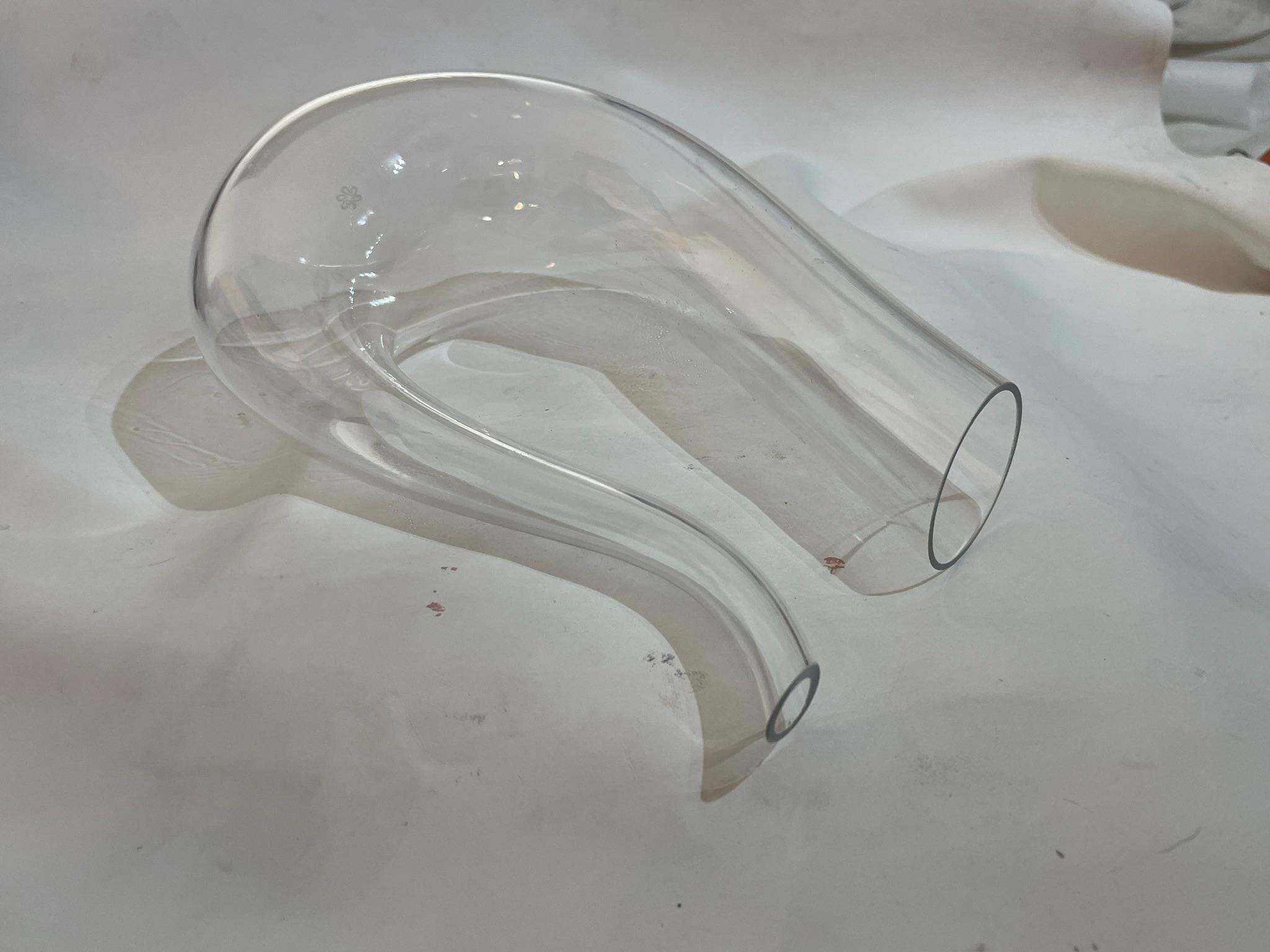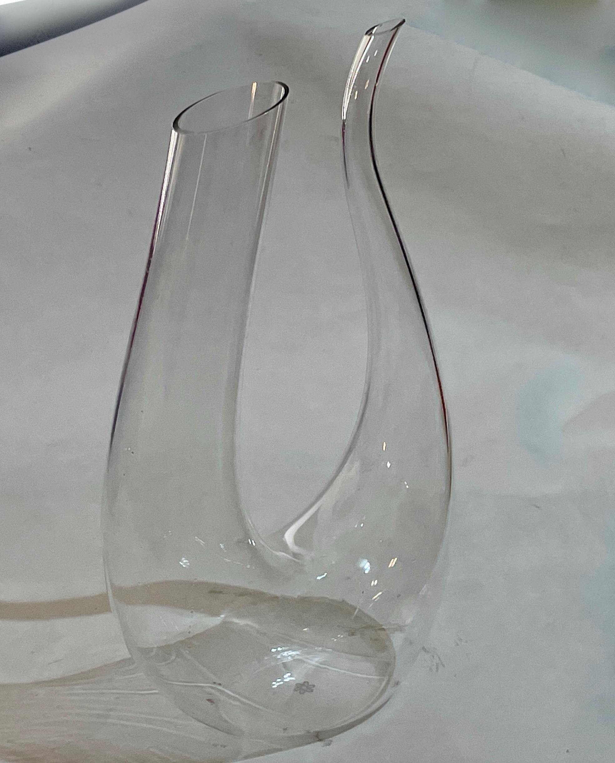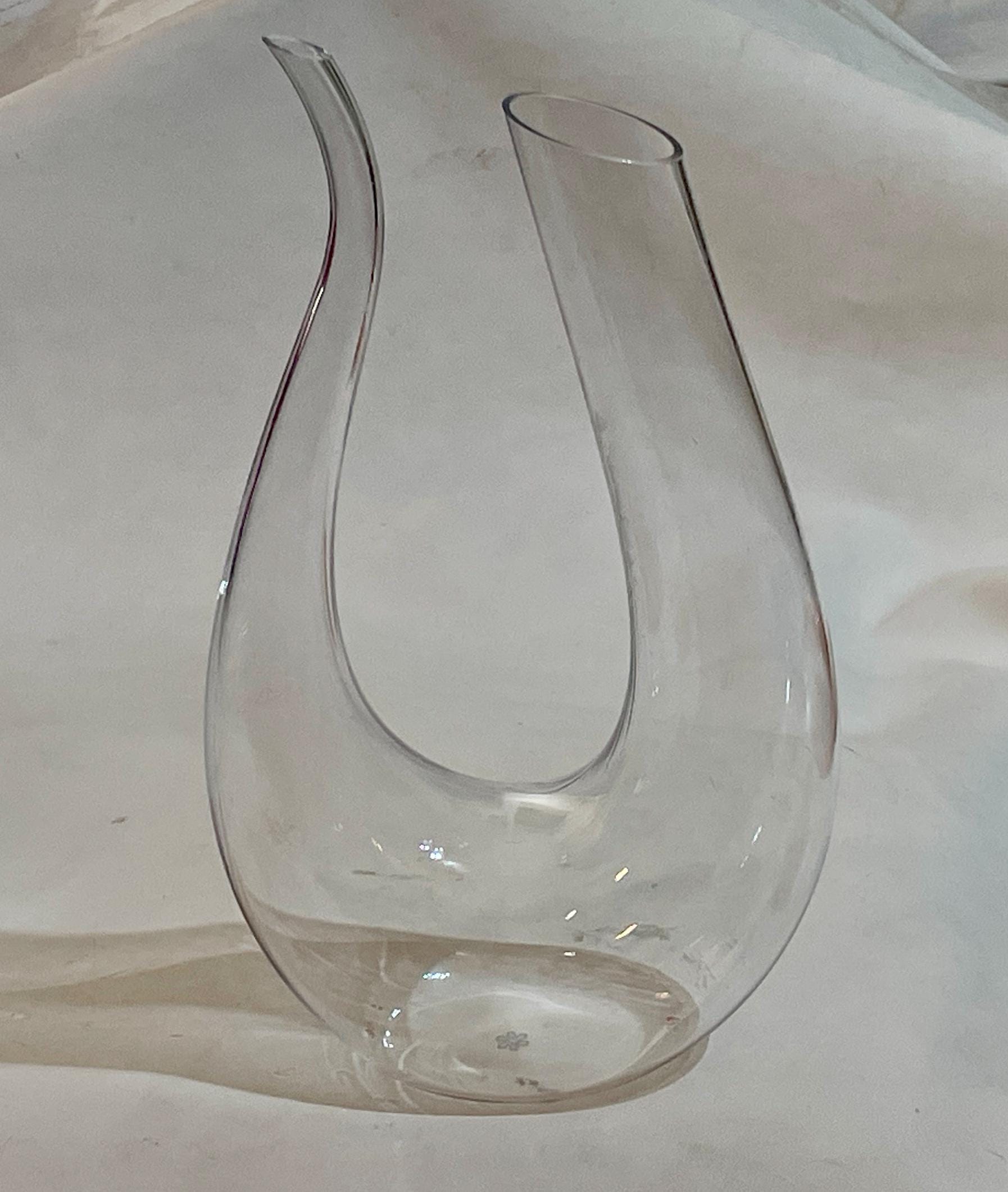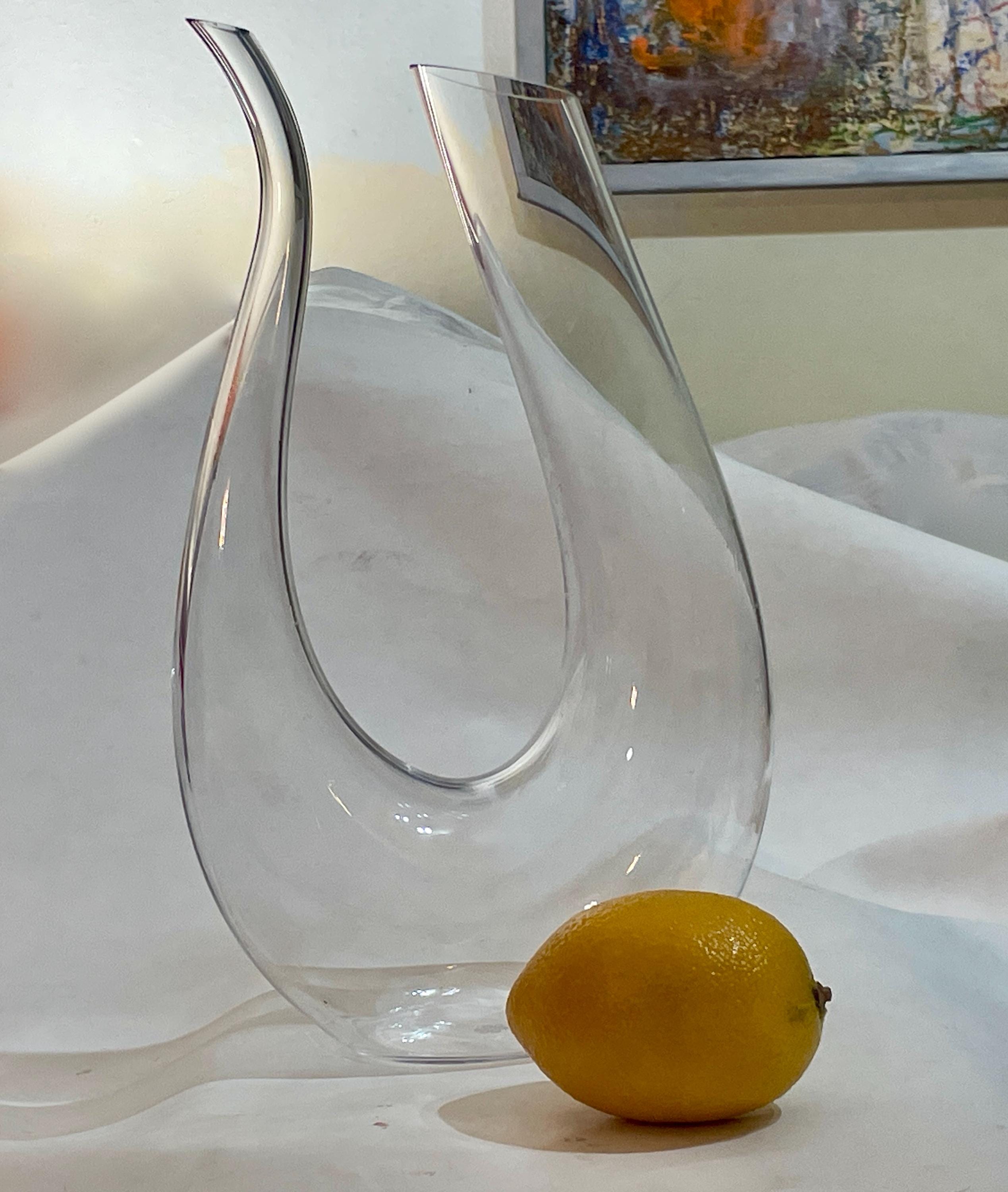 The dramatic, sweeping curve of the glass transforms the decanting process into a visual event, making it an essential centerpiece for any sophisticated home bar, dining table, or Mid-Century Modern collection.