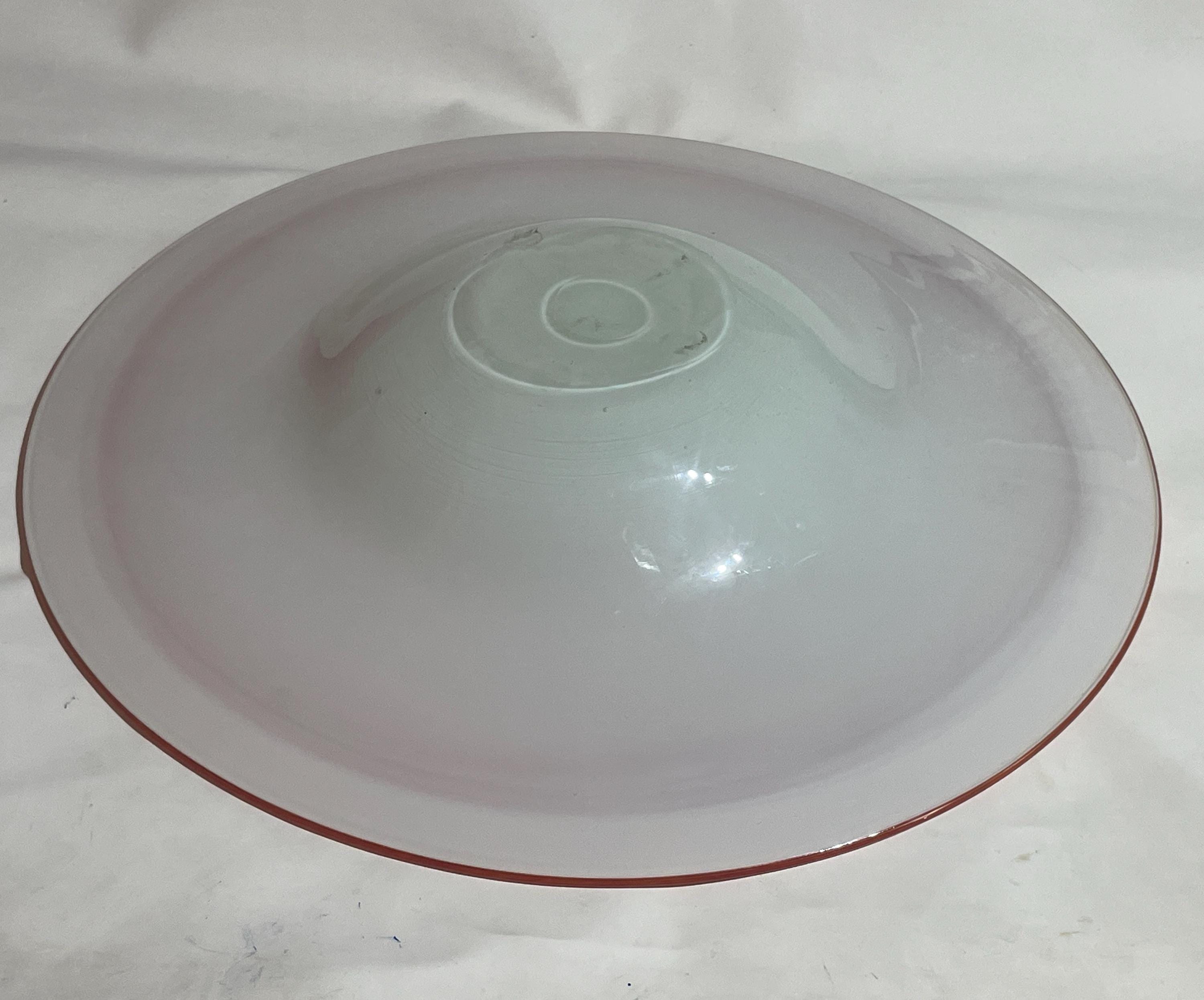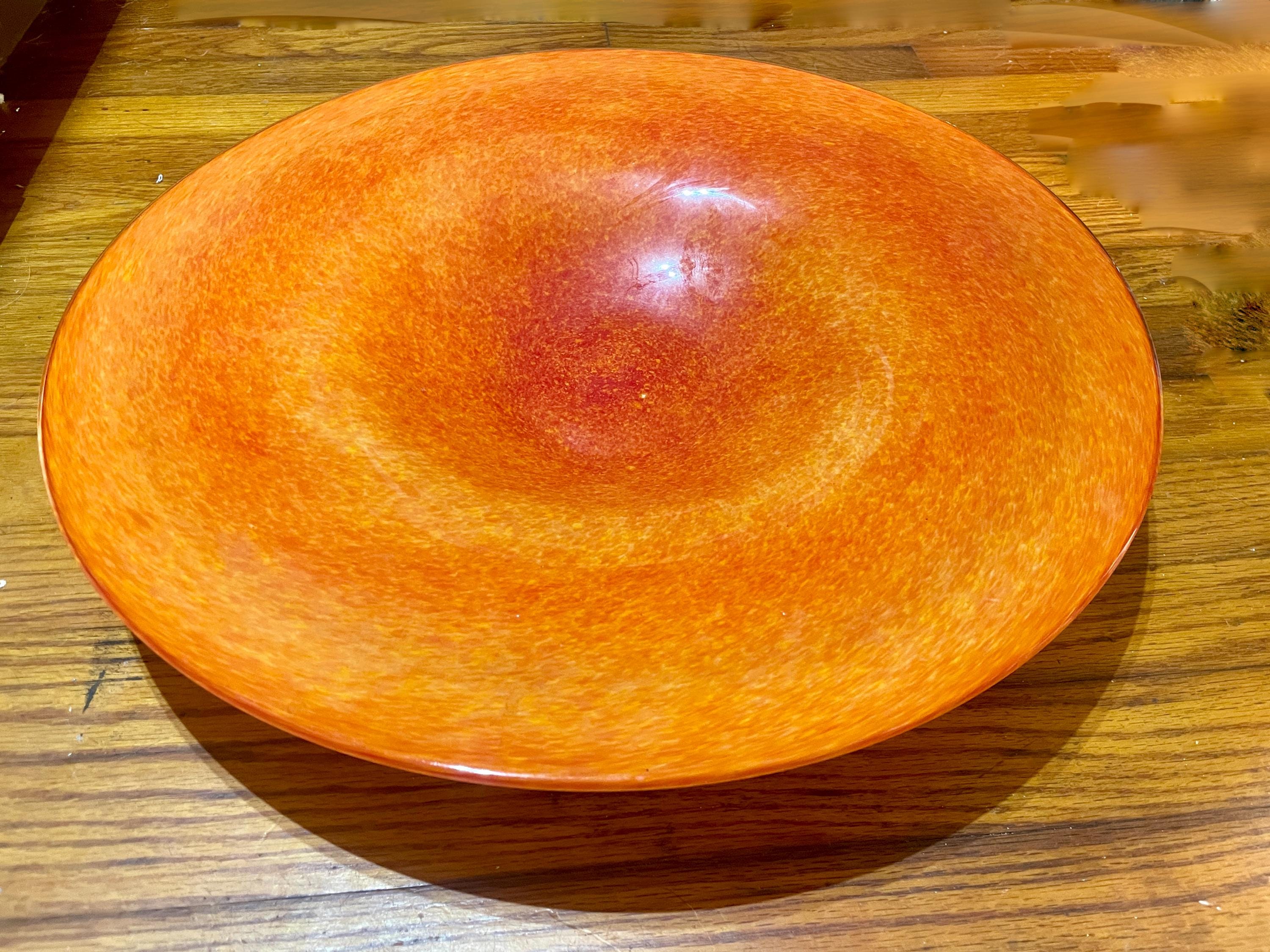 A truly monumental and visually arresting piece of vintage art glass. This magnificent bowl makes an immediate statement with its sheer scale, fiery colors, and substantial, high-quality construction.