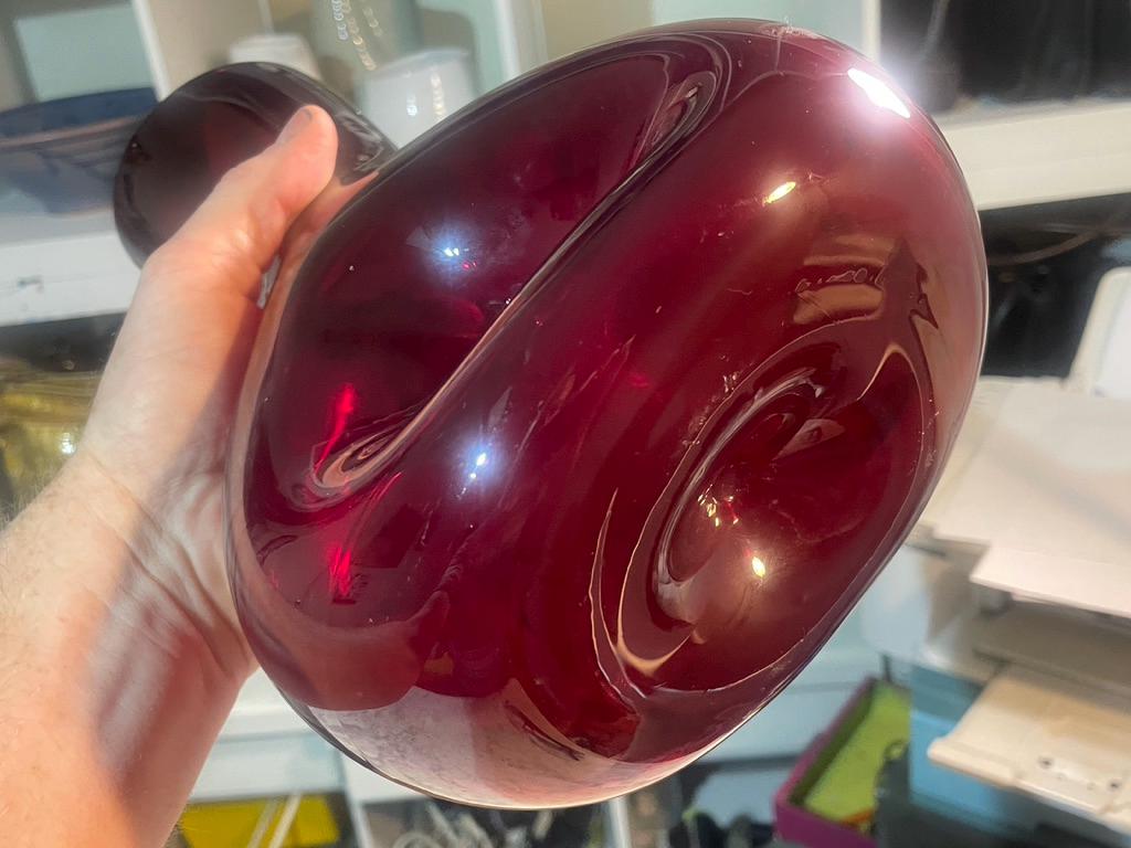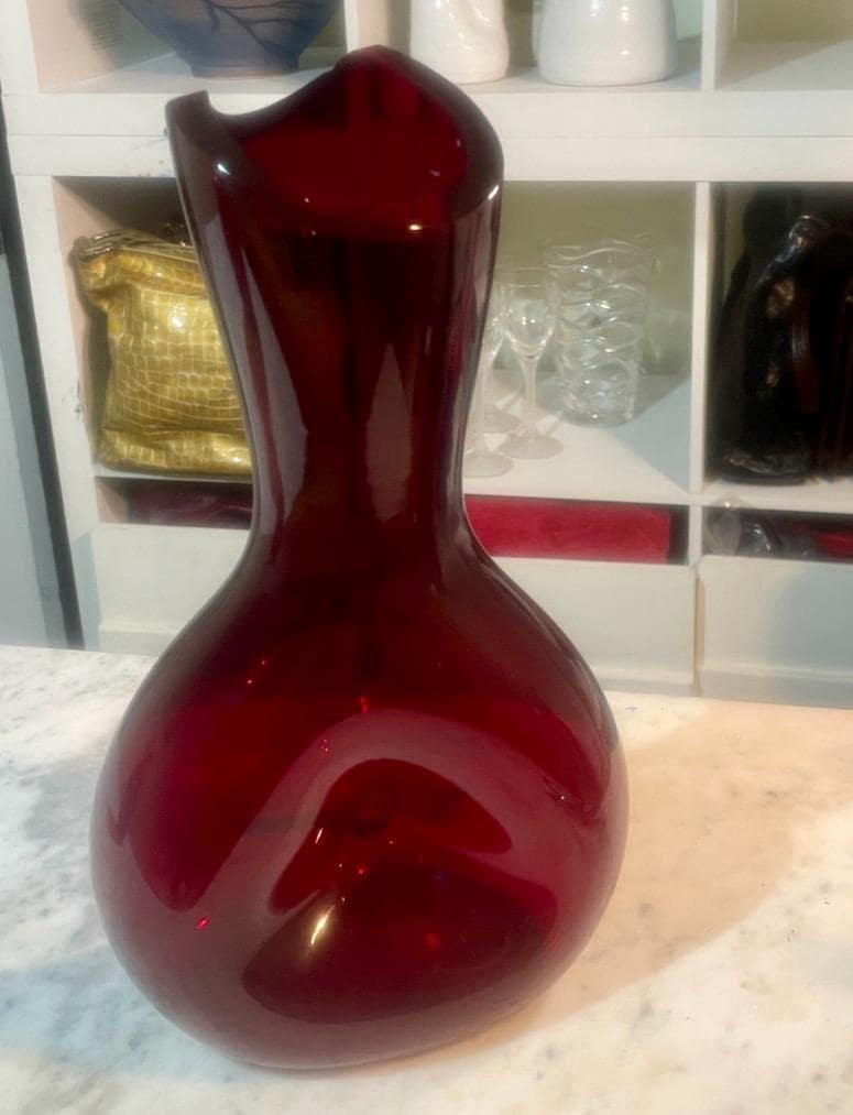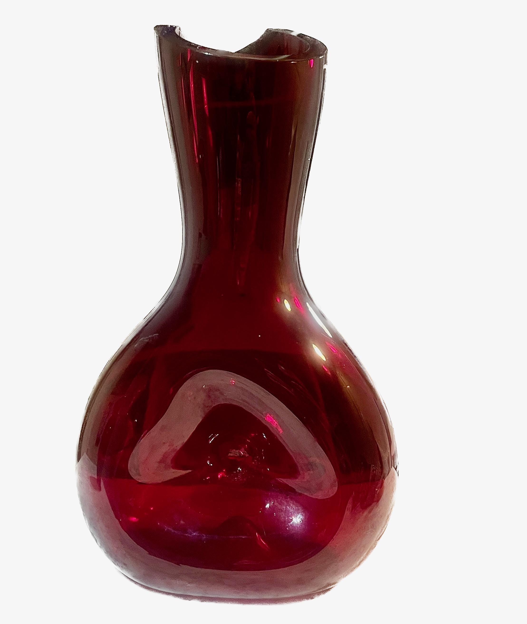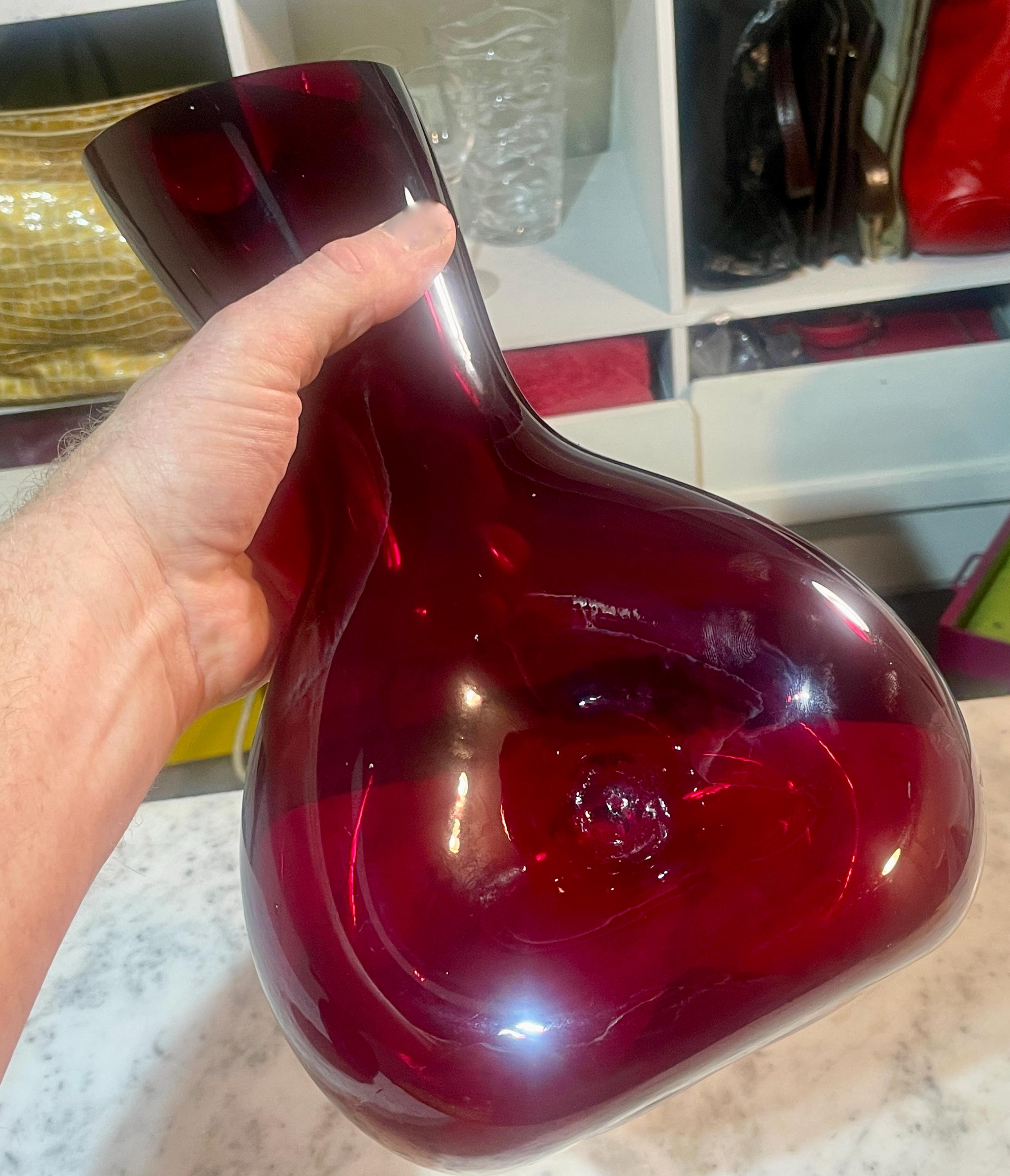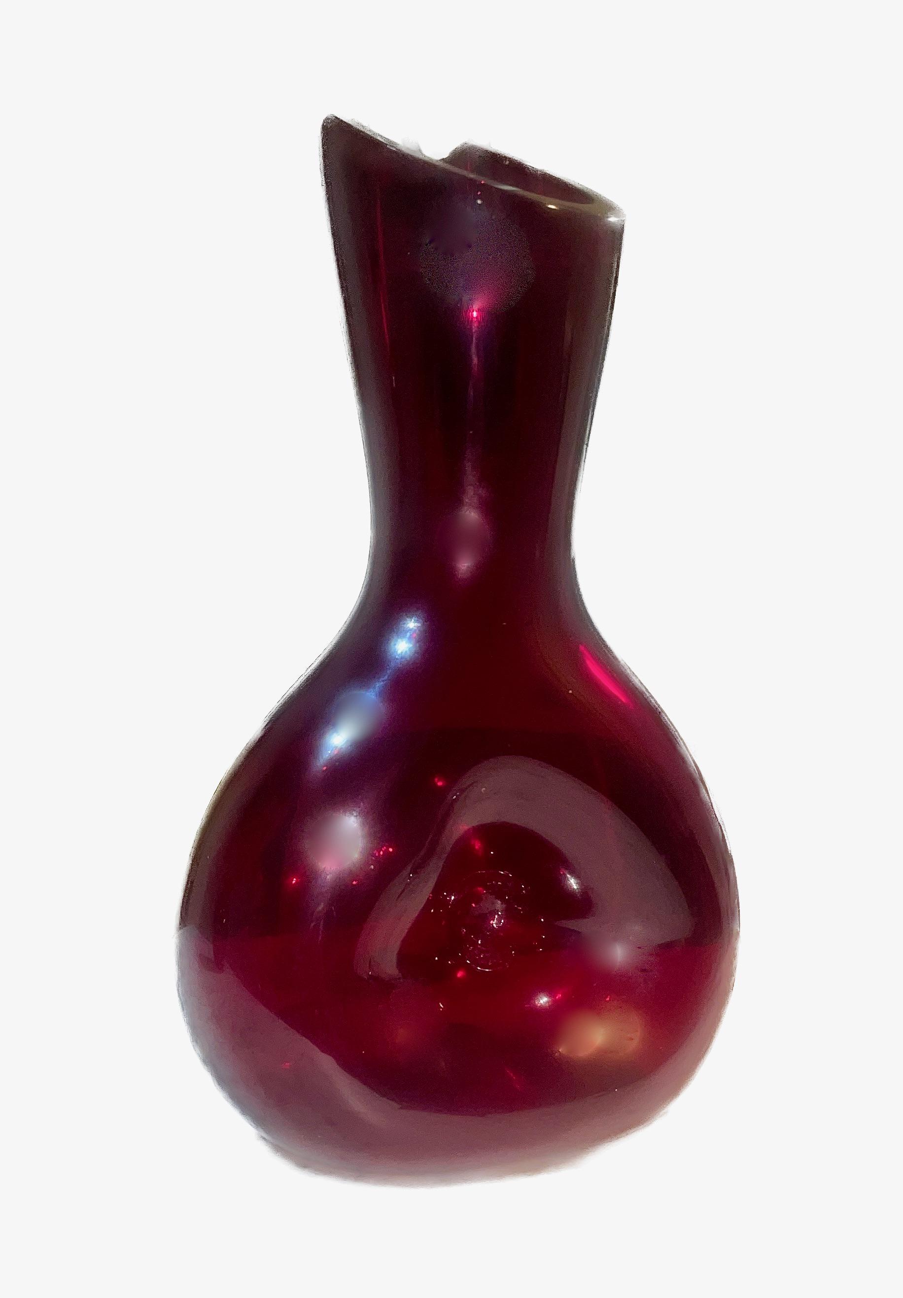 Color and Casing: The glass is a deep, luminous ruby red with exceptional saturation. It is a piece of cased glass, meaning the vibrant color layer is expertly applied over a clear or opaque interior layer, giving the vase a remarkable depth and glow when viewed in light.