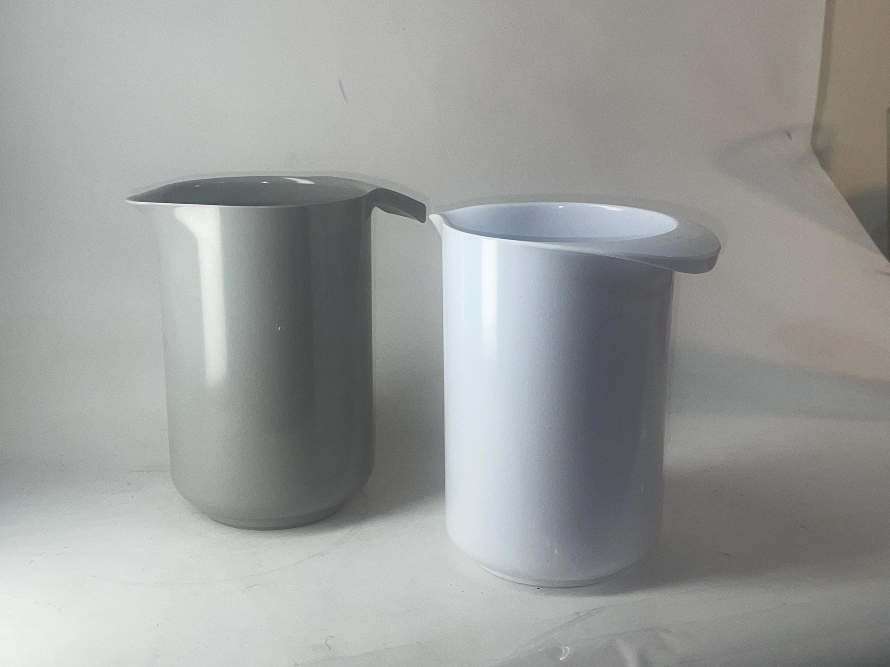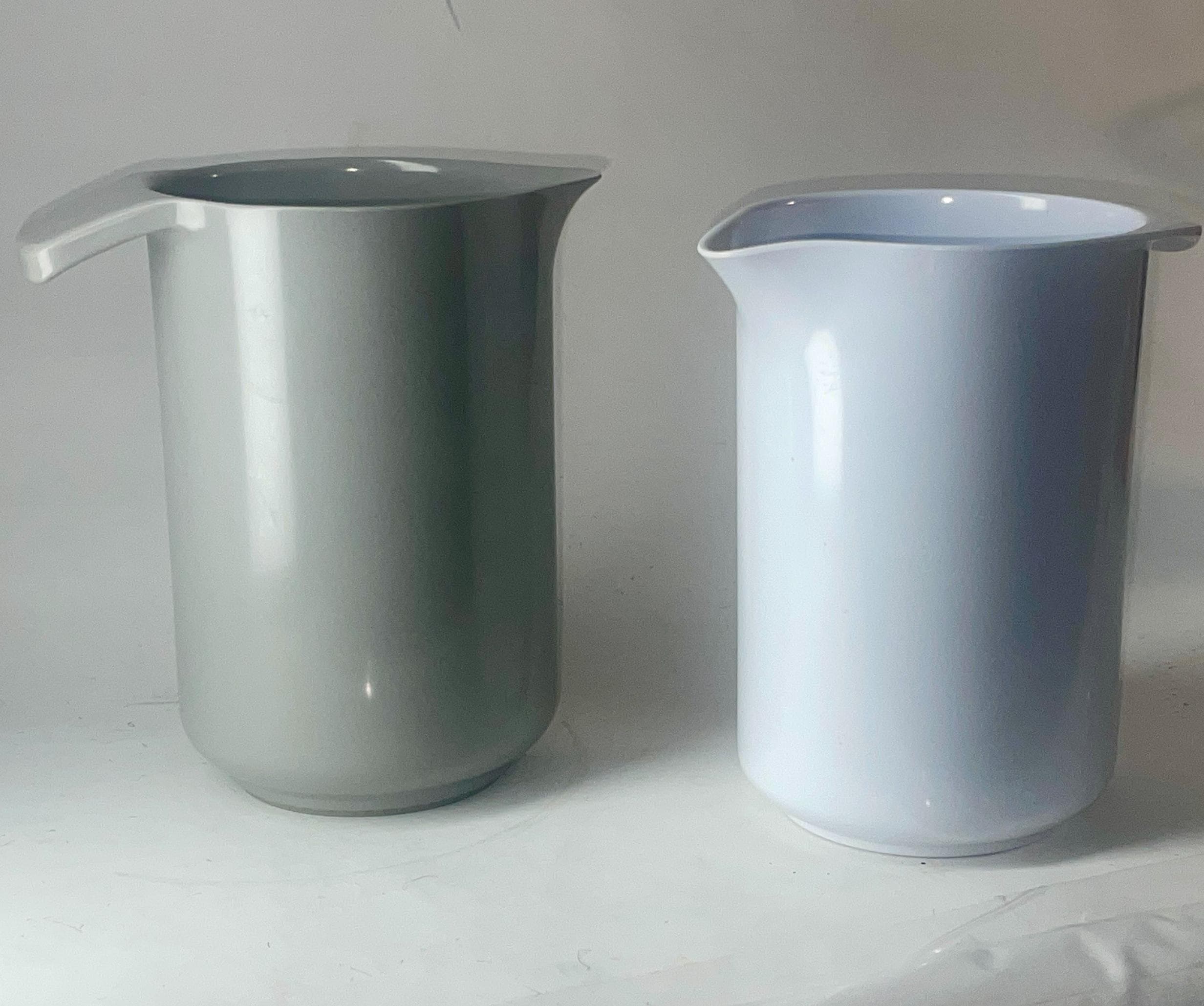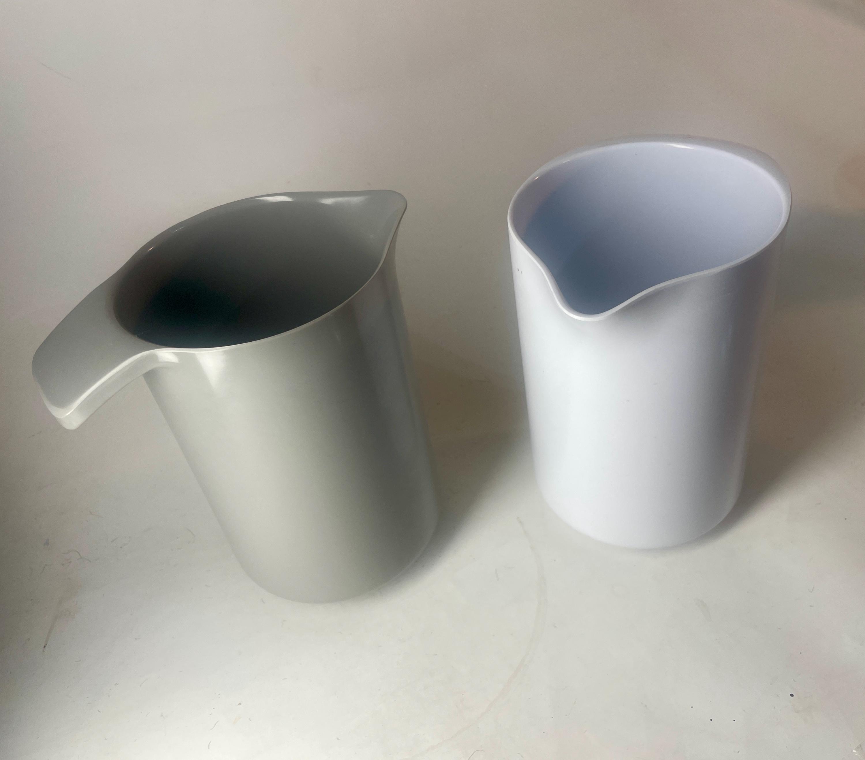 Identical Form: Both pitchers feature the timeless, smooth, cylindrical body, comfortable handle, and precise pouring spout characteristic of high-end melamine jugs from the 1970s.