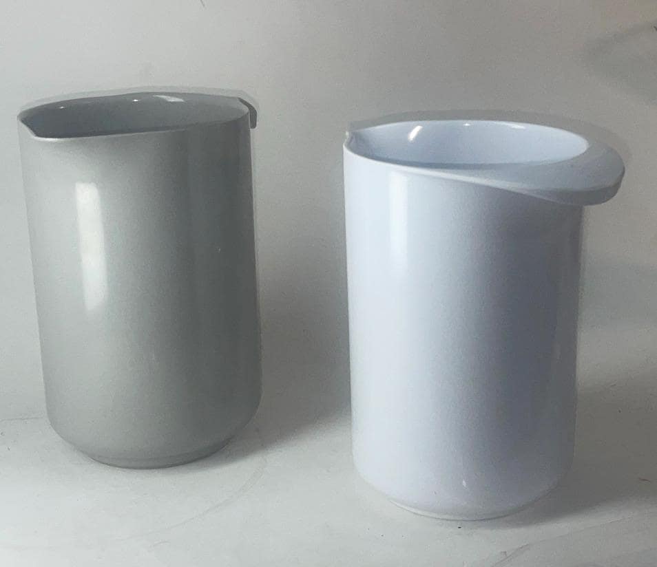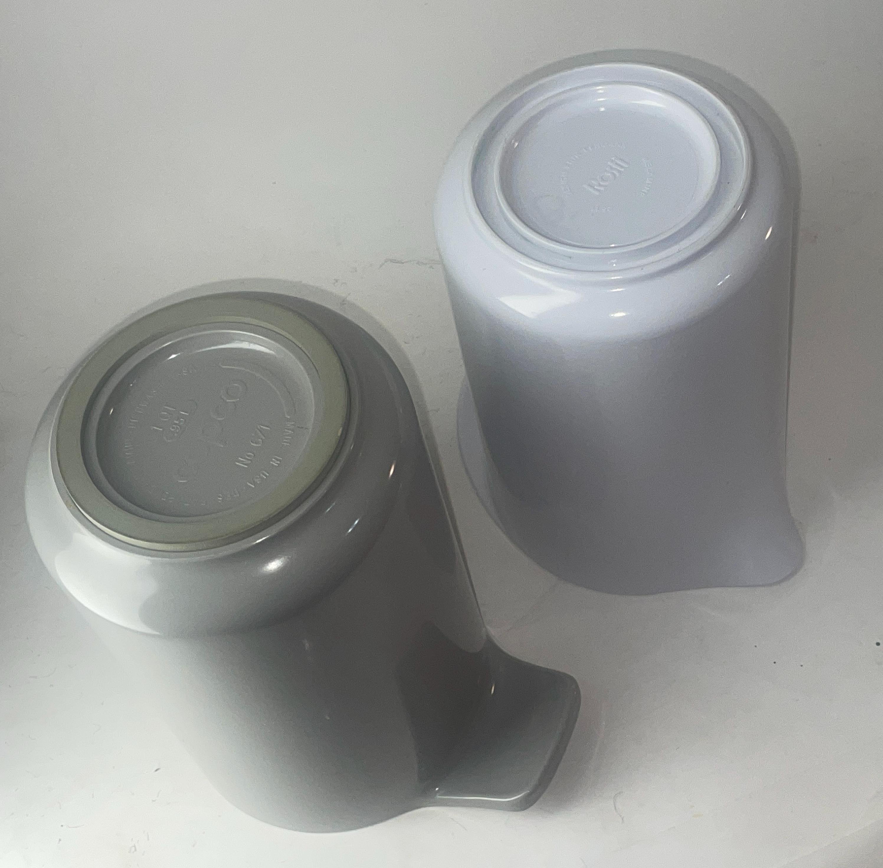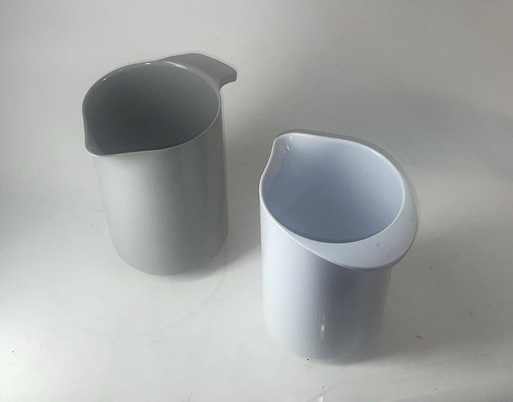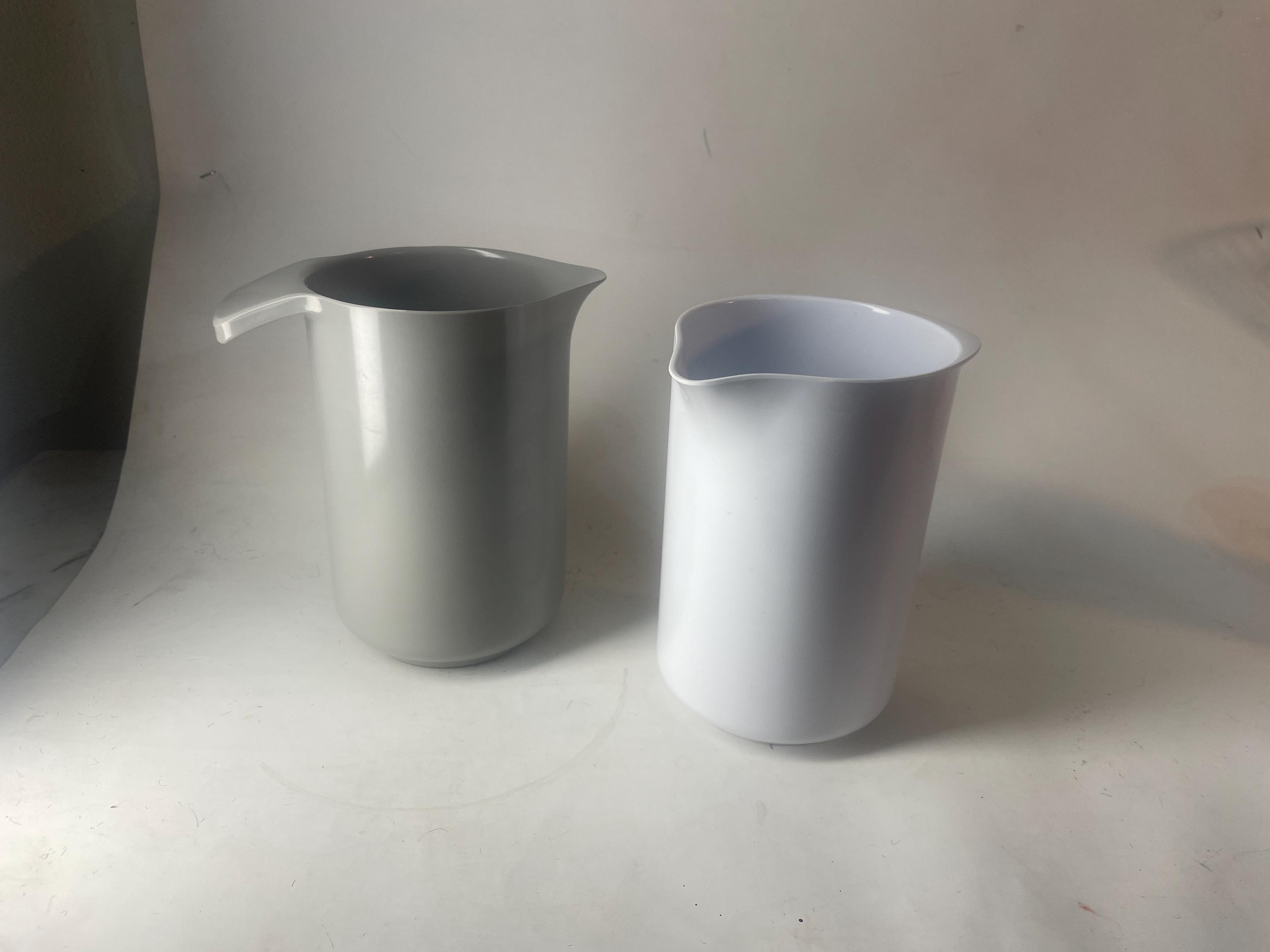 Identical Form: Both pitchers feature the timeless, smooth, cylindrical body, comfortable handle, and precise pouring spout characteristic of high-end melamine jugs from the 1970s.