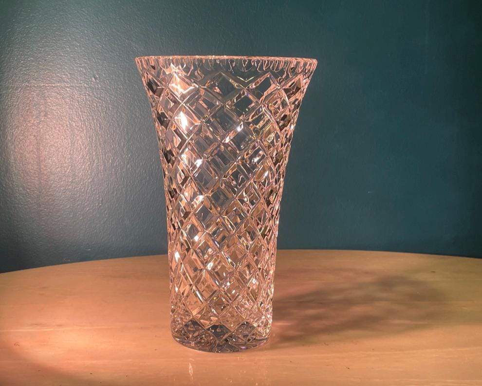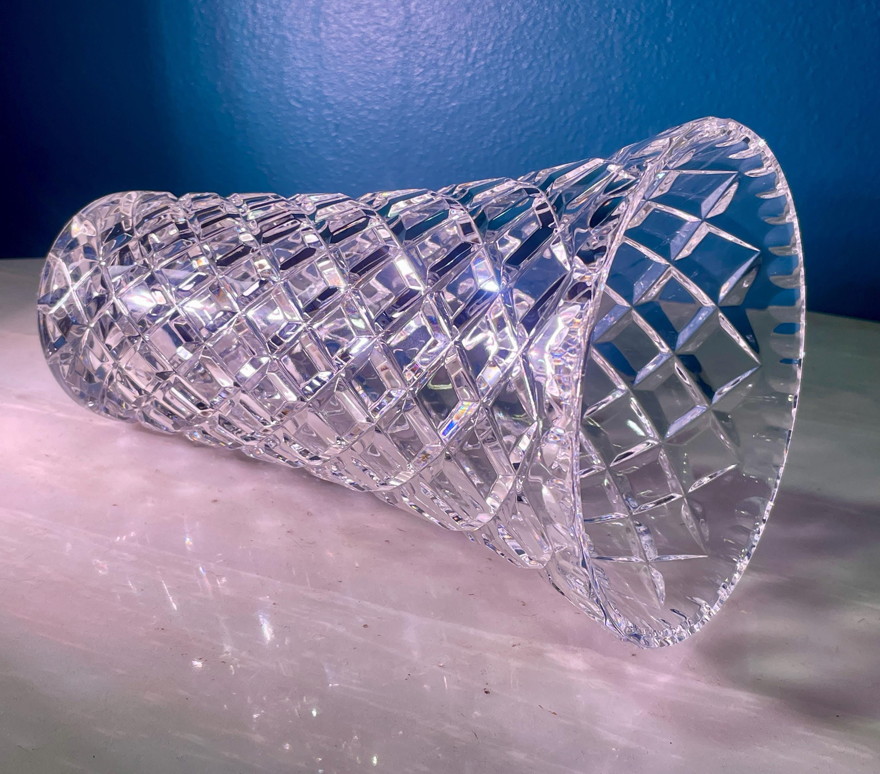 Standing at an impressive 11 inches tall, this vase is a substantial and classic example of brilliant-cut glassware, perfect for dramatic floral arrangements or as a sparkling centerpiece on its own.