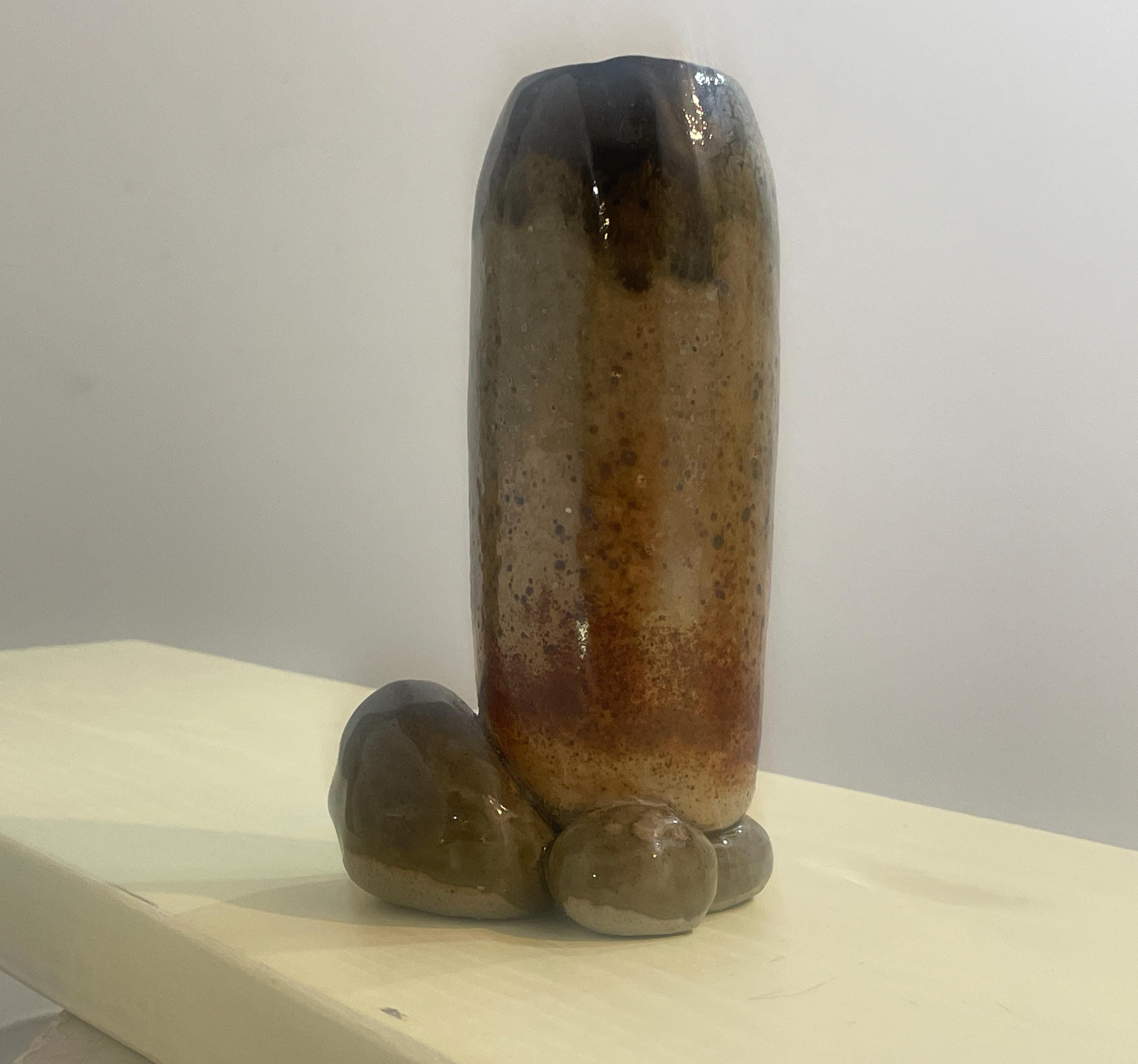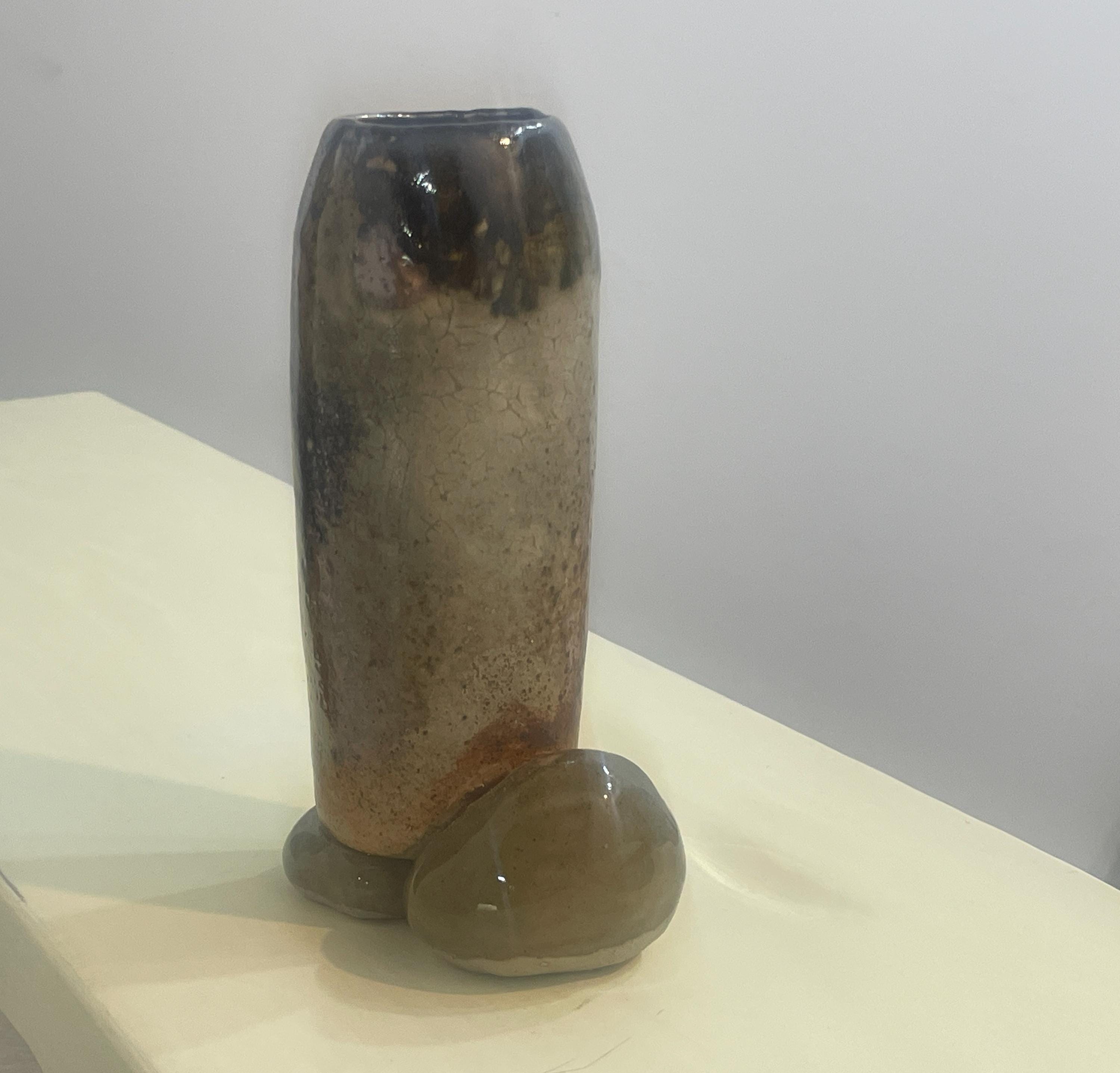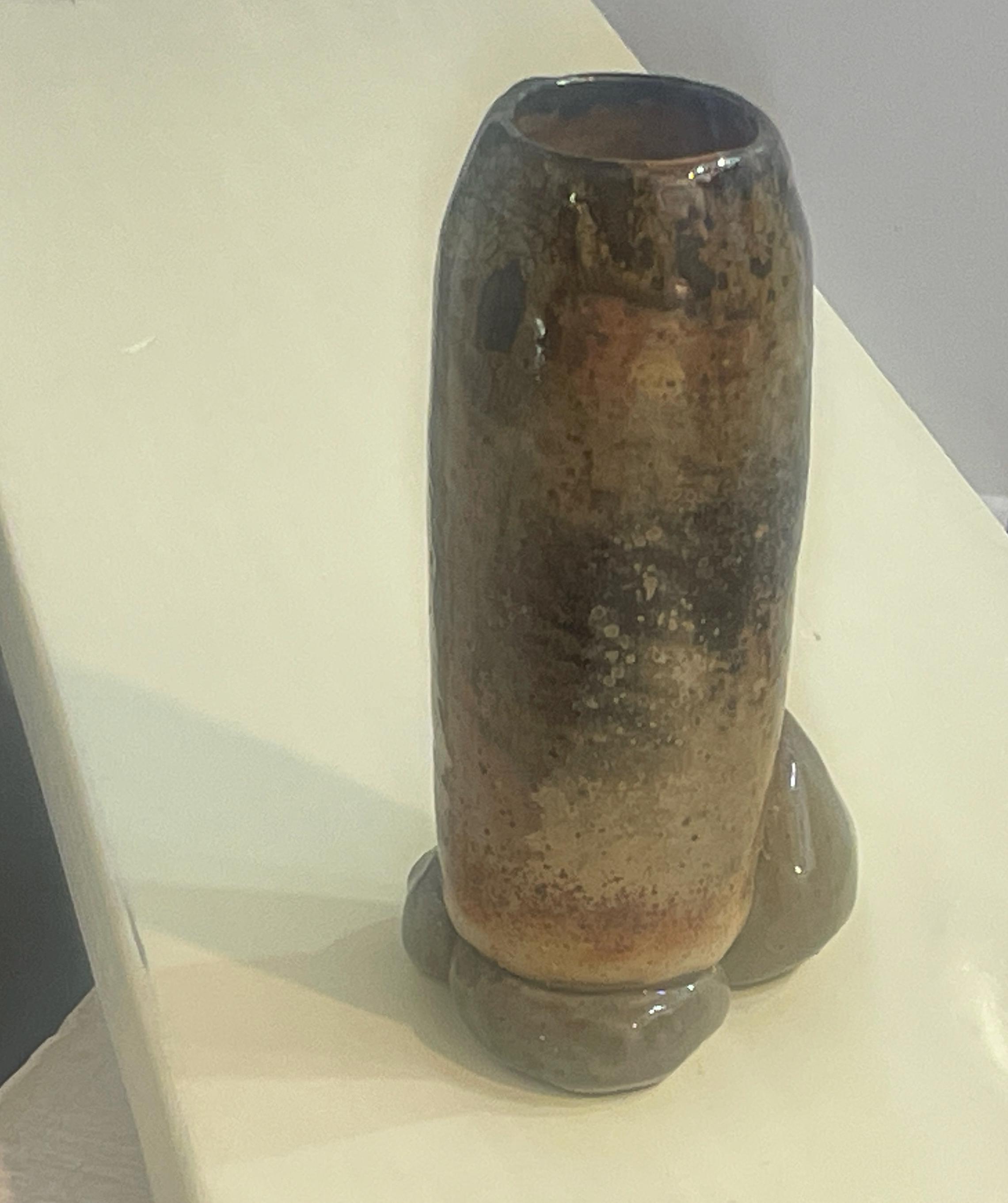 This stoneware vase features a unique, organic form with a textured, mottled glaze. The piece is characterized by its earthy tones and a rustic finish. It has a tall, cylindrical body that rests on a rounded base, creating a balanced and sculptural silhouette. The natural variations in the glaze give it a handcrafted, artisan feel.