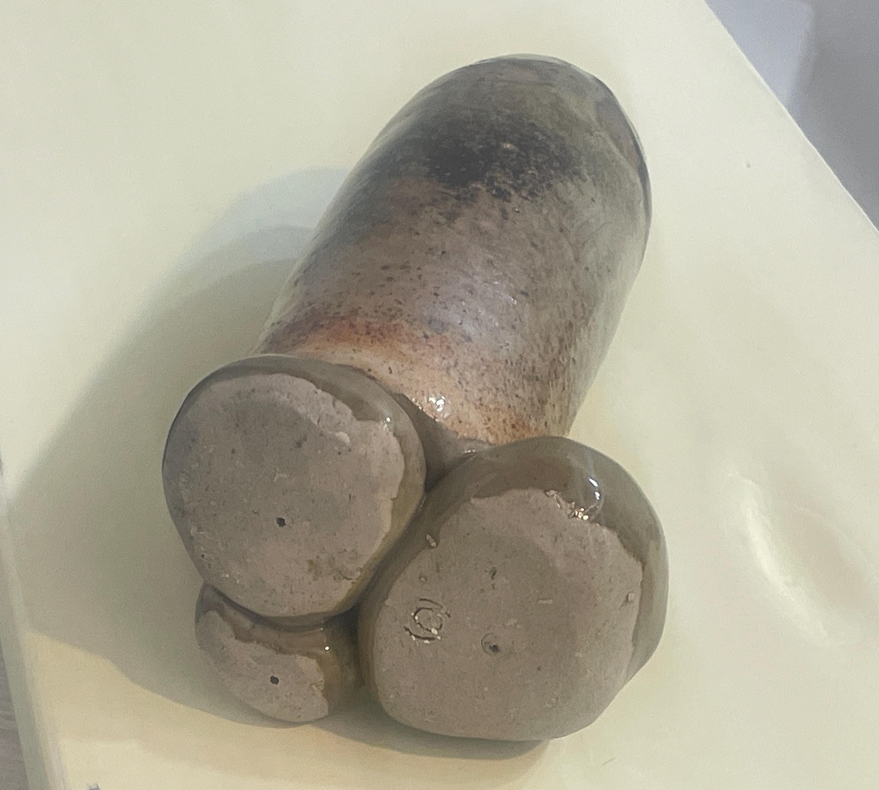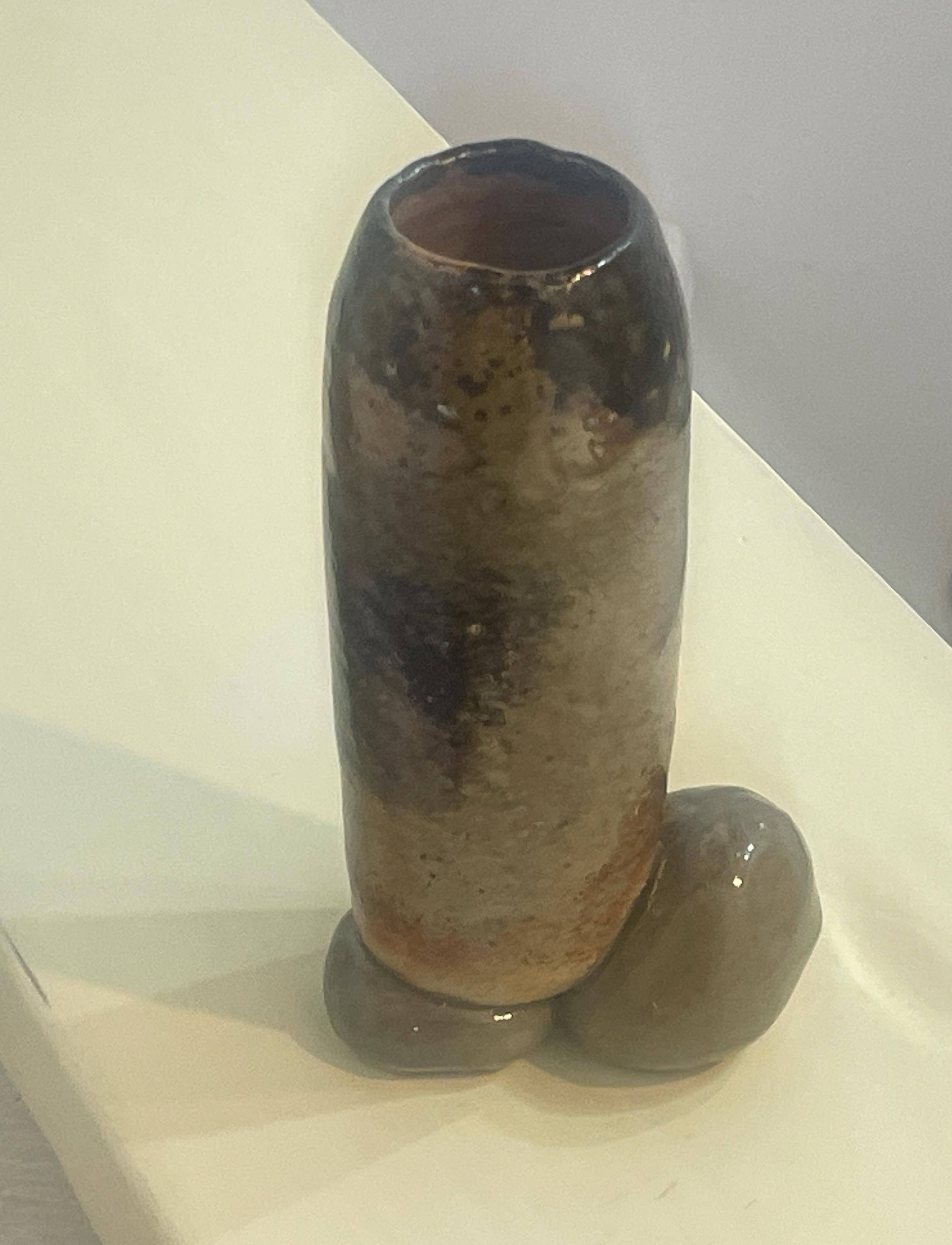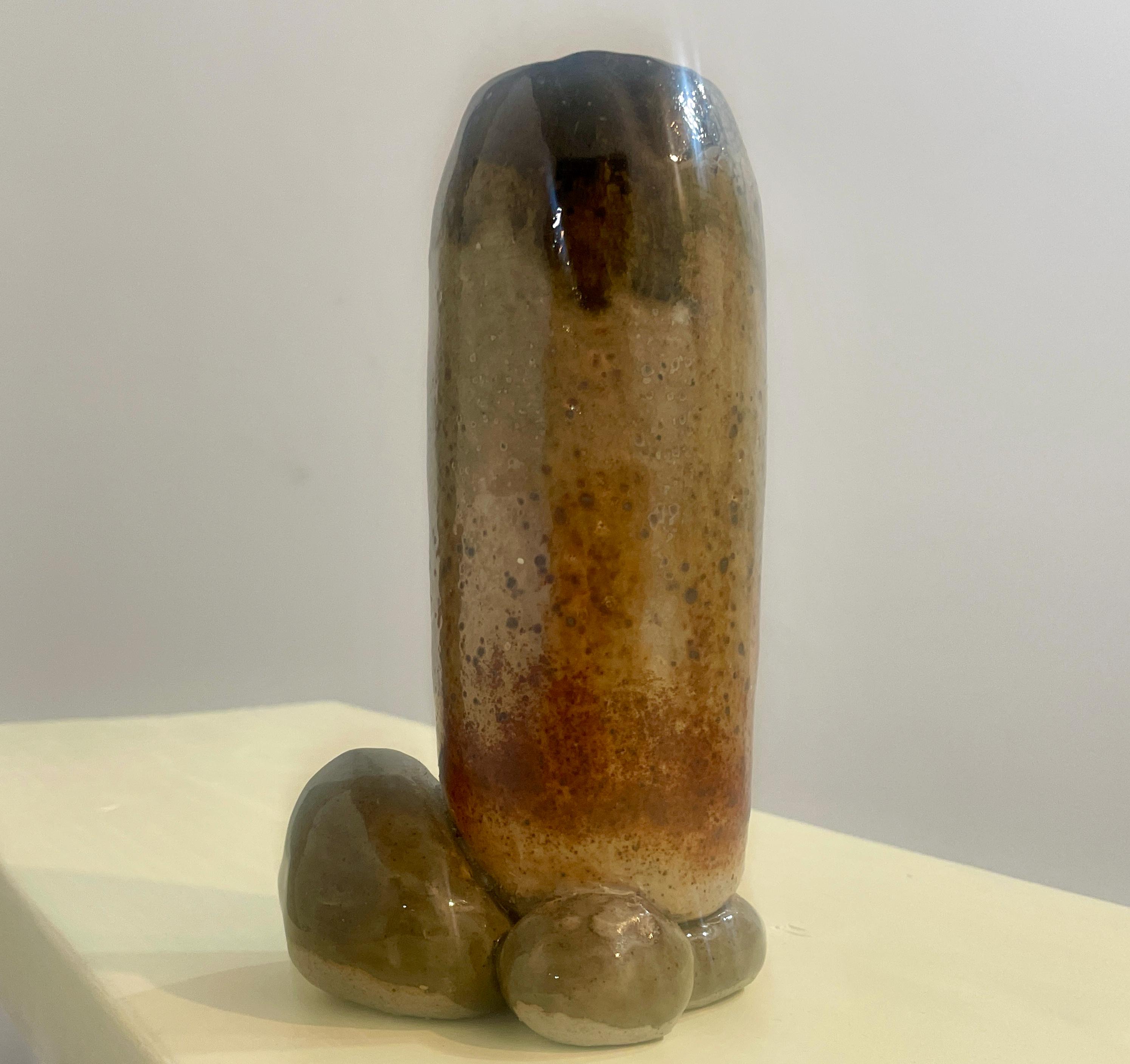 This stoneware vase features a unique, organic form with a textured, mottled glaze. The piece is characterized by its earthy tones and a rustic finish. It has a tall, cylindrical body that rests on a rounded base, creating a balanced and sculptural silhouette. The natural variations in the glaze give it a handcrafted, artisan feel.