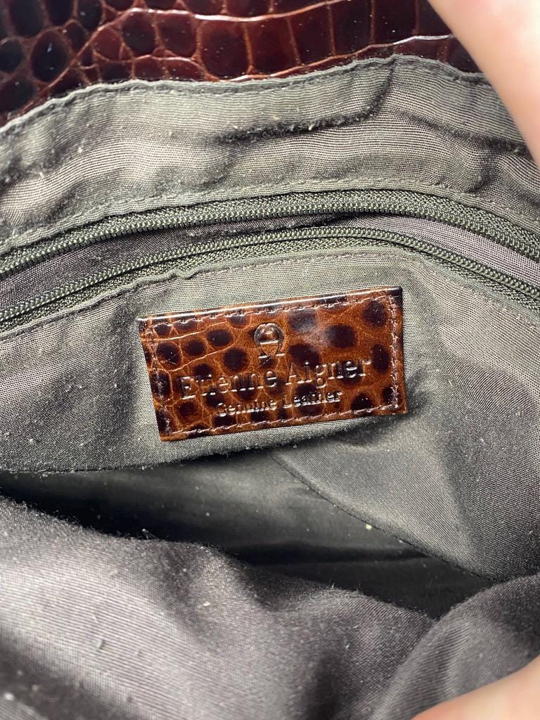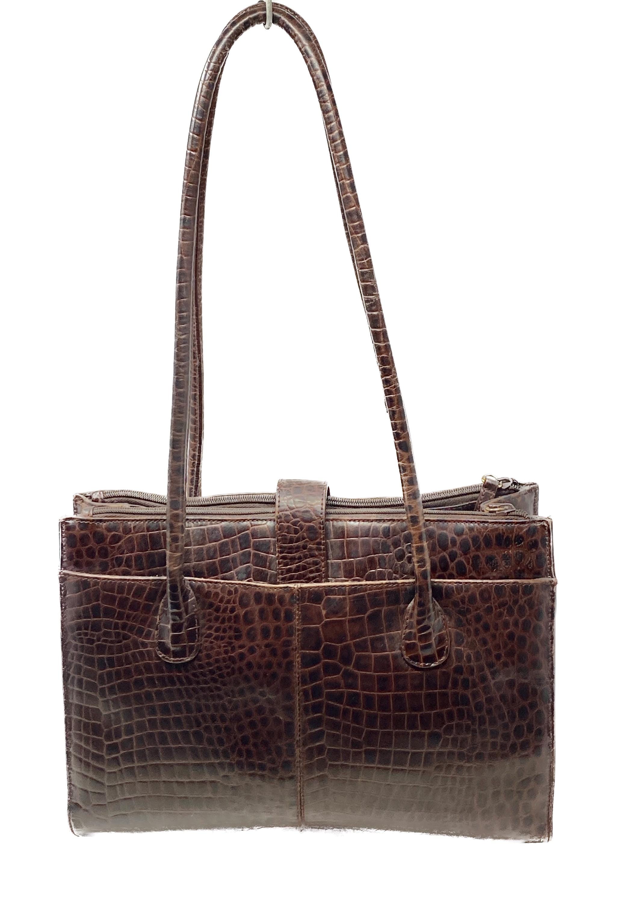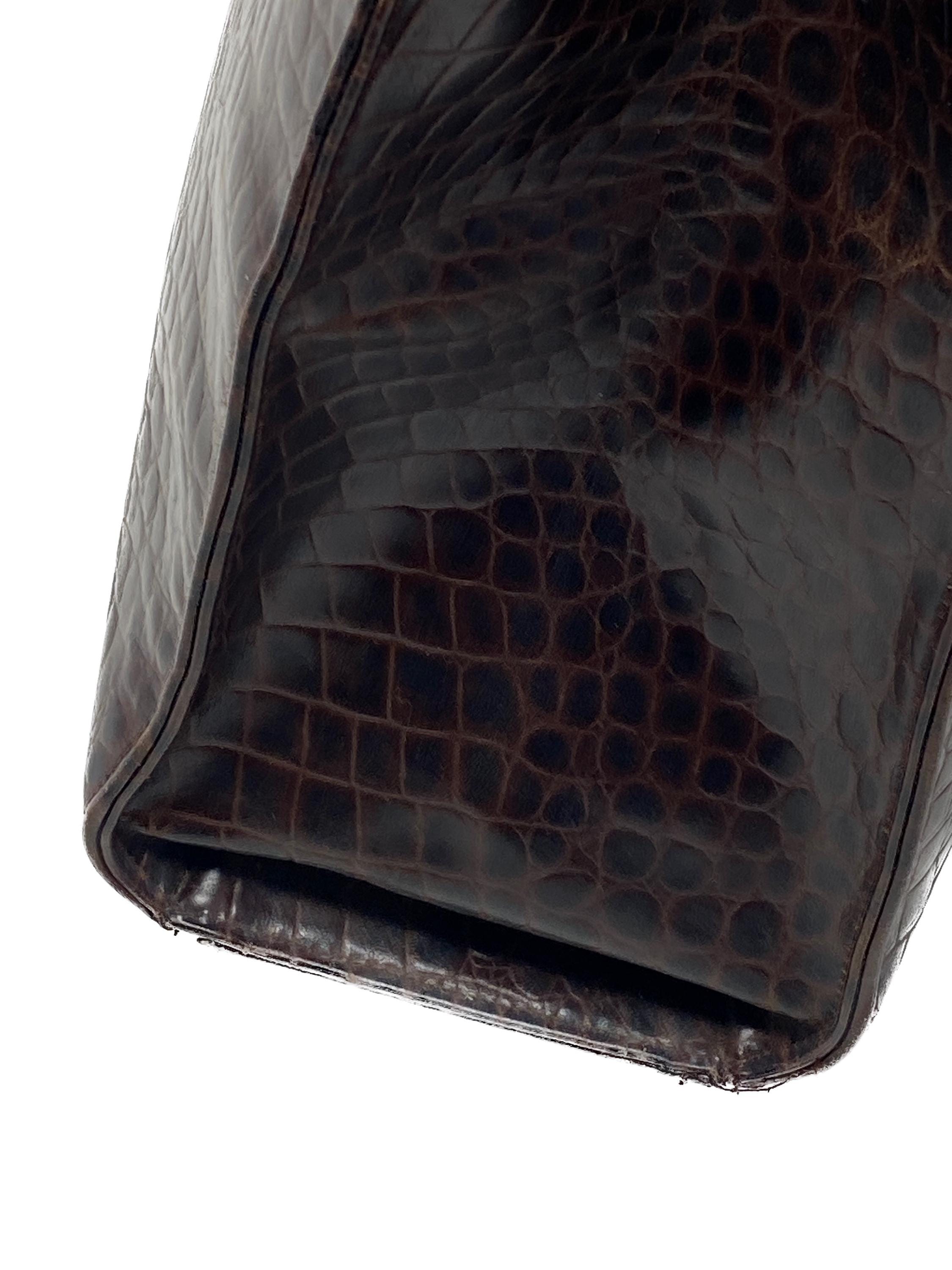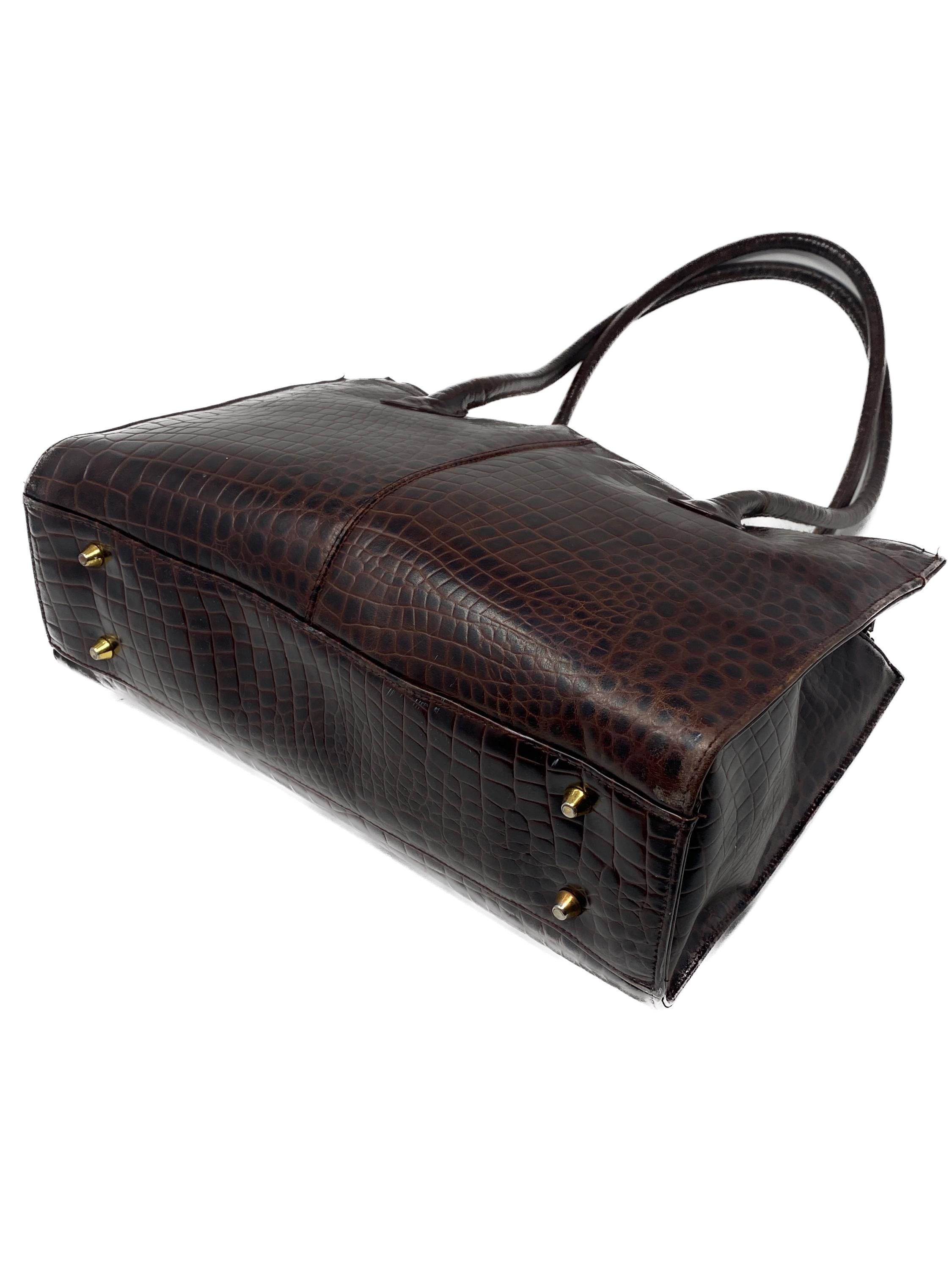 This vintage Etienne Aigner handbag embodies sophisticated luxury from the 1980s or 1990s. The classic rectangular, structured silhouette is elevated by the rich texture of the dark brown croc-embossed leather.