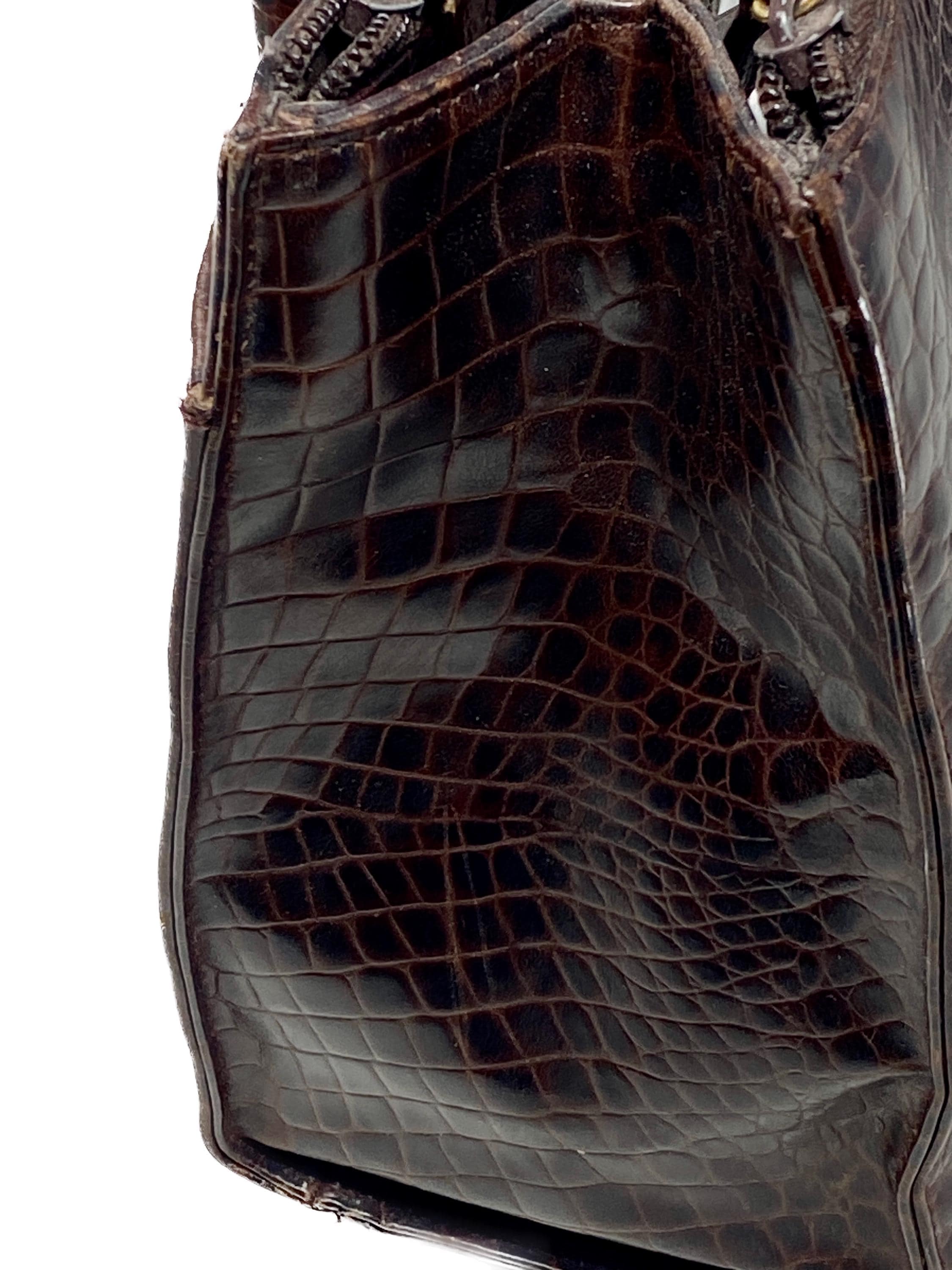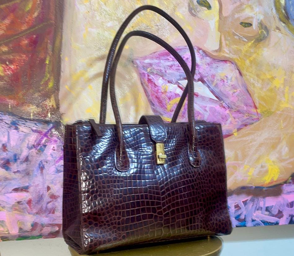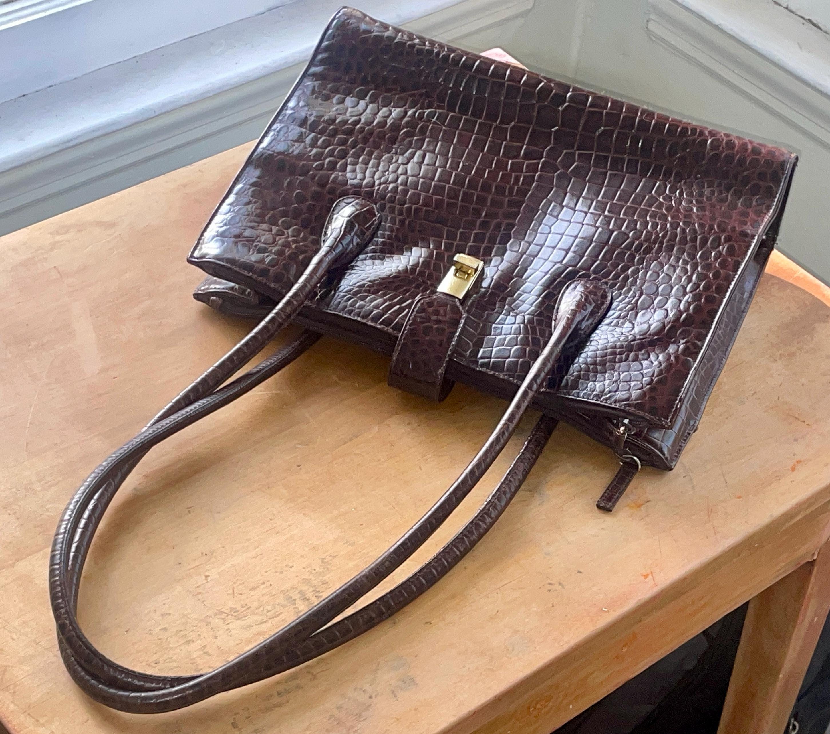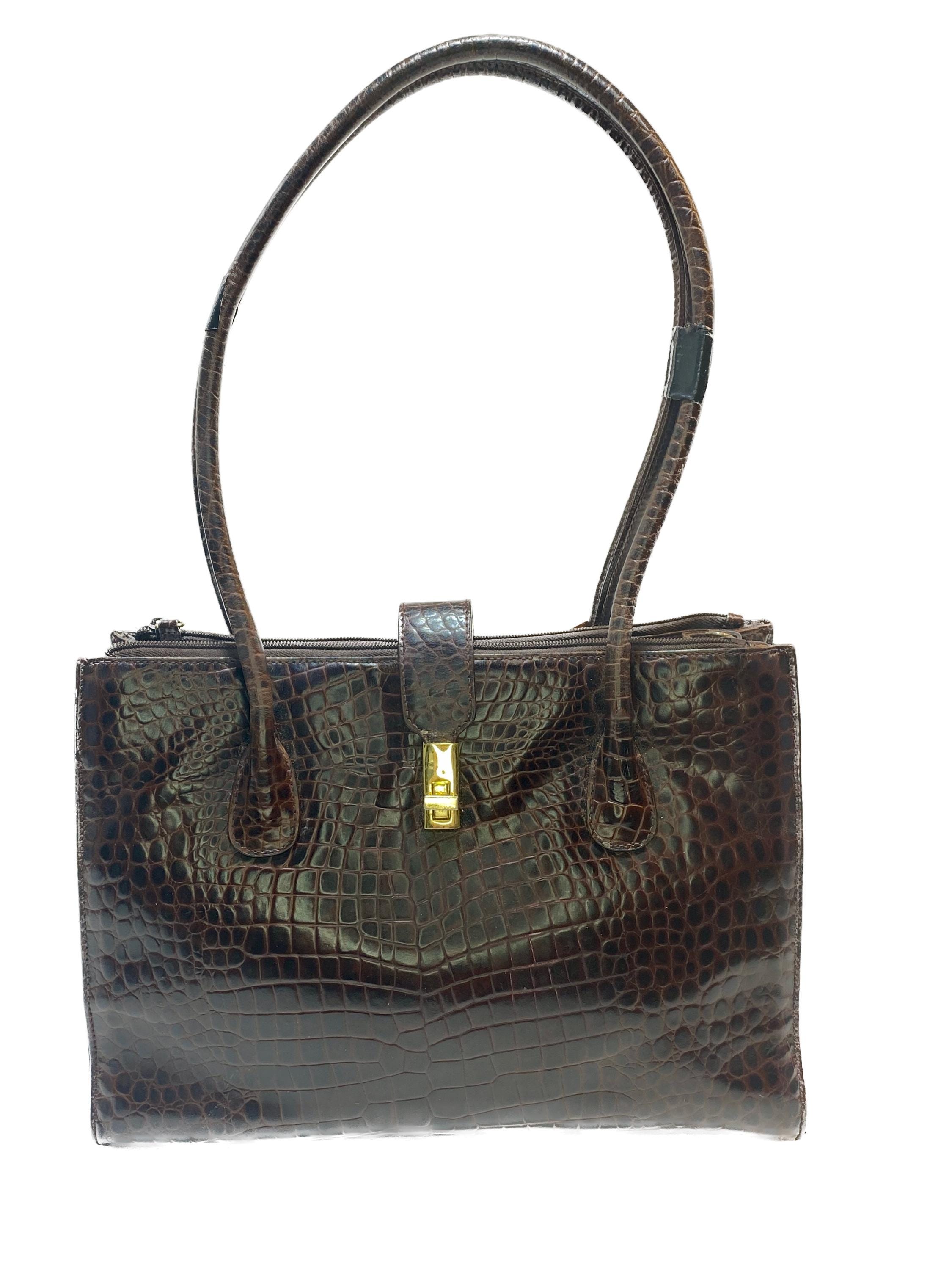 This vintage Etienne Aigner handbag embodies sophisticated luxury from the 1980s or 1990s. The classic rectangular, structured silhouette is elevated by the rich texture of the dark brown croc-embossed leather.