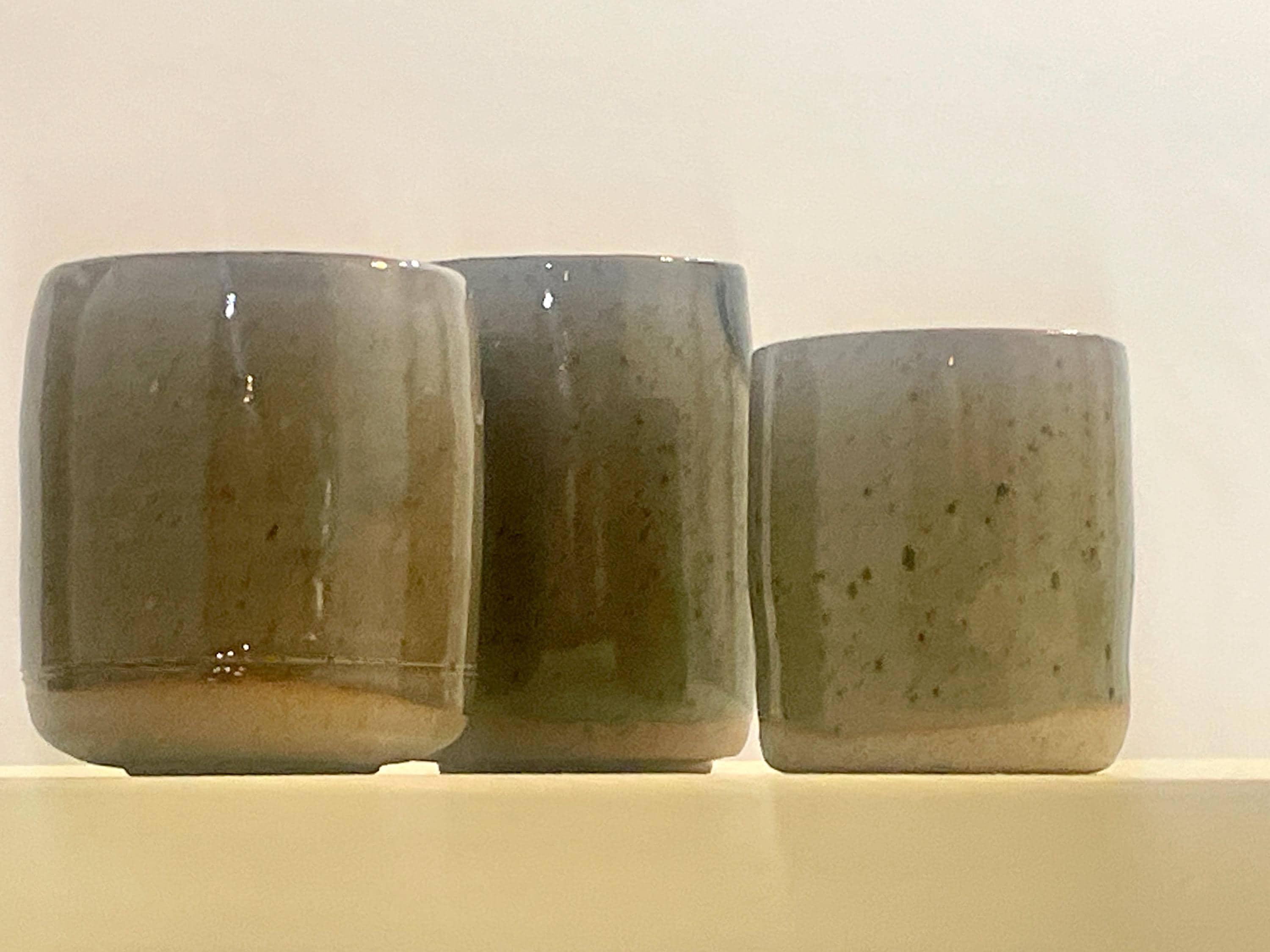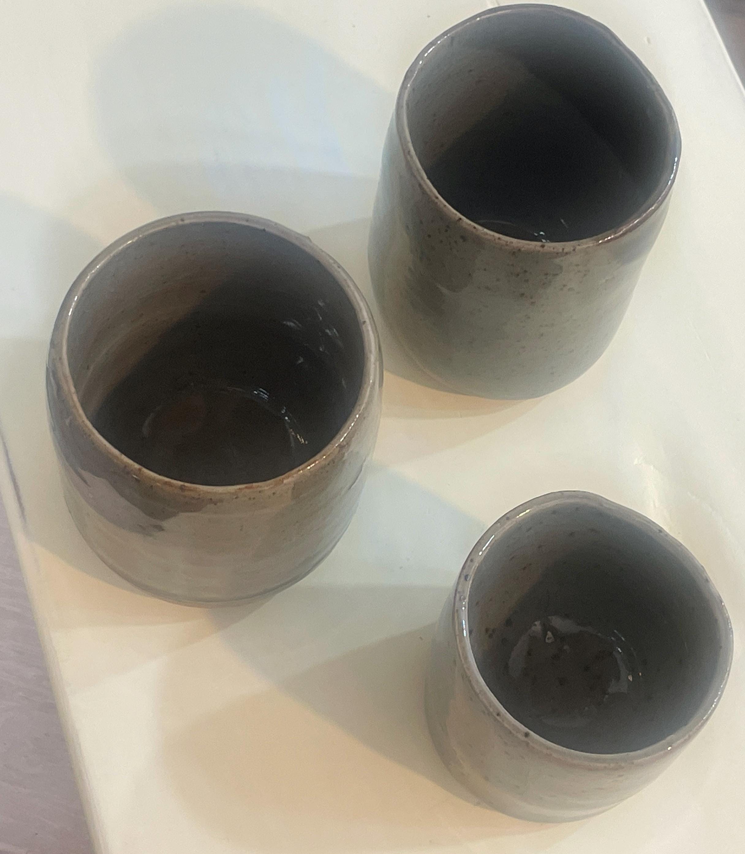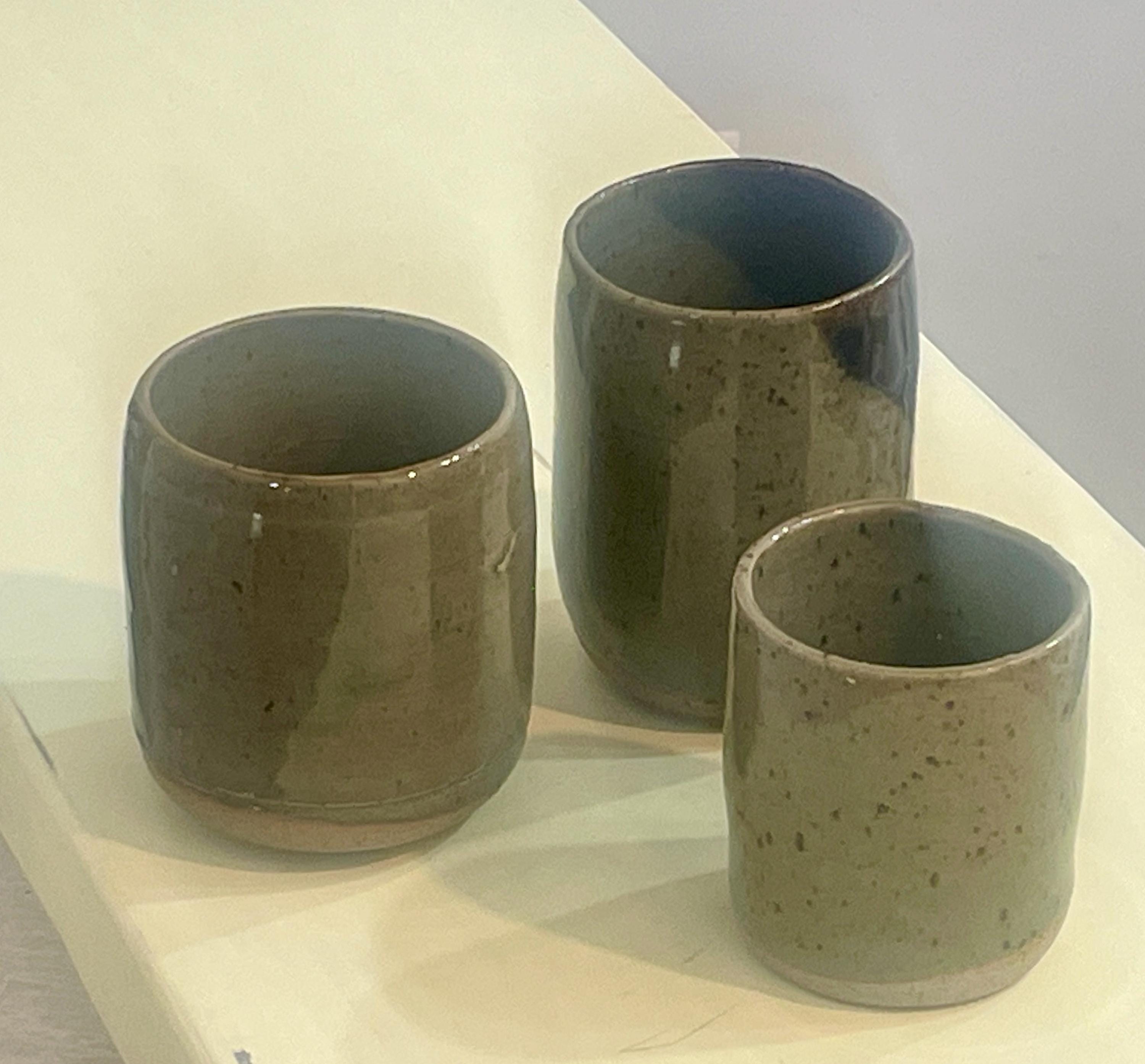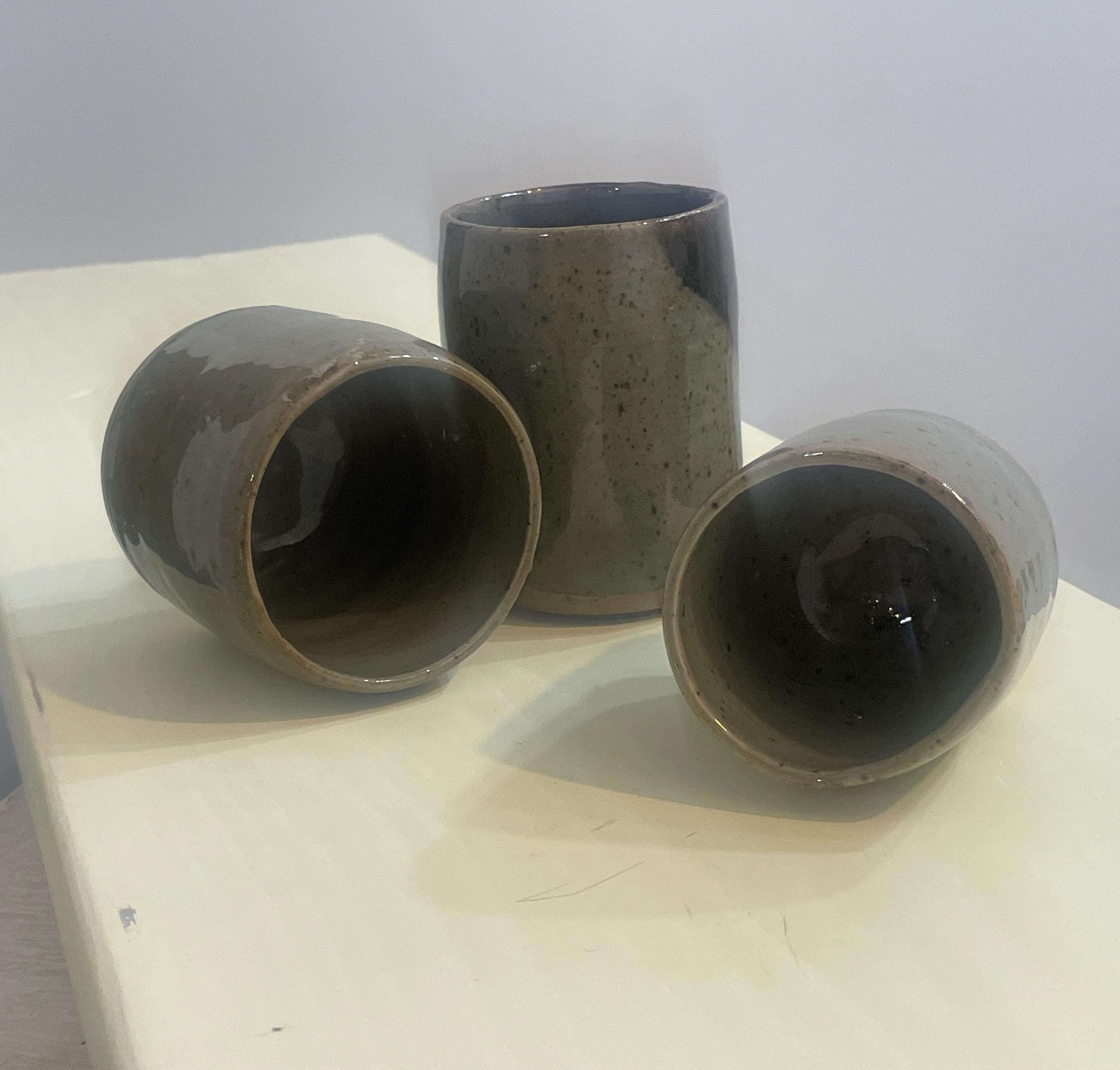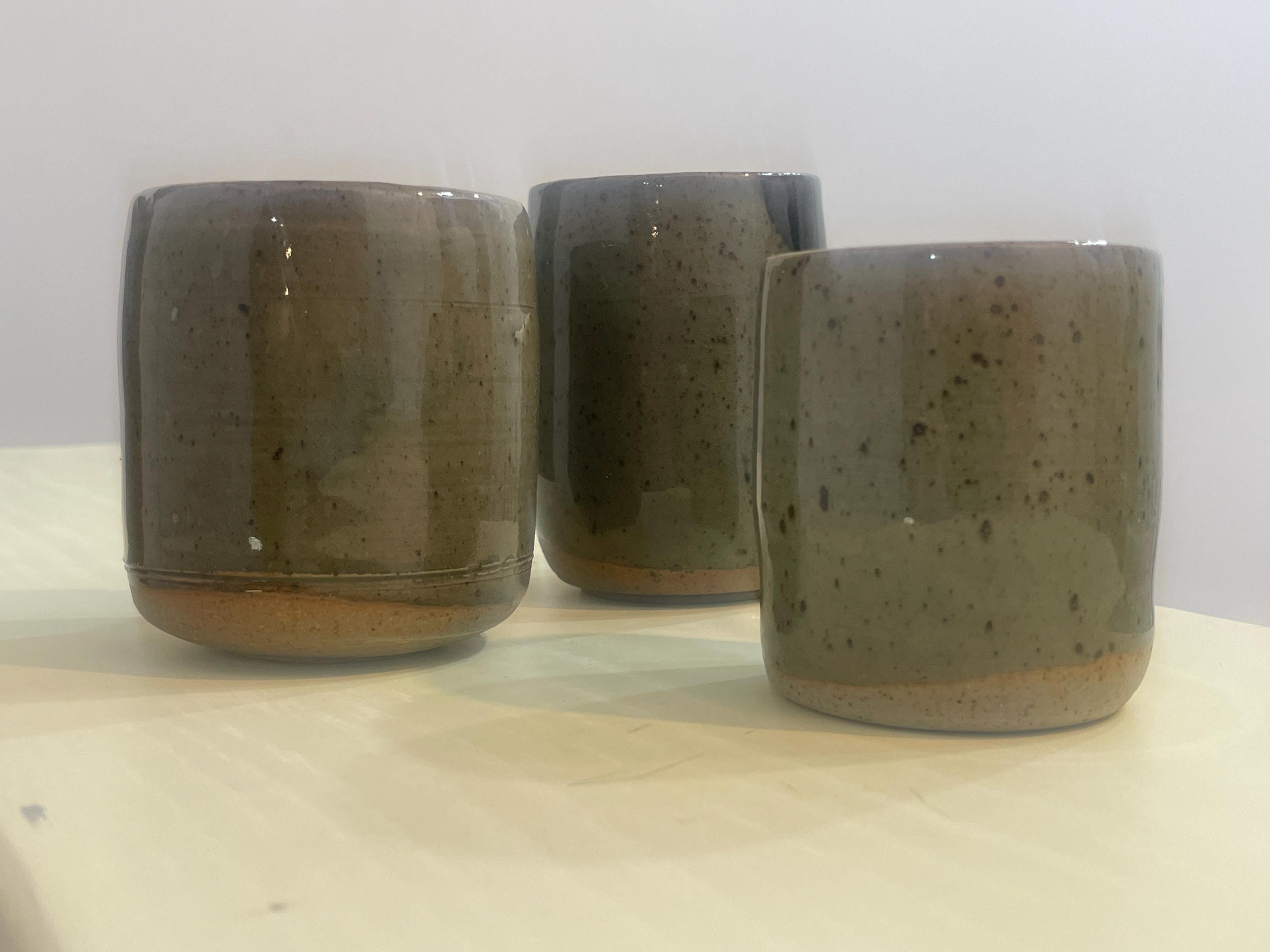 This listing is for a set of three handmade stoneware cups, each a unique piece of functional art. Wheel-thrown with care, these cups feature an organic, minimalist form with a speckled, earthy glaze that varies subtly from a muted green to a warm brown. The unglazed bottom reveals the natural, raw texture of the stoneware clay, creating a beautiful contrast.