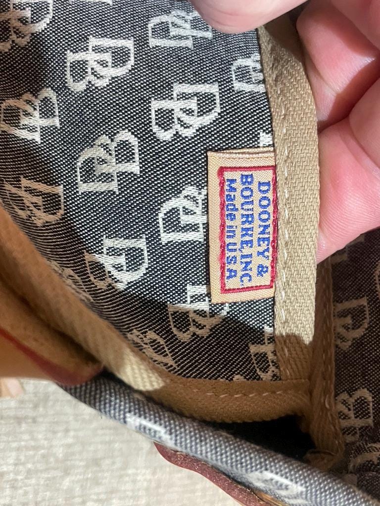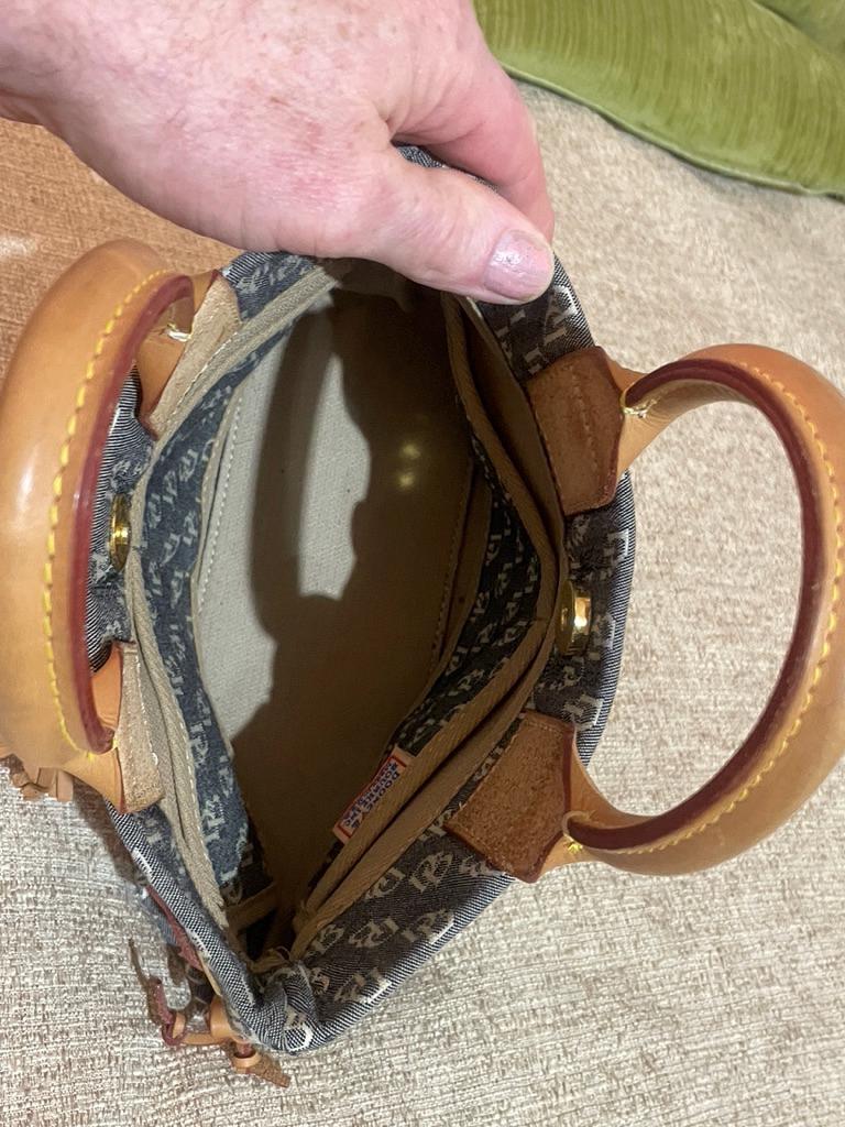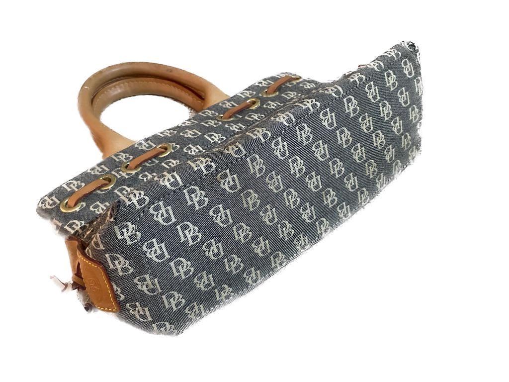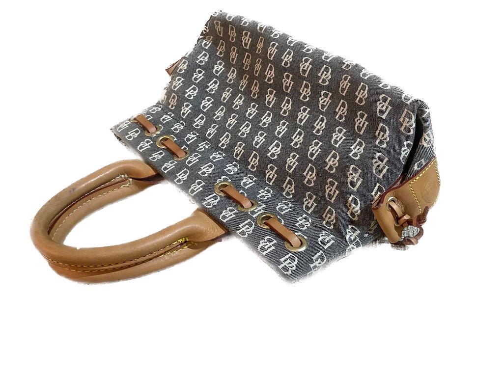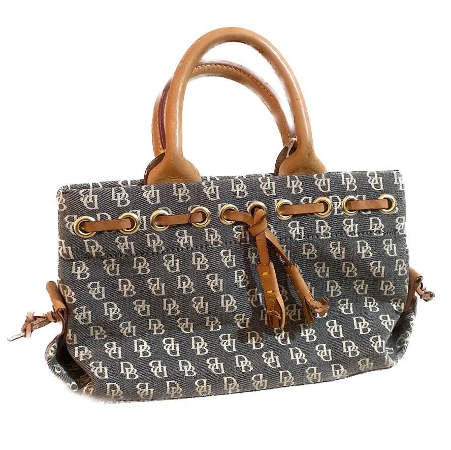 This listing is for a stylish, vintage Dooney & Bourke monogram satchel, a classic piece from the popular Y2K era. The bag is crafted from a durable denim-style canvas fabric featuring the iconic all-over "DB" monogram pattern in a contrasting off-white. The rich, tan leather trim and handles provide a beautiful contrast to the dark blue monogram, and the functional side drawstrings with leather tassels add a unique and charming detail.