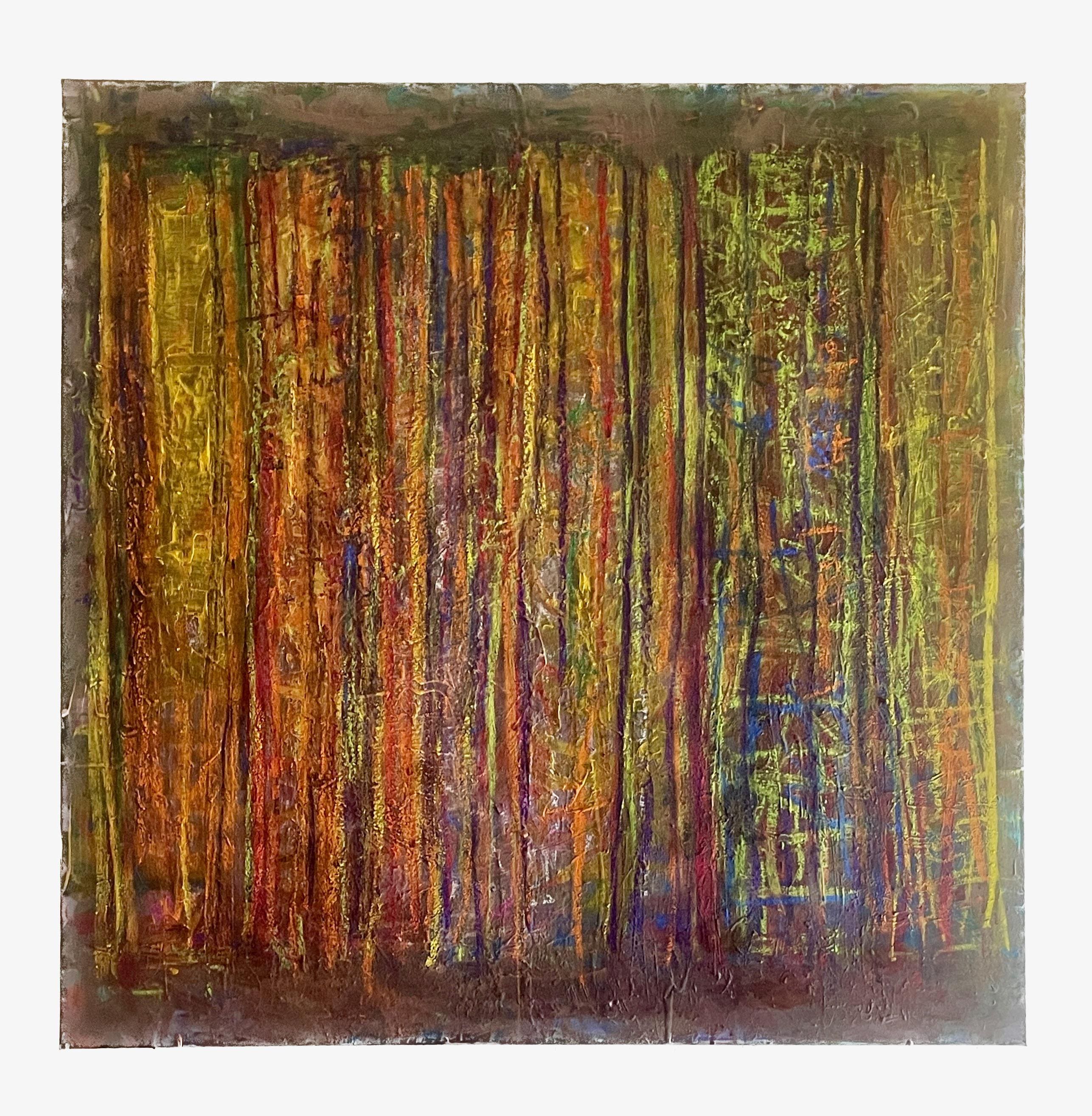 This piece, 'Stroud's Run,' explores the interplay of color, light, and depth within a textured landscape. Through the use of various mixed media—including oil paint, oil pastels, spray paint, and marker—the work captures a sense of movement and energy. The vertical lines are not a literal depiction but rather an emotional response to the atmosphere of a dense woodland, evoking the feeling of light filtering through a canopy or the rhythm of rain. The layered surface, sealed with a final coat of polyacrylic, invites the viewer to find their own connection to the organic forms and hidden spaces within the composition.