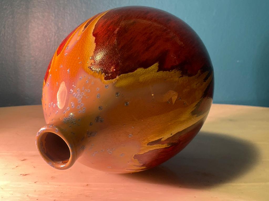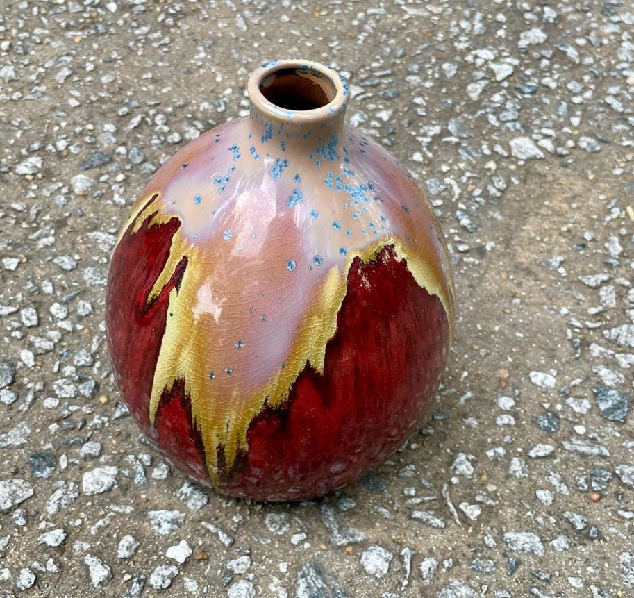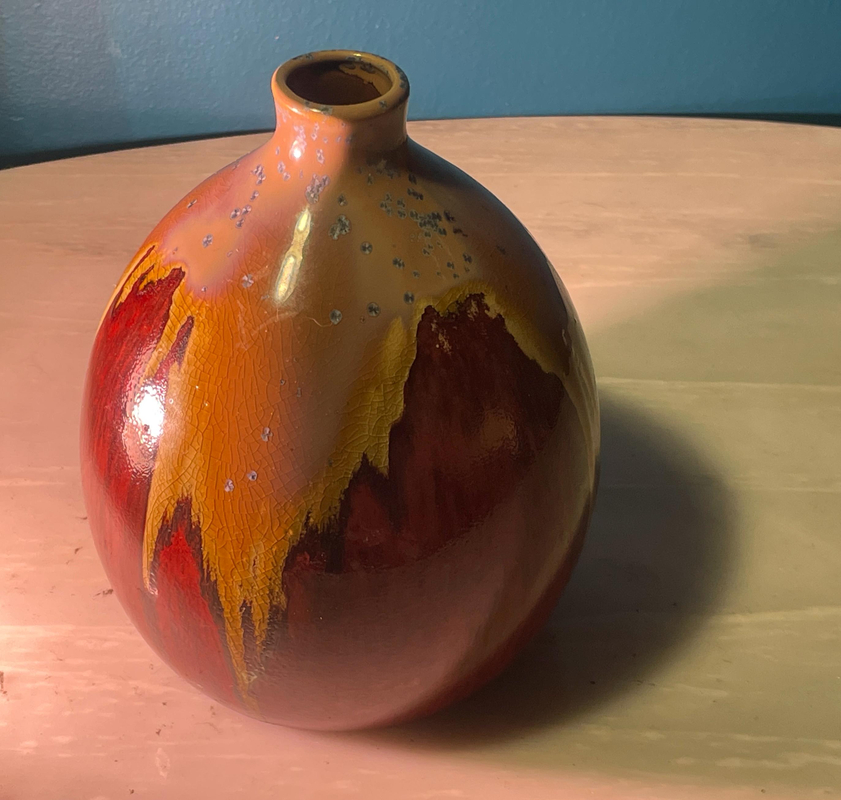 Perfect as a standalone statement piece on a bookshelf or credenza, or for holding a small bouquet of dried botanicals. Its warm, earthy colors will complement any MCM, rustic, or eclectic interior. Highlights: