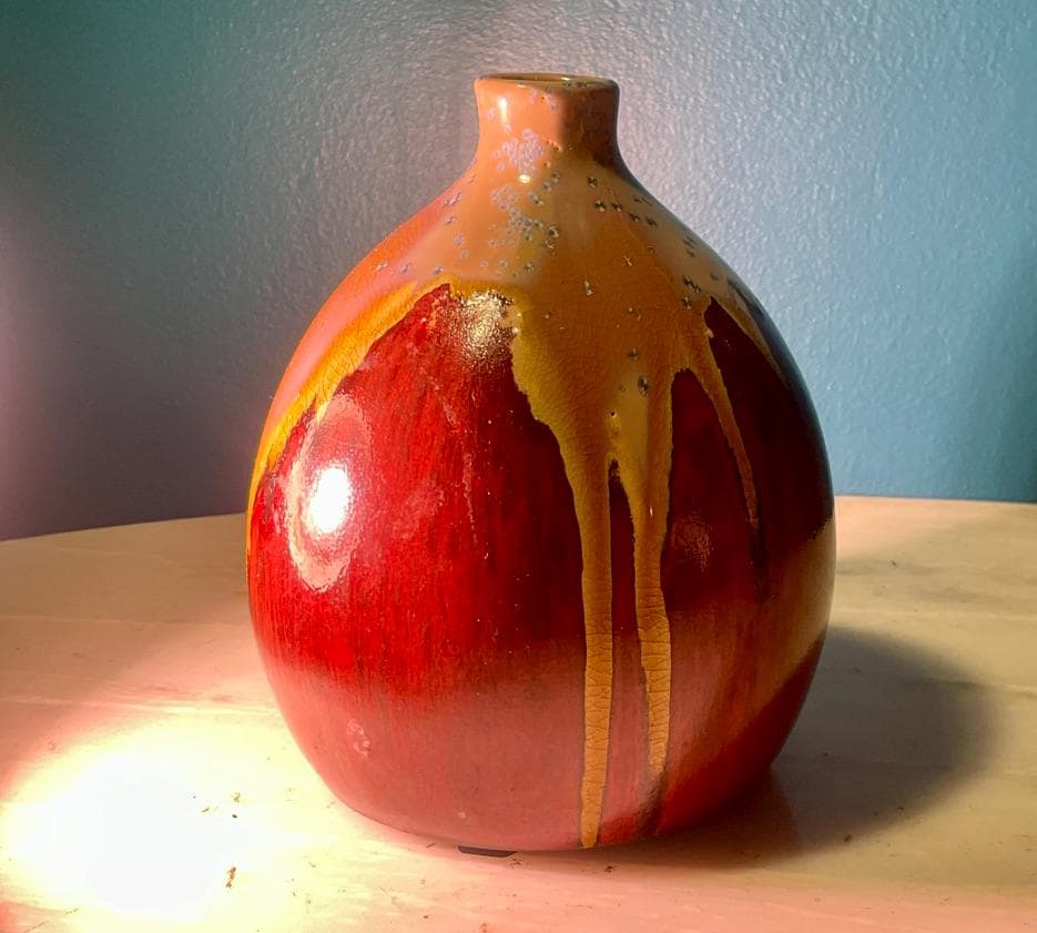A stunning and mysterious piece of vintage studio pottery, perfect for any collector of mid-century modern decor. This beautifully crafted vase features a dramatic drip glaze, with rich, deep red tones flowing into a dark, textured black-brown base. The organic and free-flowing nature of the glaze makes this a unique, one-of-a-kind piece of ceramic art.
