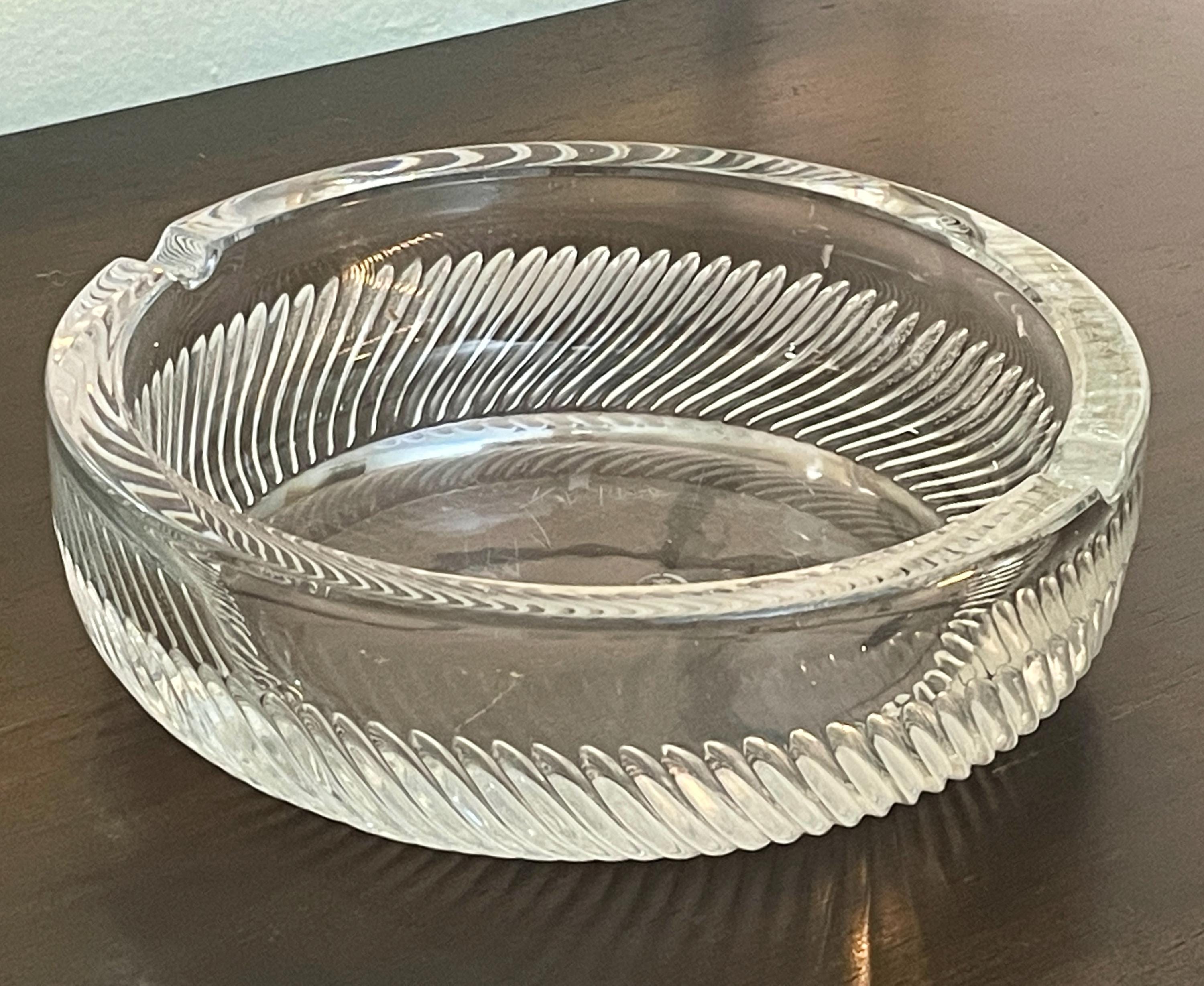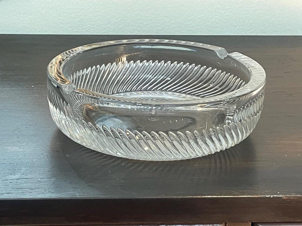 This piece perfectly captures the graphic, architectural aesthetic of Mid-Century Modern design. The heavy, polished clear glass features deep, angular, pinwheel-like ribs that spiral from the base to the rim, creating a captivating optical effect as light passes through. It’s a substantial piece, beloved for its dramatic presence and quality craftsmanship.