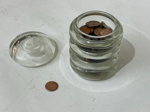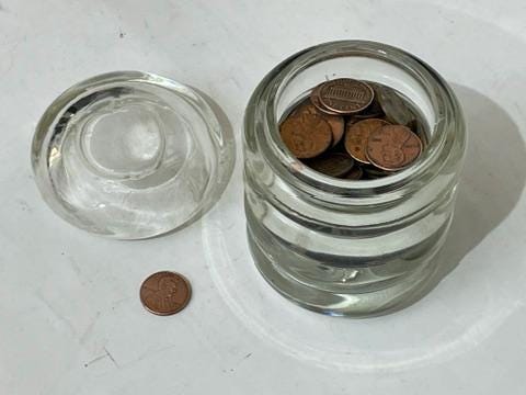 This delightful Elegant Glass trinket jar is a truly charming find, perfect for adding a touch of vintage sophistication to a vanity, desk, or kitchen counter. Although unmarked, the quality and detail point toward American mid-century manufacturers like Cambridge Glass or Fostoria, known for their collectible crystal pieces.