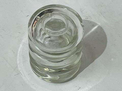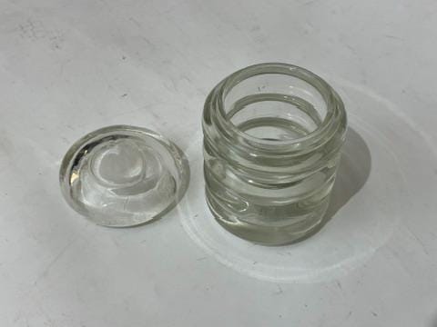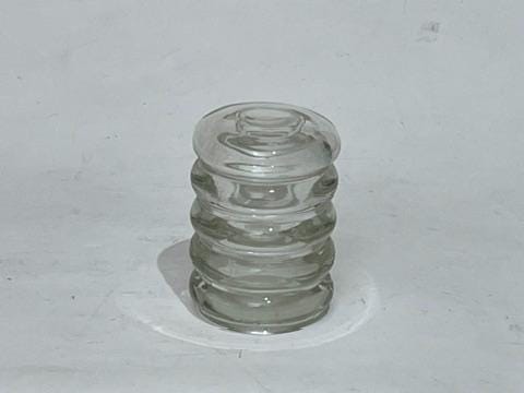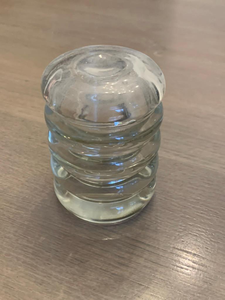 The jar is a masterclass in unique pressed glass design, featuring a body composed of four distinct, thick bubble-like cylinder rings, creating wonderful light play and texture. The piece is crowned with a tight-fitting lid, which also forms a fifth cylinder ring.