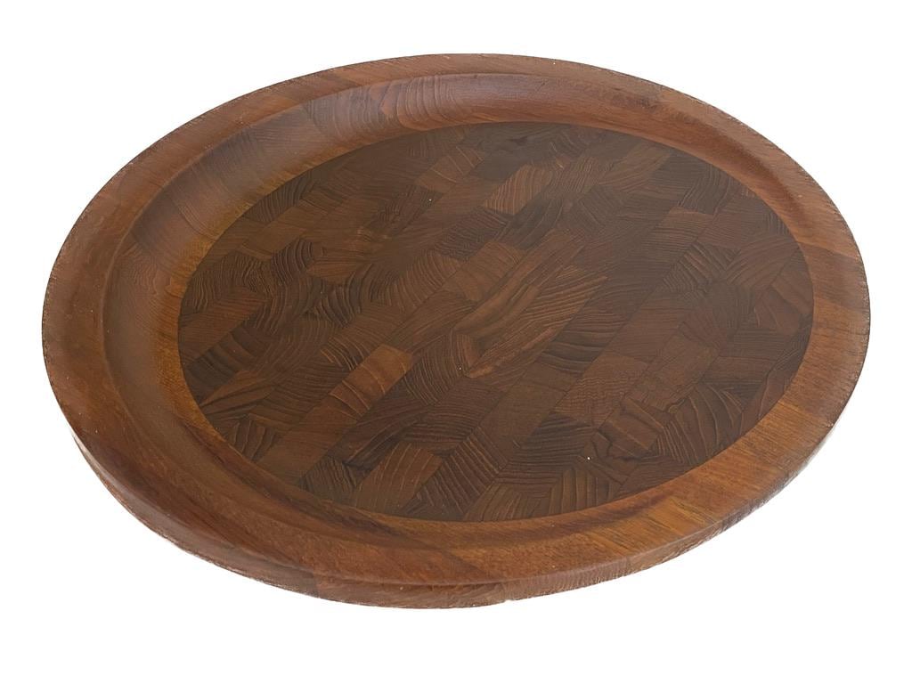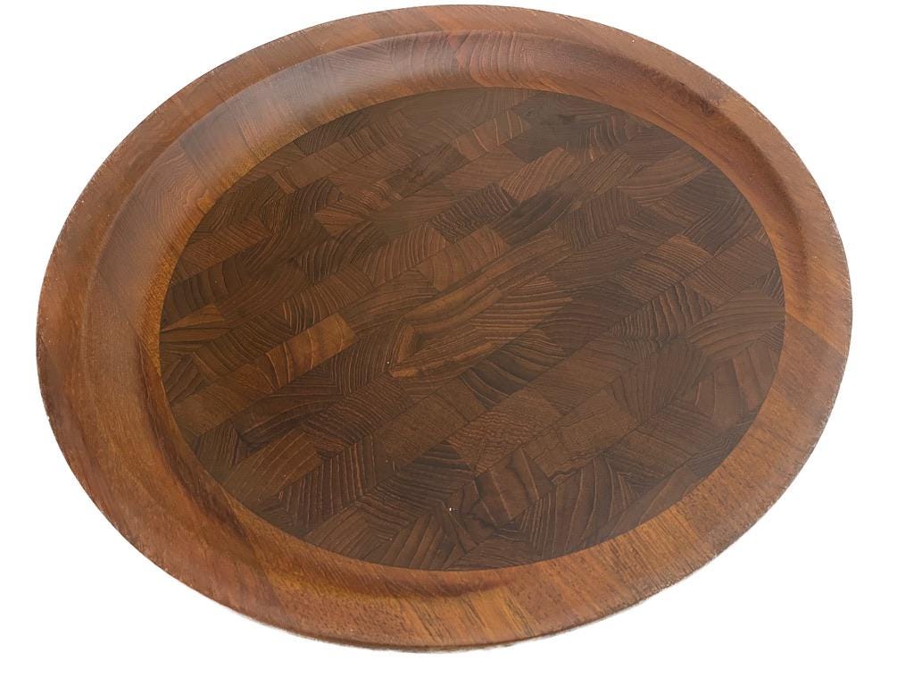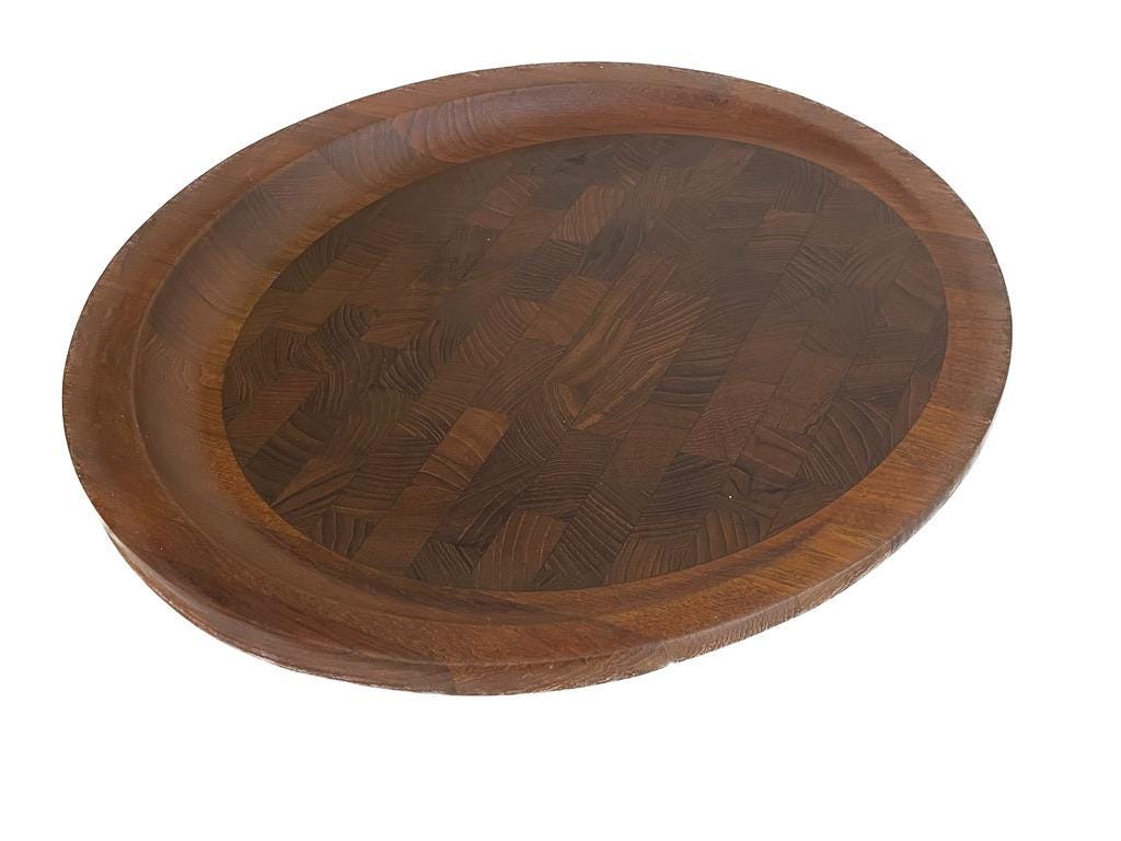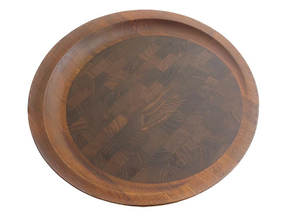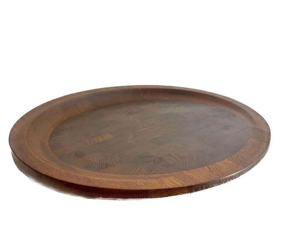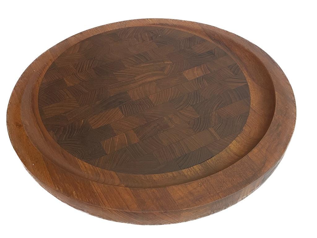Designed circa 1950s and in production through the 1960s, this is rarity is quite famous. Solid teak, featuring a "butcher block" inlay, it is stamped on the underside. Stunning in its simplicity.
