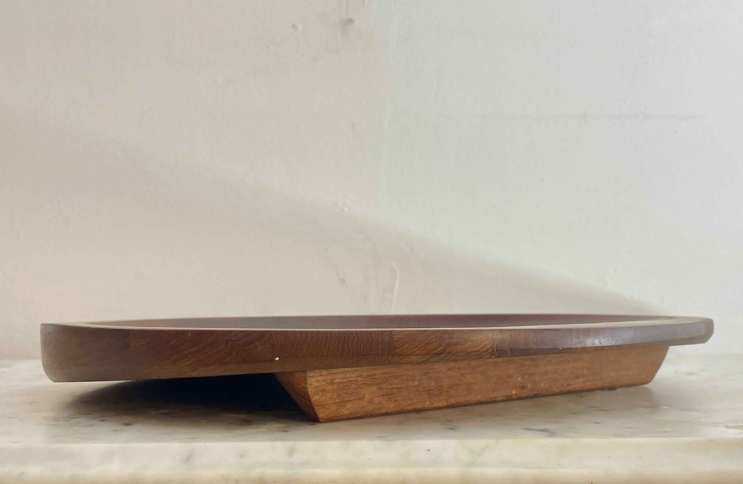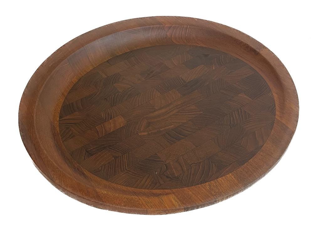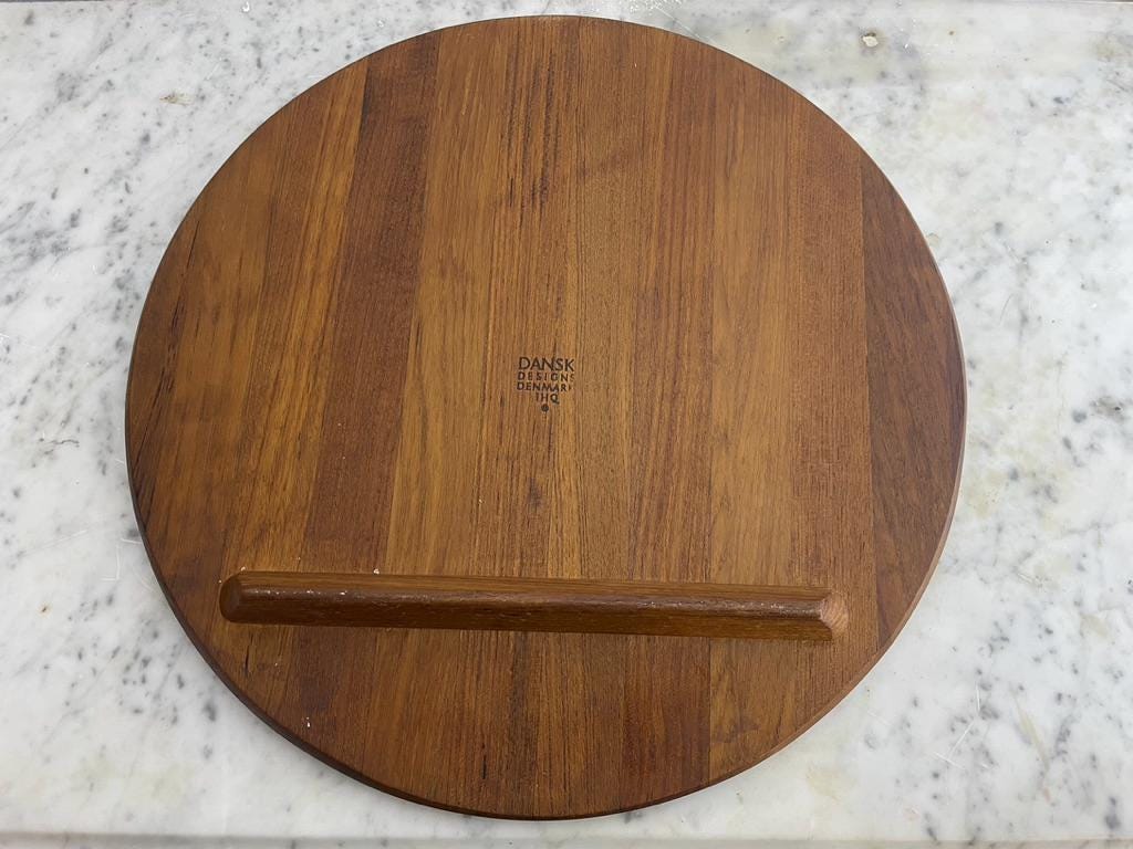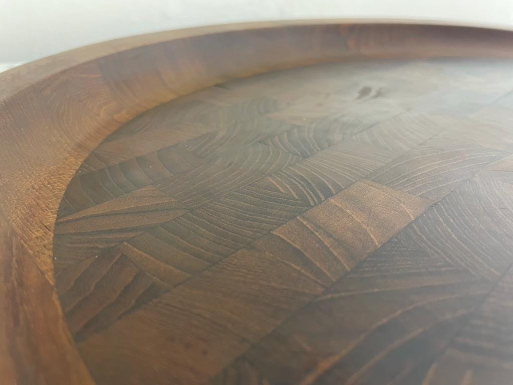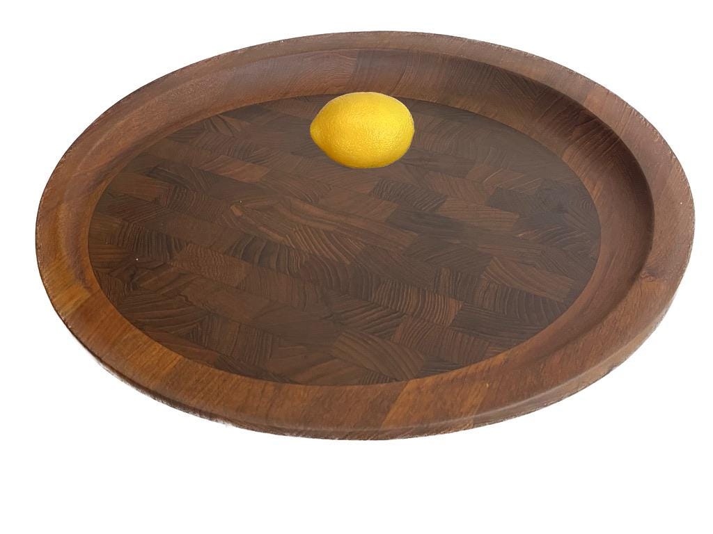 Designed circa 1950s and in production through the 1960s, this is rarity is quite famous. Solid teak, featuring a "butcher block" inlay, it is stamped on the underside. Stunning in its simplicity.