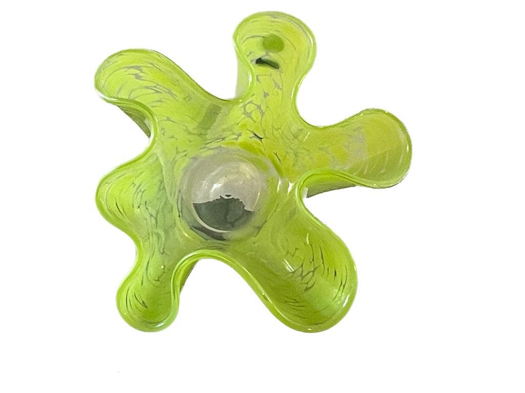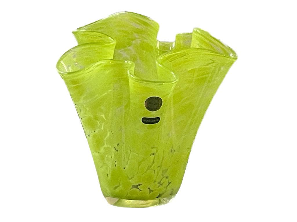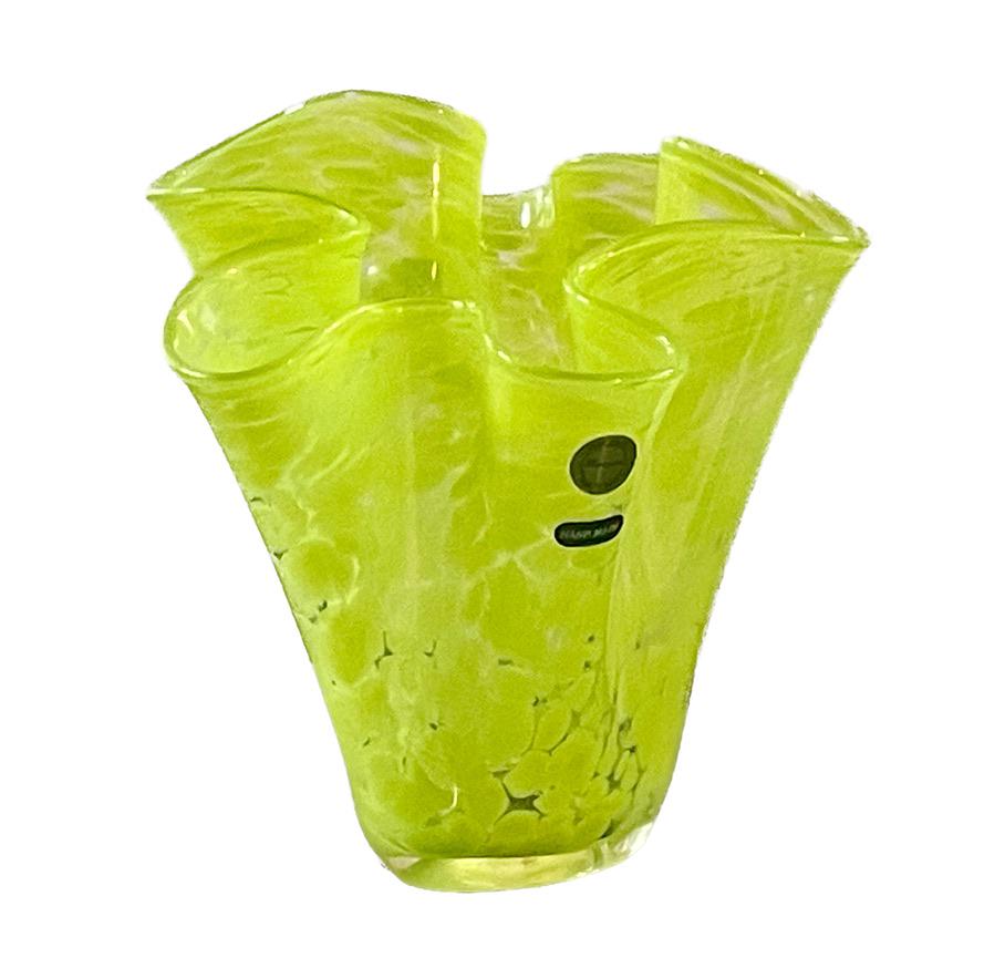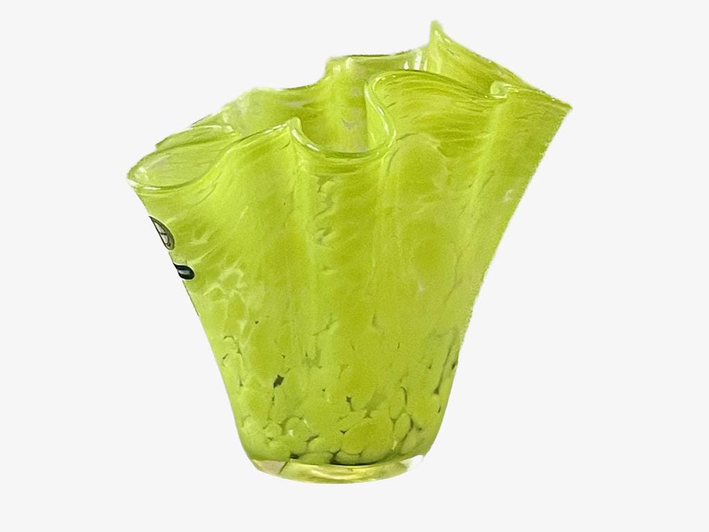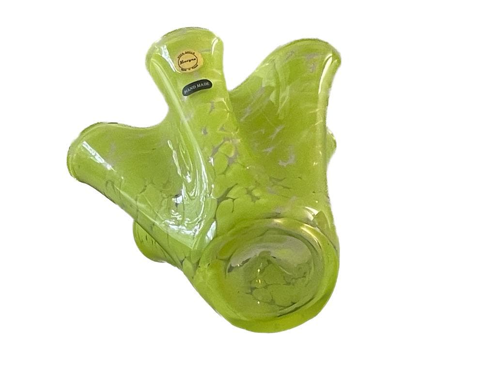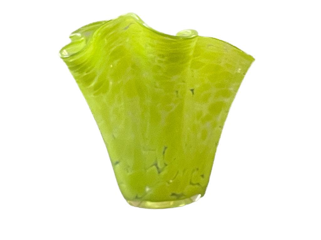 This is a beautiful example of Polish art glass, featuring a distinctive ruffled or "handkerchief" rim. The vase is hand-blown, which gives it a unique, organic shape and can result in slight variations like air bubbles and irregularities that are a testament to its artisan craftsmanship. The exterior is a vibrant green with a mottled or spatter design. measures 9.5"h x 9.5"w