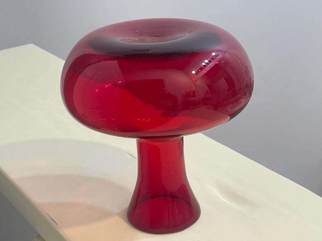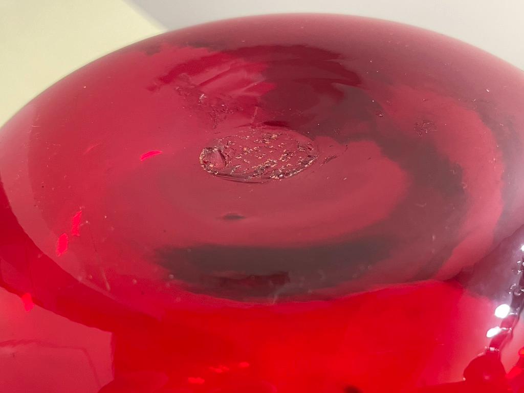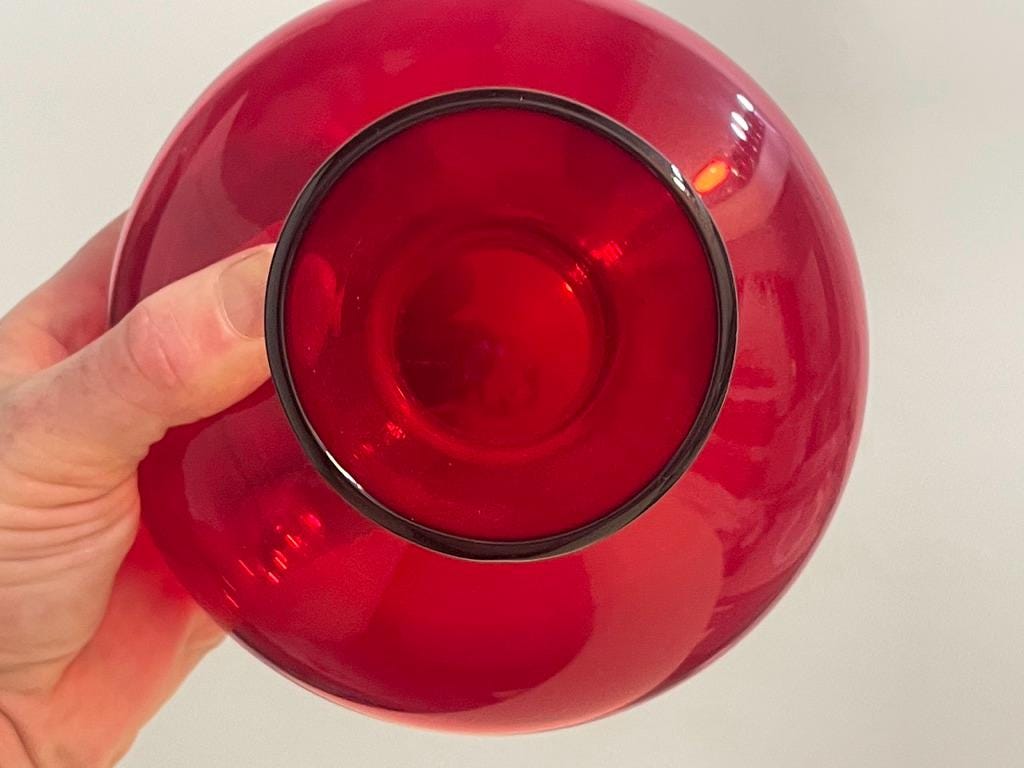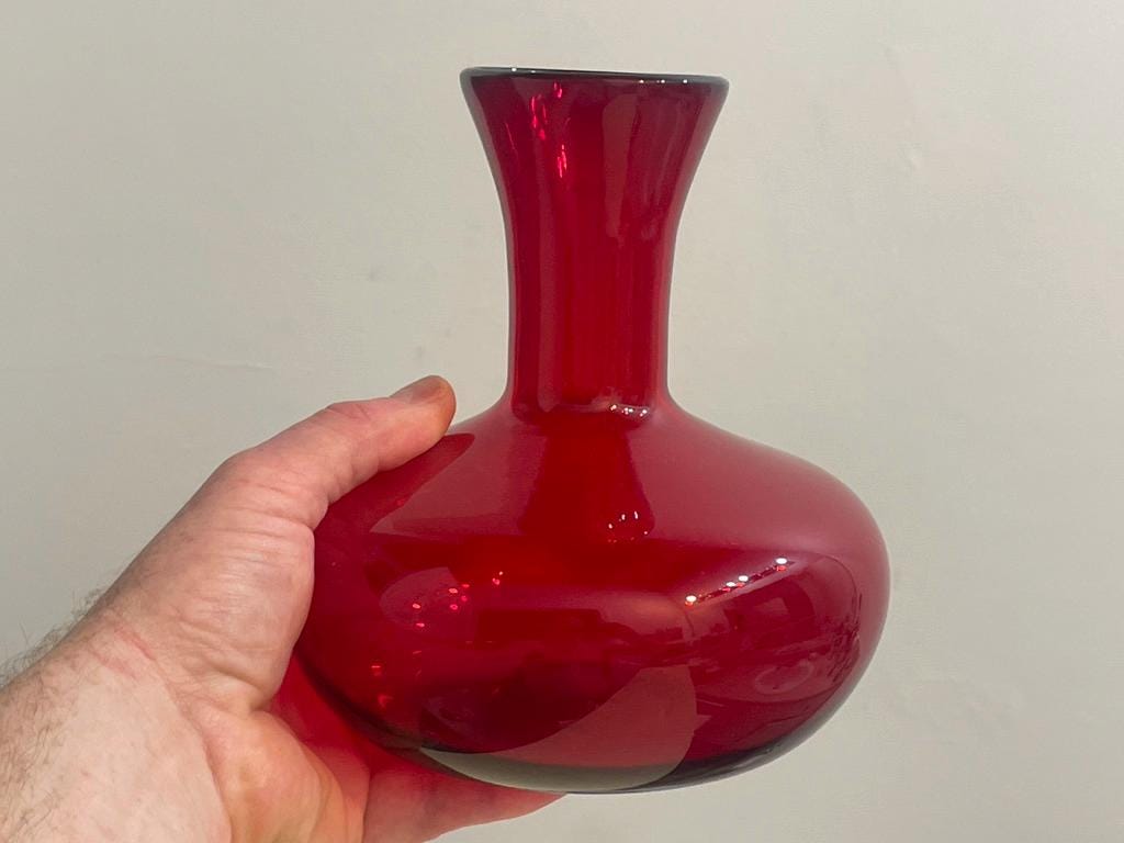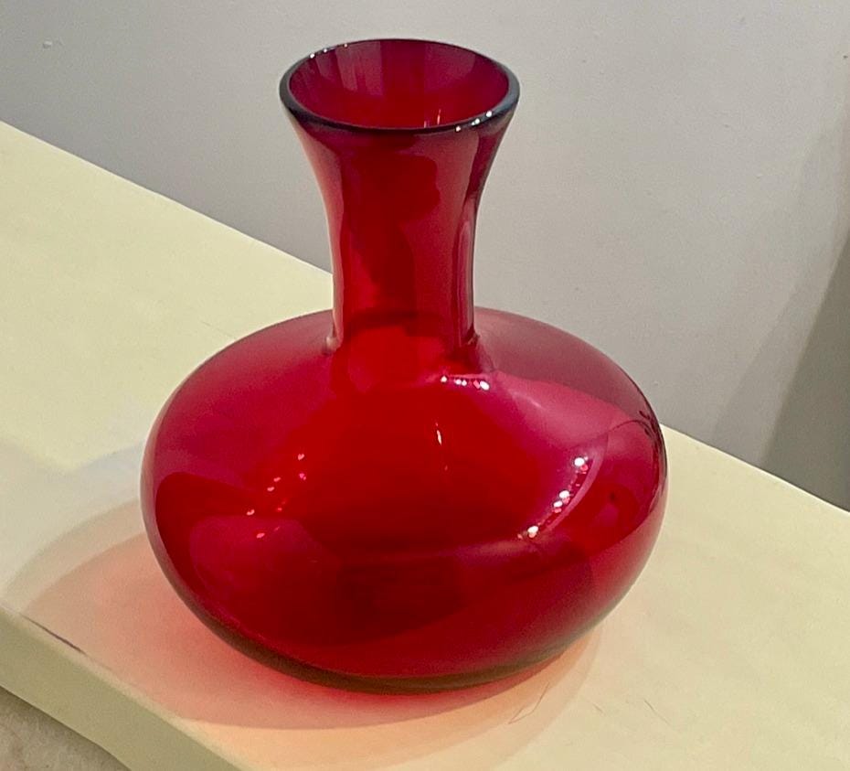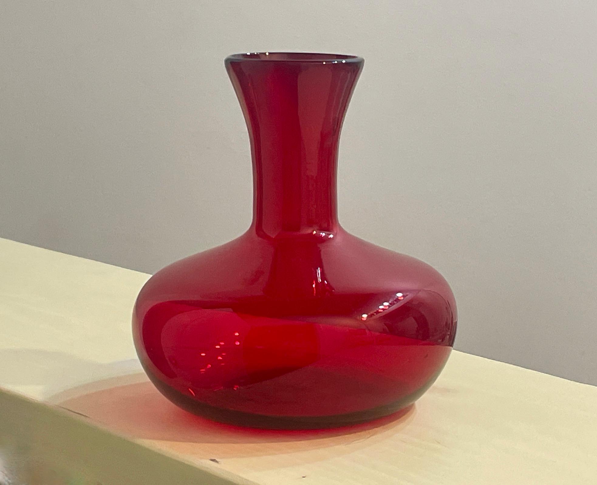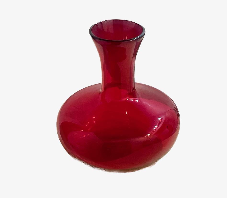 Viking was a powerhouse of glass art from 1944 to 1999, and the EPIC collection (1956–1975) is their most celebrated. This piece, Item No. 7473, showcases the line's trademark bold shapes and saturated color. Its dramatic, long-necked silhouette is made in a deep, rich Ruby Red glass that truly glows.