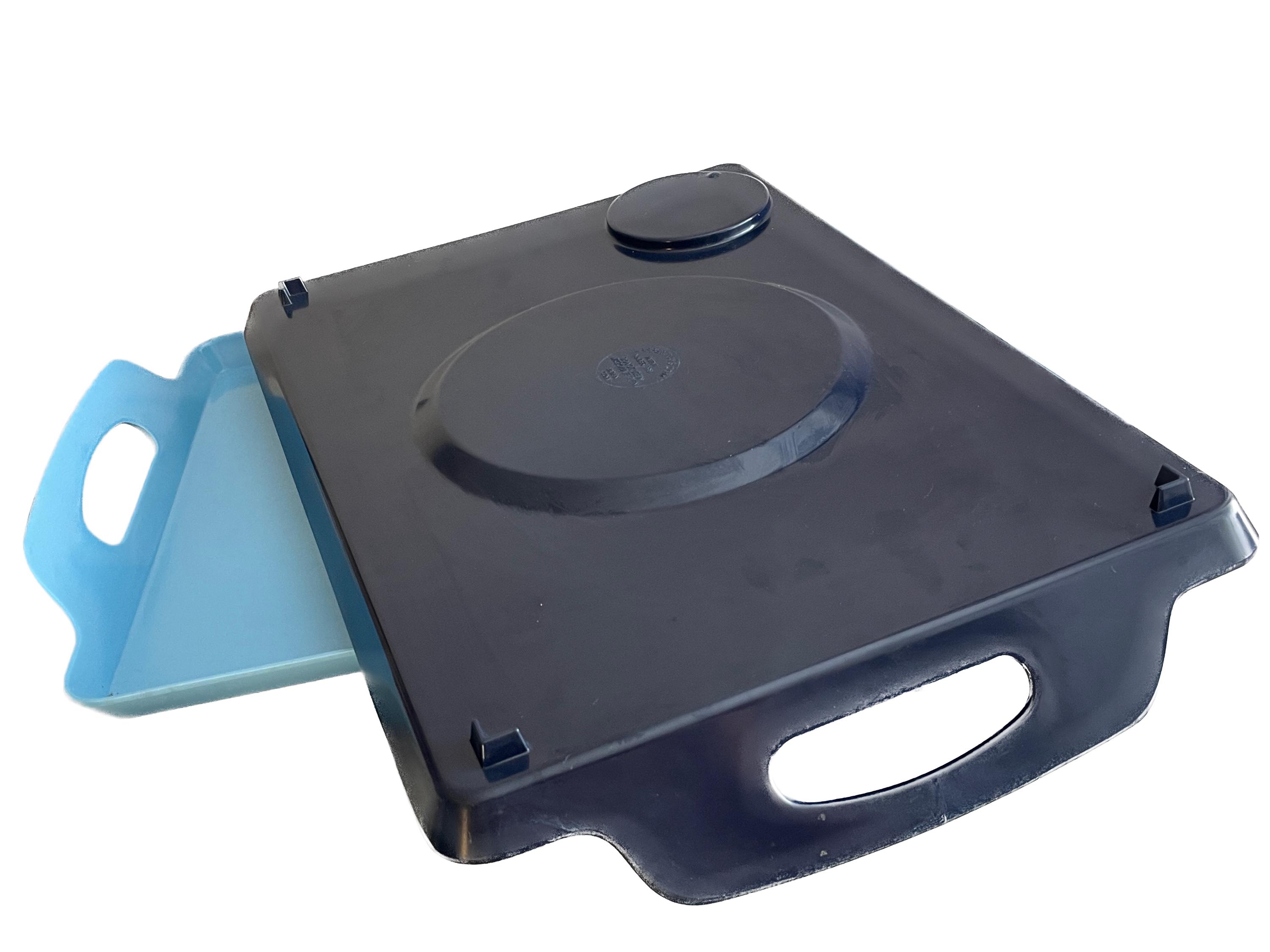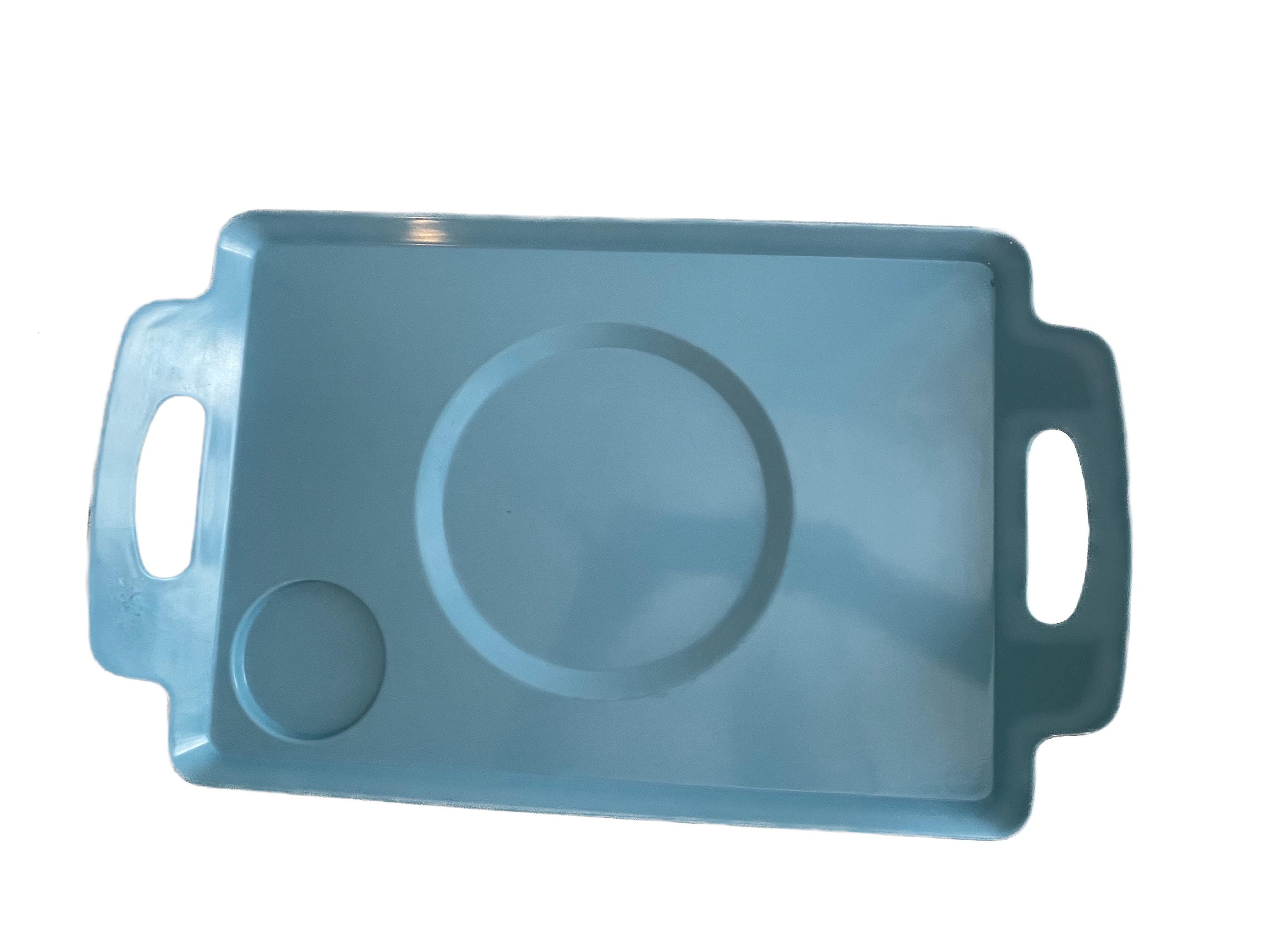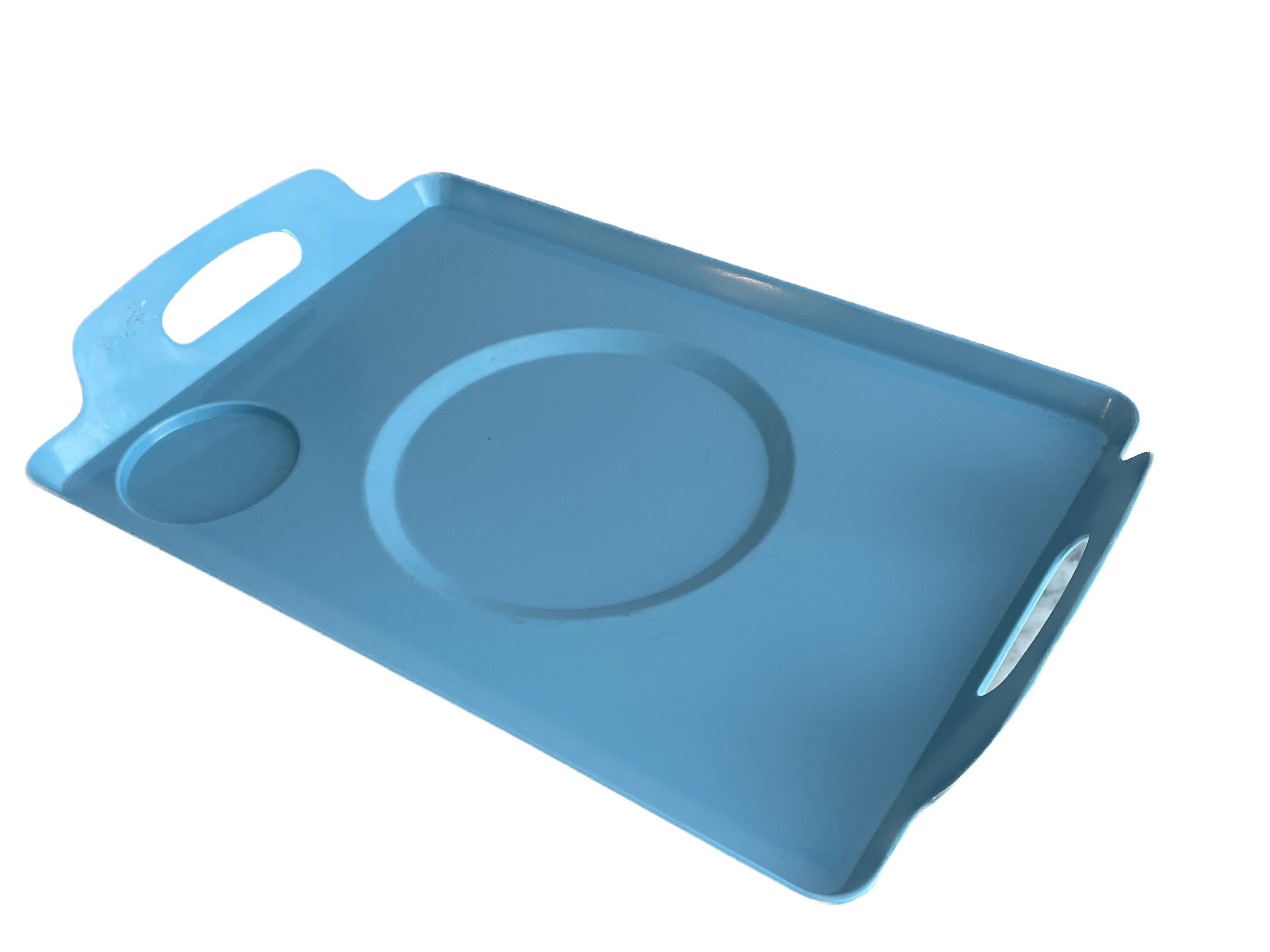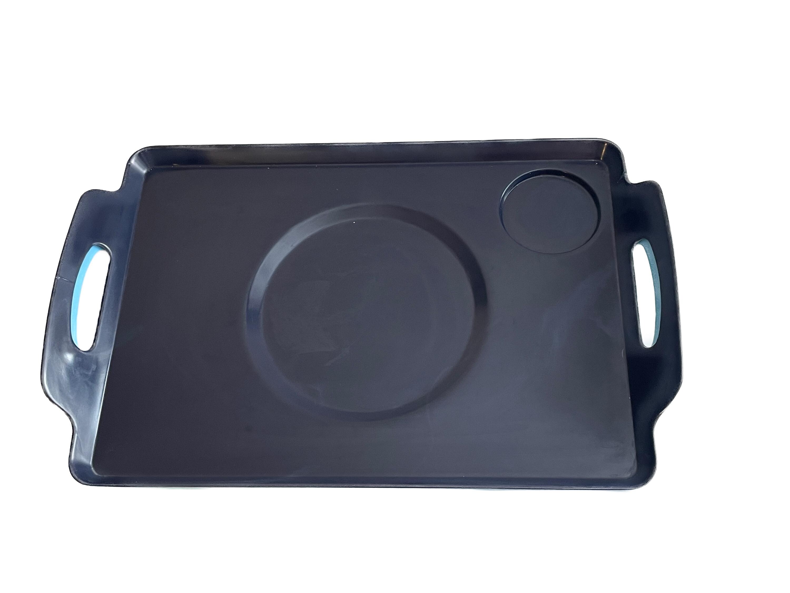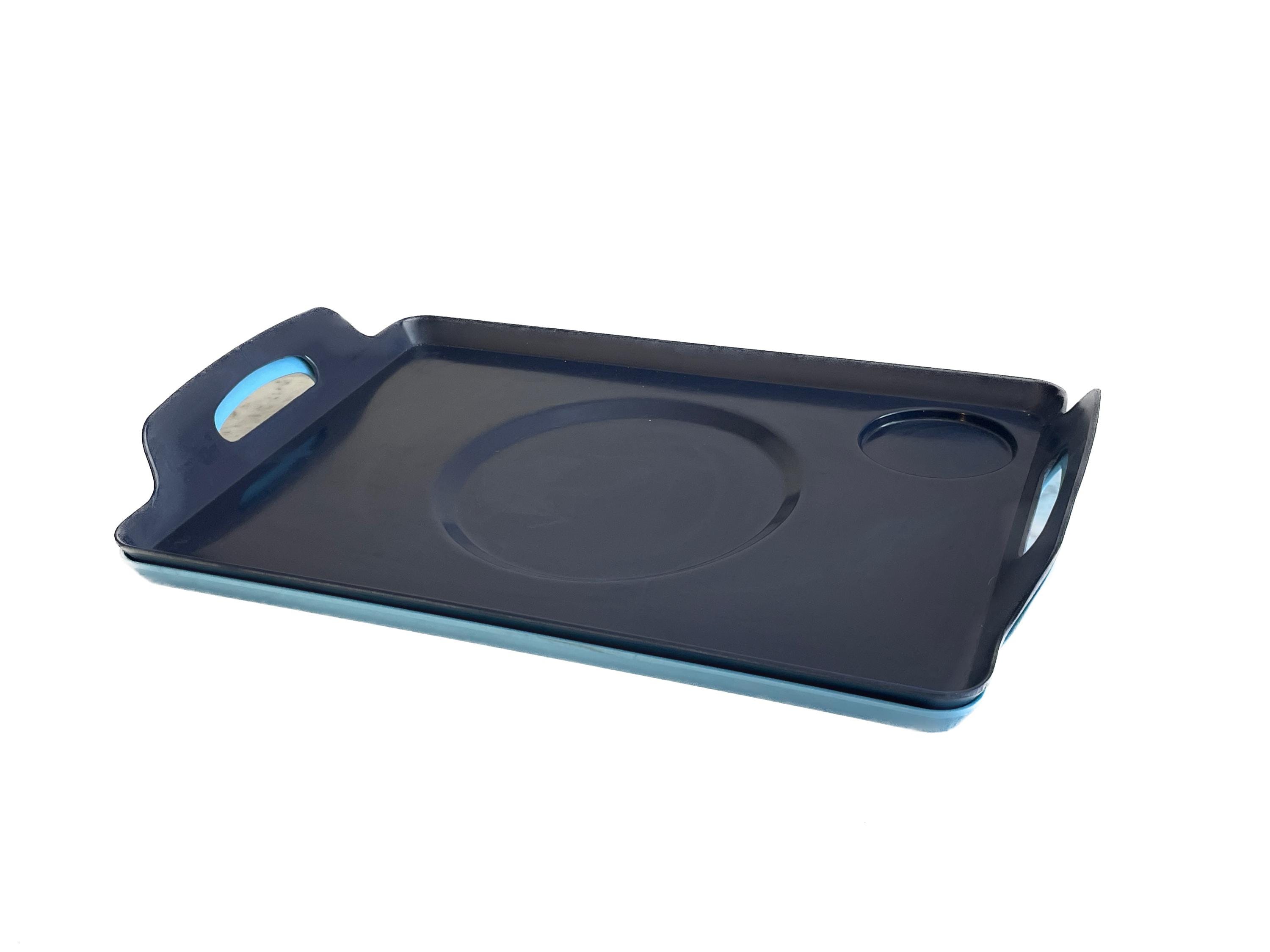 Crafted from durable, injection-molded plastic, these trays feature a streamlined silhouette and comfortable integrated handles. The design is ingeniously practical, featuring a dedicated circular recess for a plate and a smaller one for a drink, helping to secure items on a non-slip surface.