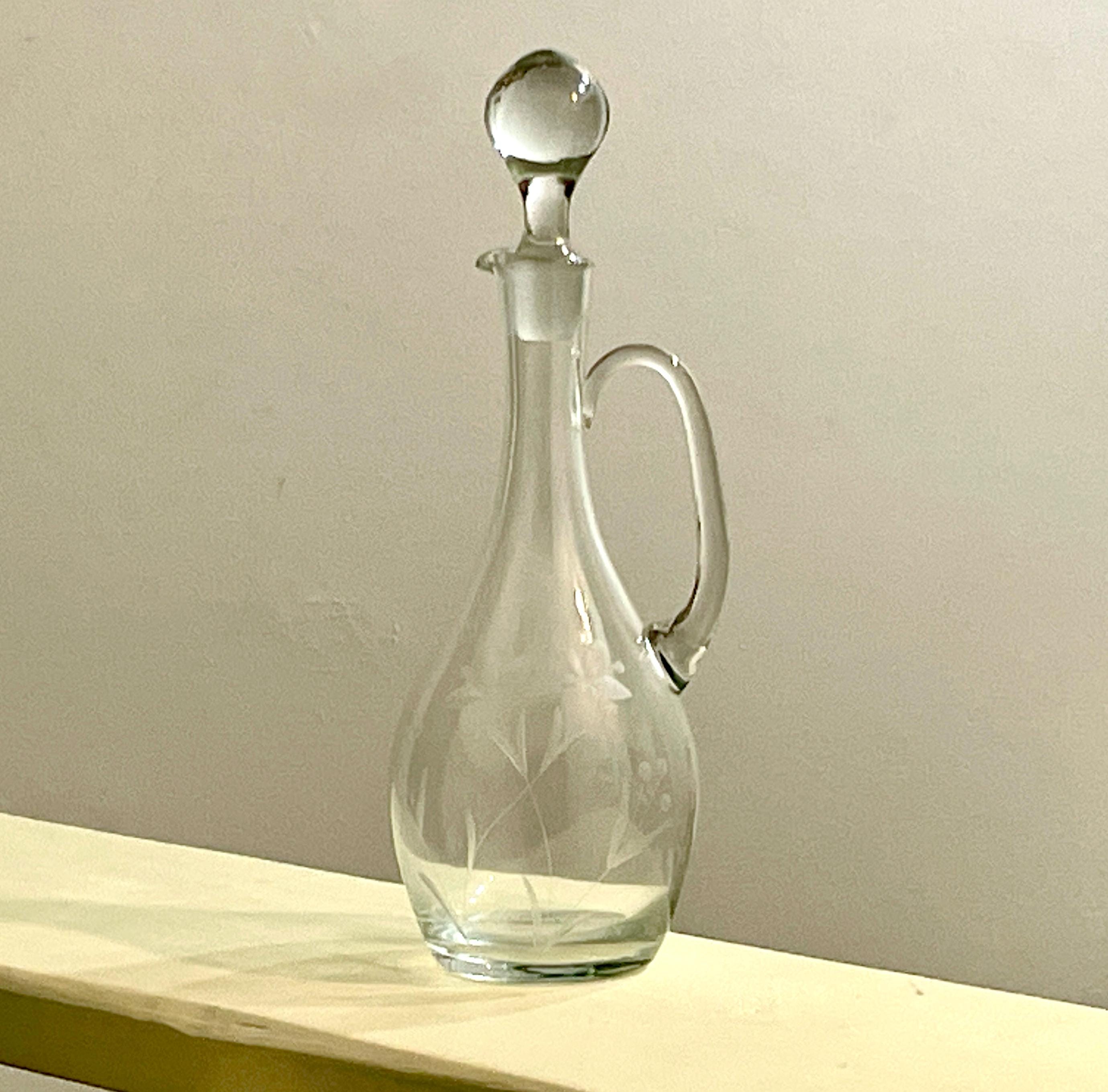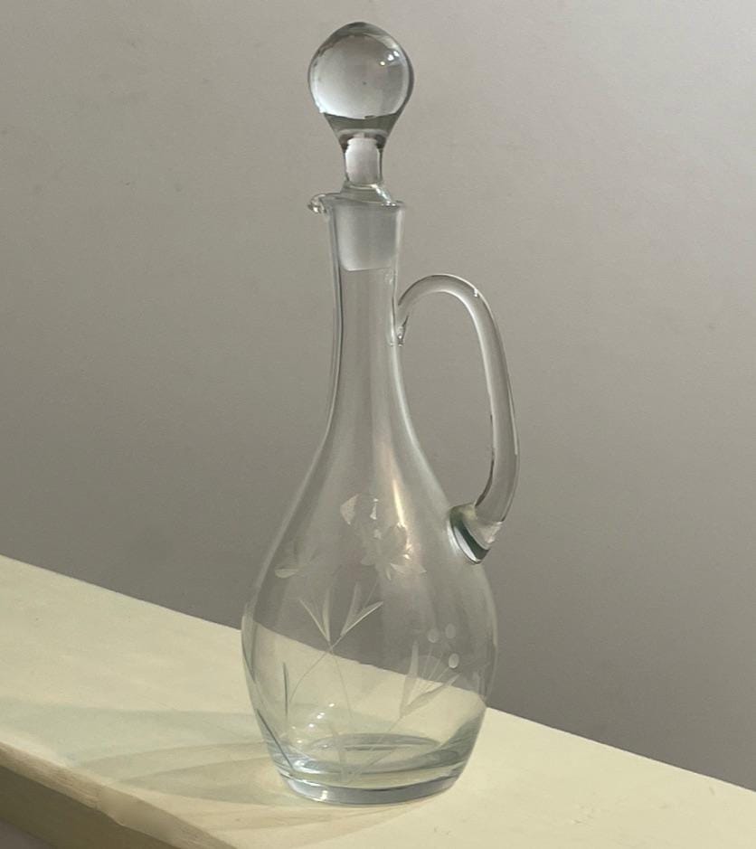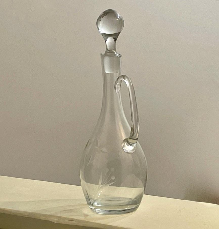 Tags/Keywords: Claret Jug, Wine Decanter, Wheel Cut Glass, Etched Glass, Floral Etching, Vintage Barware, Crystal Decanter, Glass Pitcher, Traditional Style, French Country Decor, Large Decanter, Glass Cork, Elegant Glassware.