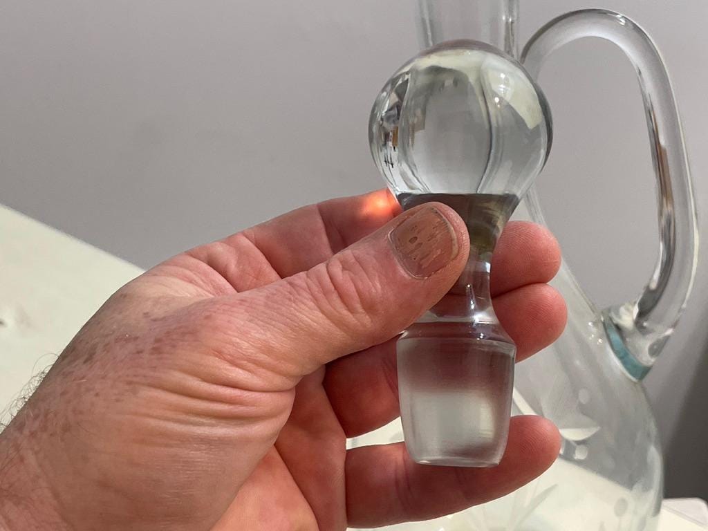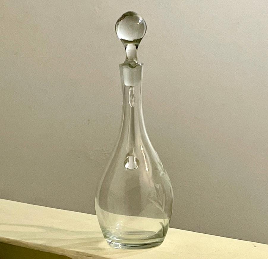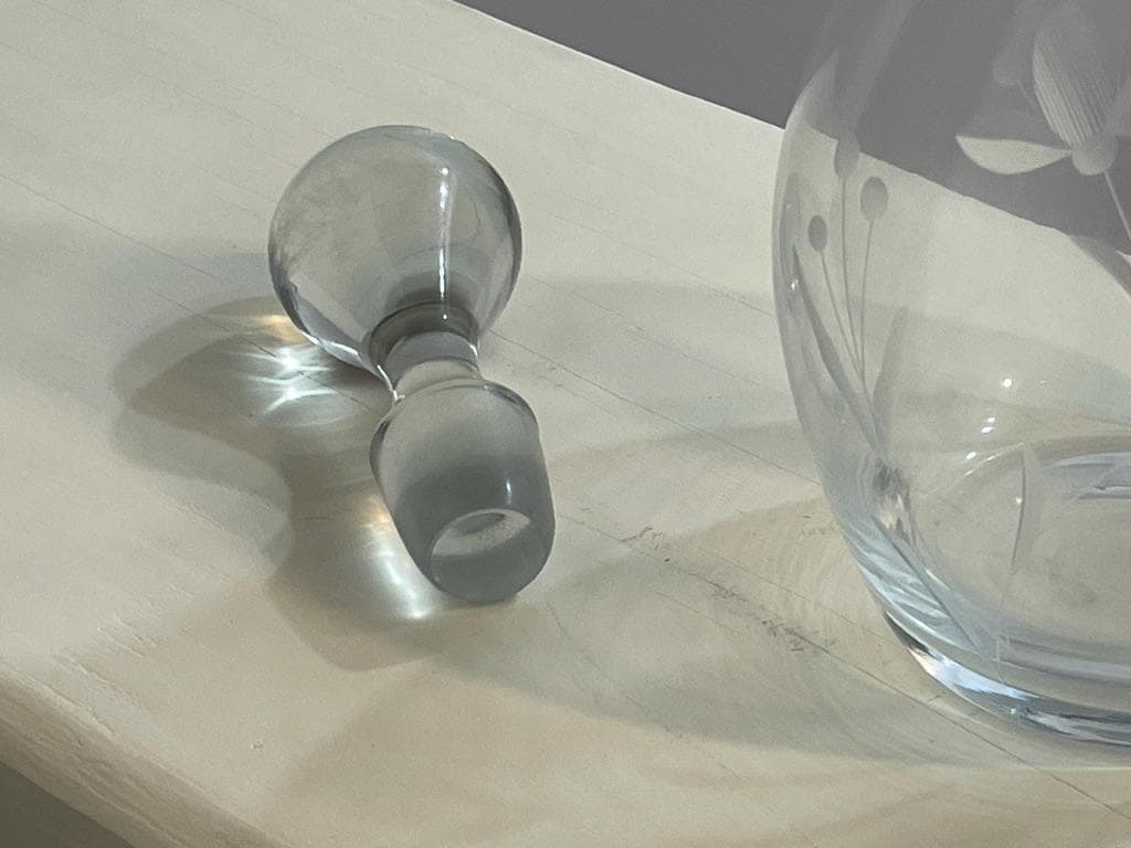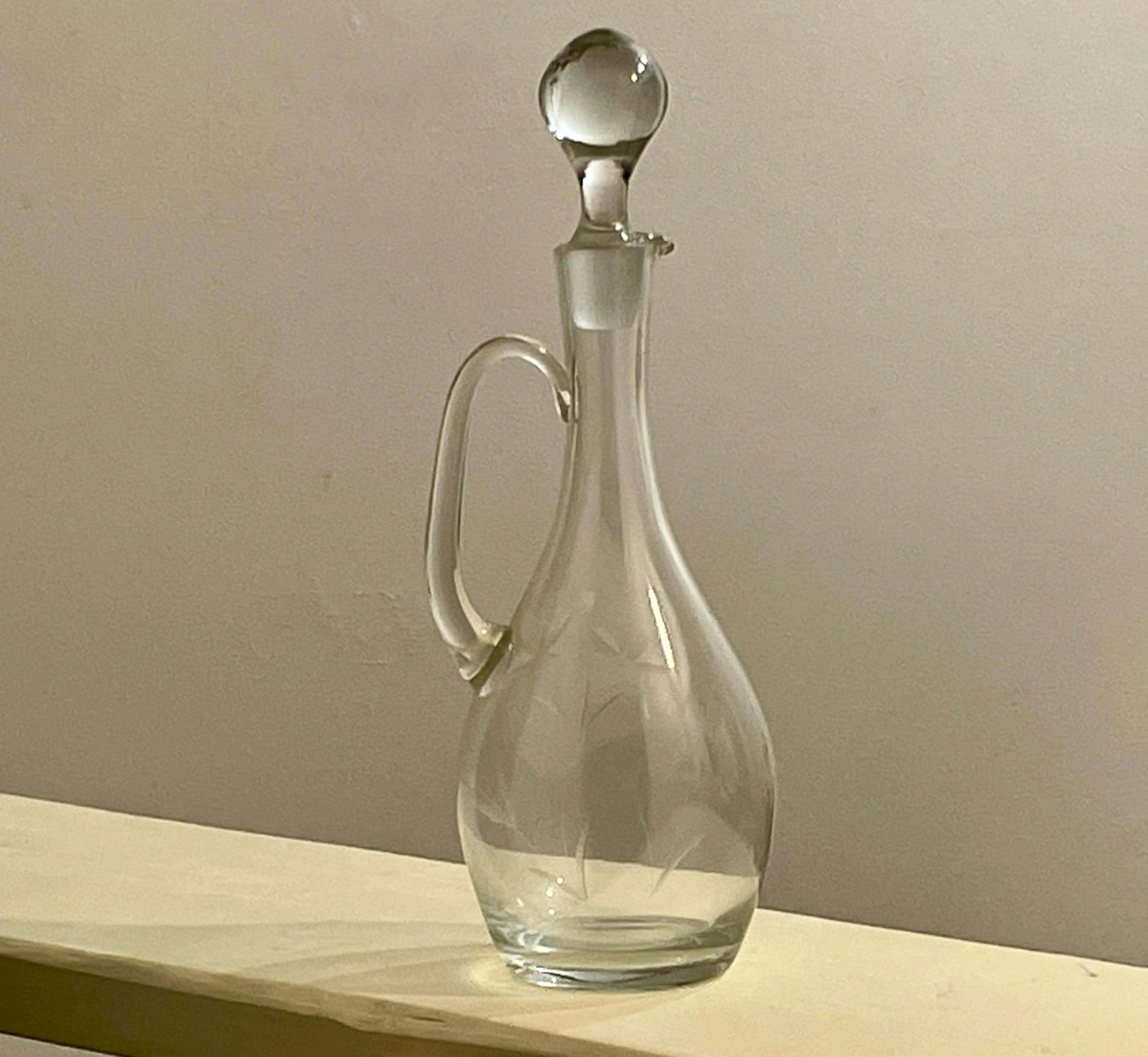 Tags/Keywords: Claret Jug, Wine Decanter, Wheel Cut Glass, Etched Glass, Floral Etching, Vintage Barware, Crystal Decanter, Glass Pitcher, Traditional Style, French Country Decor, Large Decanter, Glass Cork, Elegant Glassware.