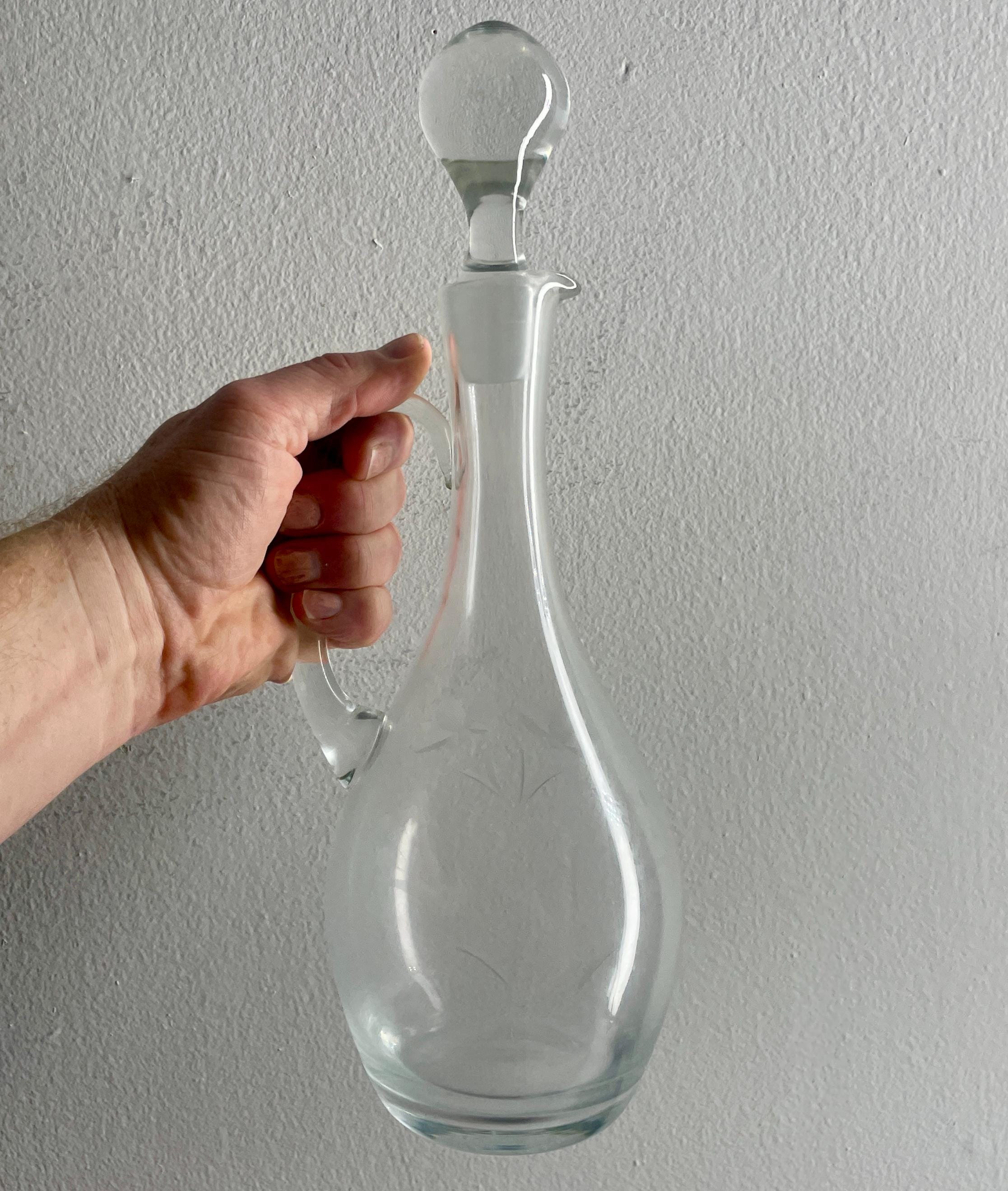 Standing at an impressive 15.5 inches tall, the decanter features a gracefully poured form, complete with a sturdy, applied glass handle and its original glass stopper (cork). The design is traditionally used for serving claret (Bordeaux wine) or decanting a fine wine, but its elegance makes it a versatile piece for a bar cart, dining room, or buffet display.