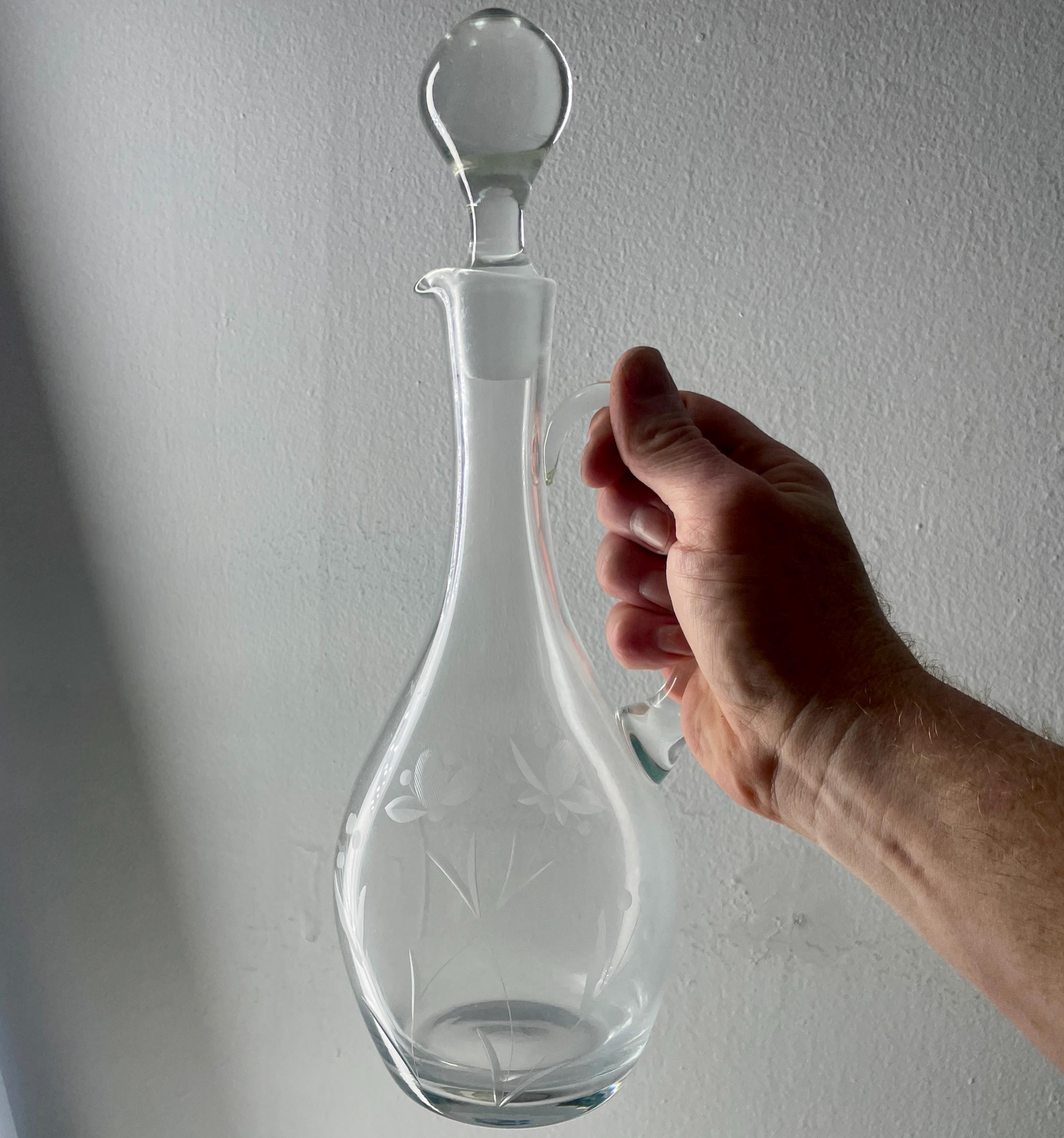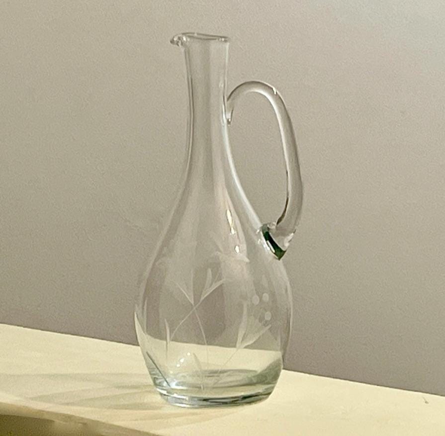 Presenting an elegant Vintage Claret Jug or wine decanter, a beautiful piece of hand-finished glassware that embodies classic European design. This pitcher is defined by its intricate wheel-cut floral design, a technique indicative of skilled artistry that creates a stunning texture and depth in the clear crystal-quality glass.