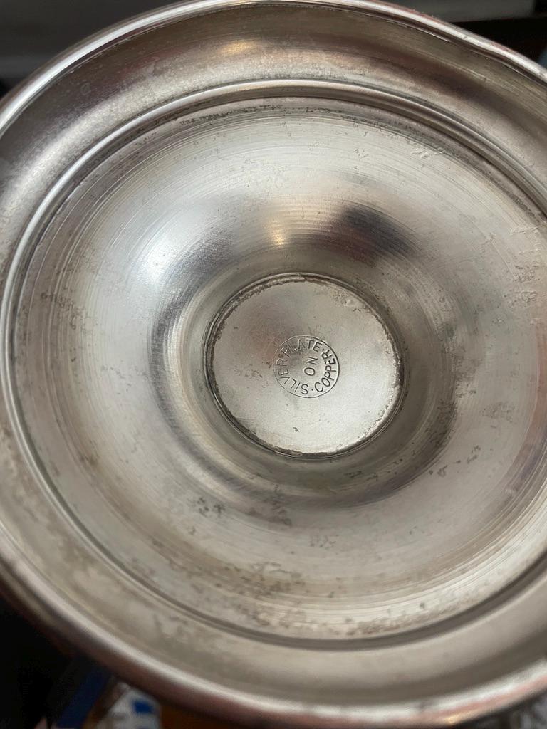 The silver-on-copper construction attests to its age (late 19th to early 20th century). The metal exhibits a rich, dark patina, with the subtle copper "bleeding" through the silverplate in heavily worn areas, which is highly sought after by collectors as authentic antique character.