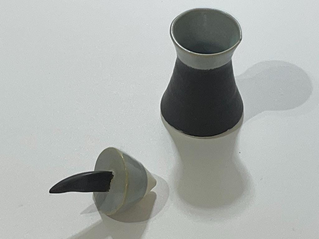 The container features a dramatic two-tone design: a strong, matte dark brown/chocolate glaze on the stable, conical body is contrasted by a smooth, light cool gray/celadon glaze coating the neck and interior.