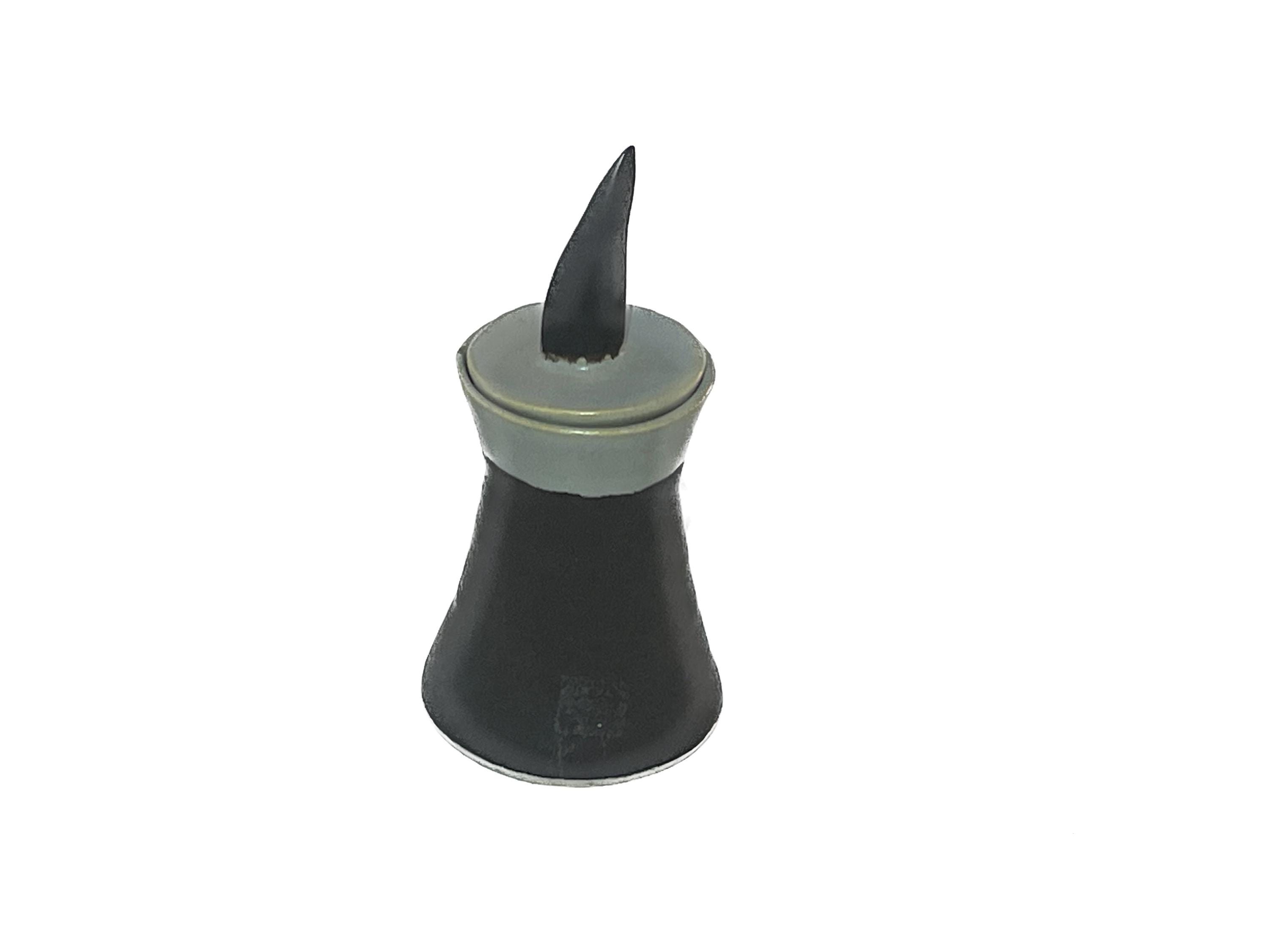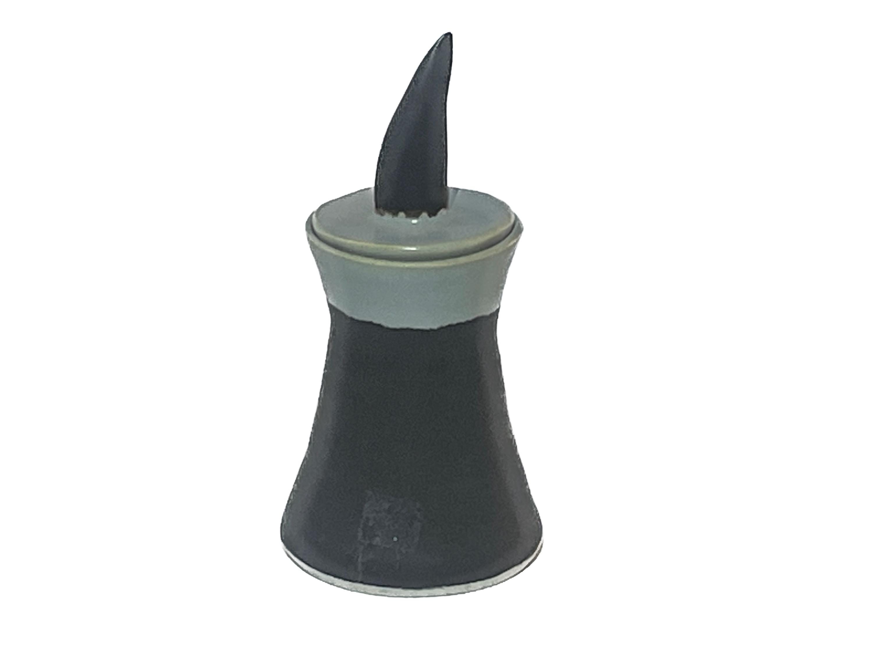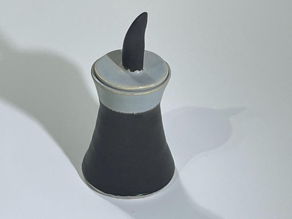The sculptural quality is enhanced by the unique stopper, which features a prominent, dark, conical handle—a clean, modernist touch that transforms the simple container into an art object.