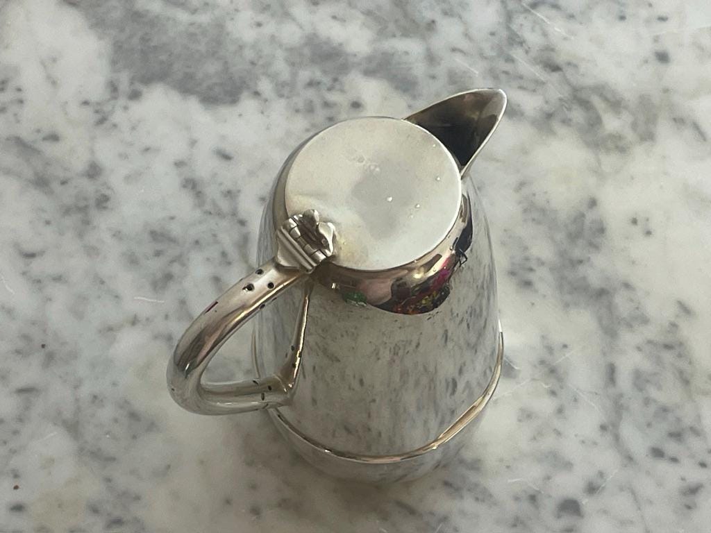 Condition: This vintage pitcher is in good to fair vintage condition]. The silver plate is bright and reflective on the top section, showing wear, patina, and potential tarnish on the lower base consistent with its age and history. Please note this natural aging adds to its vintage character.